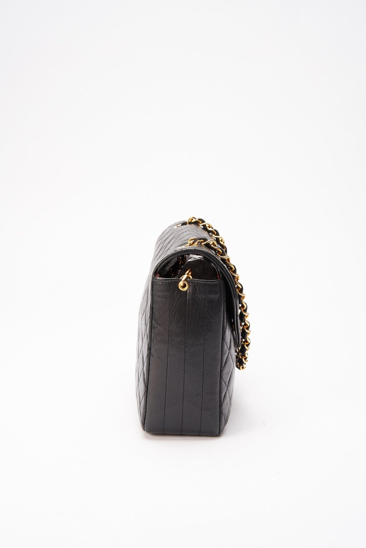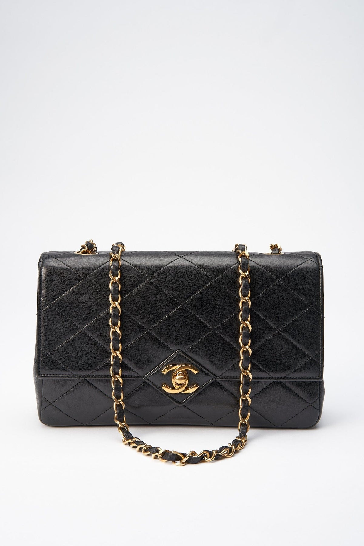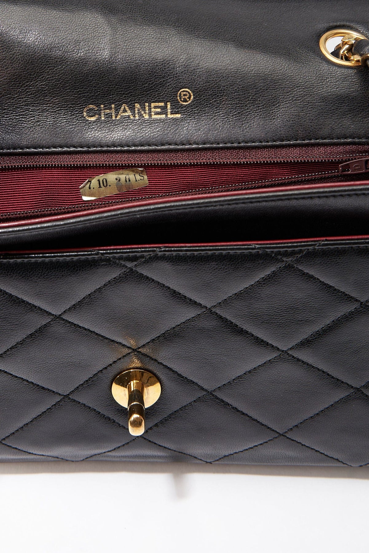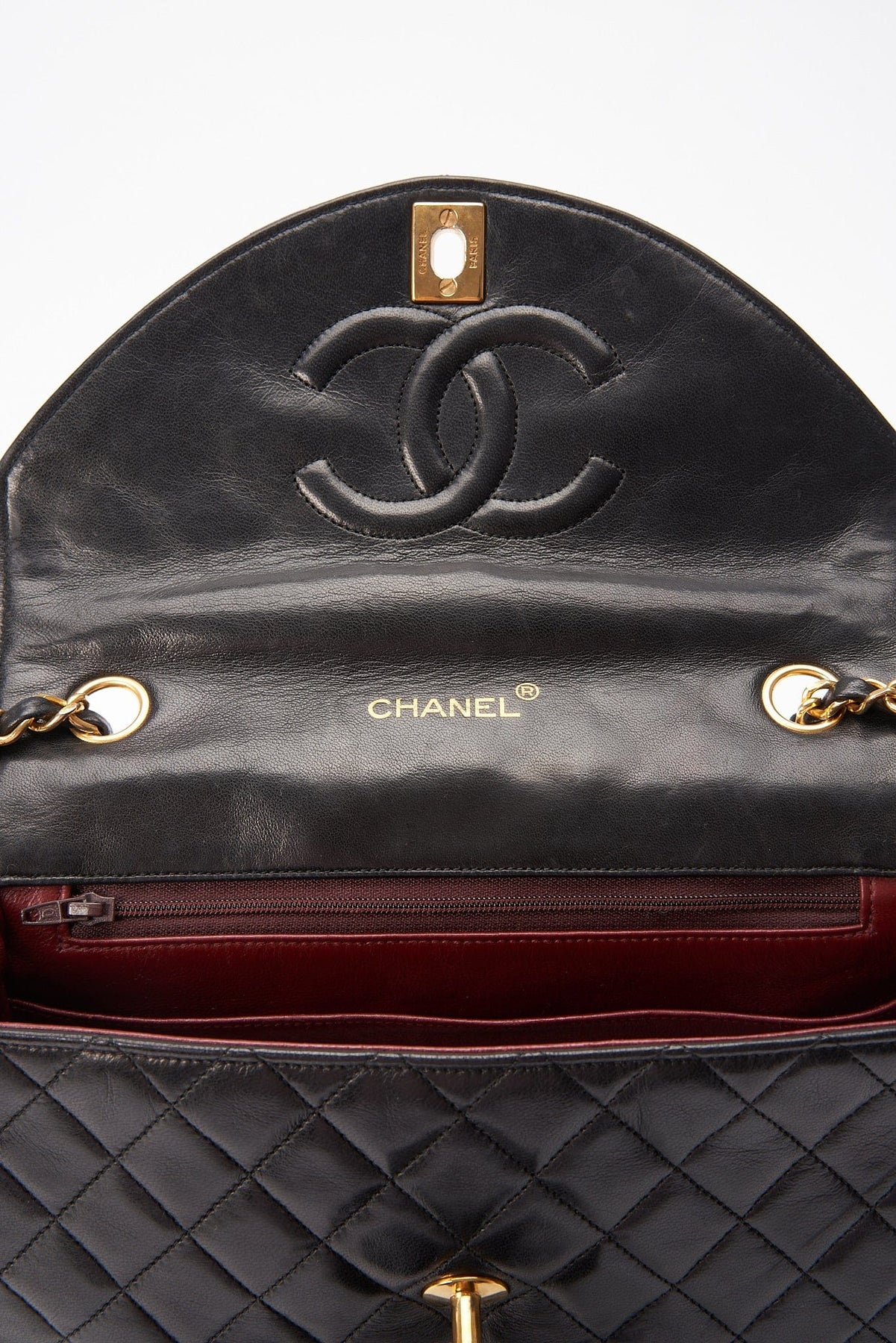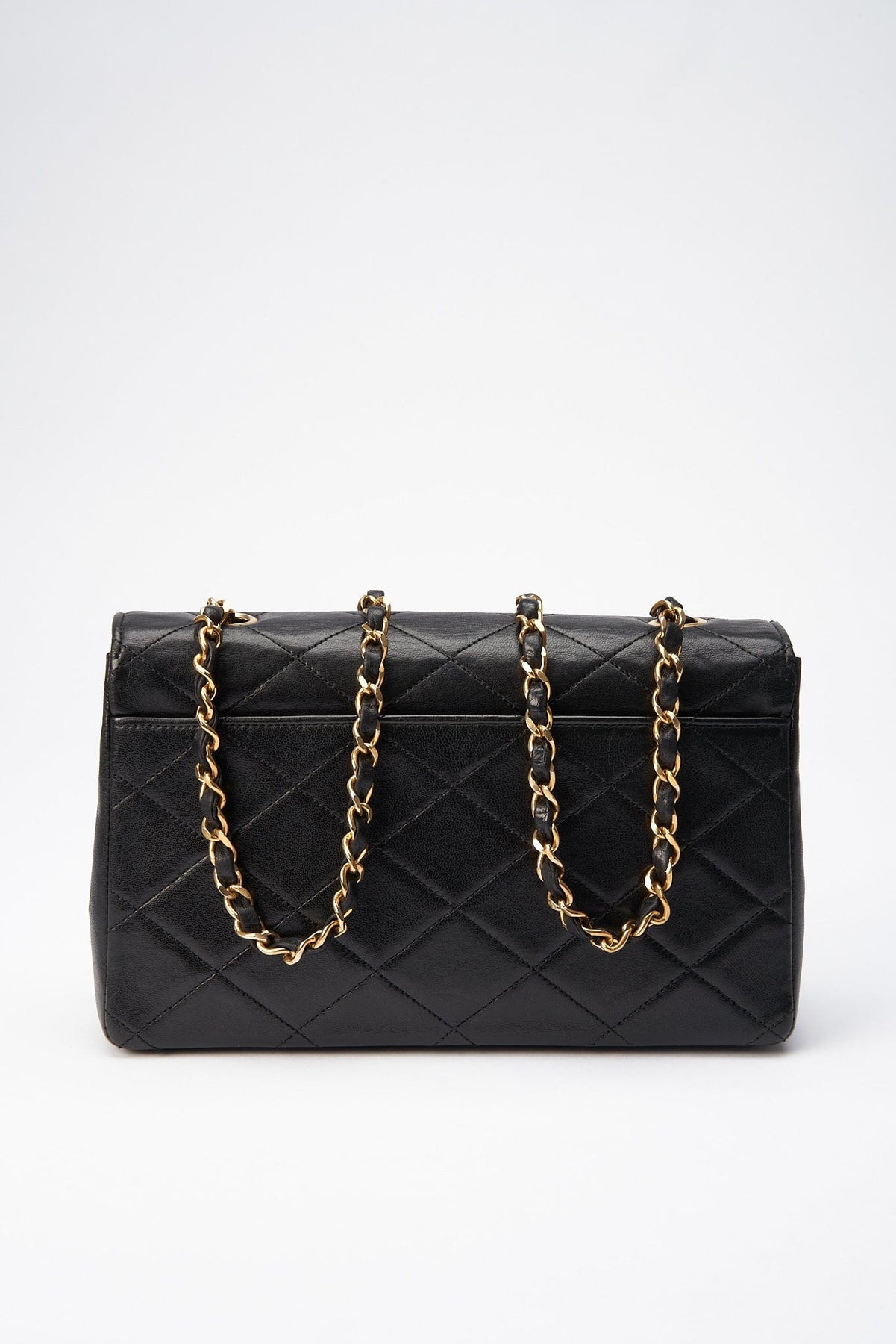 Regular price $1,990.00 Sale price $420.00 Save $1,570.00This vintage Chanel Single Flap bag is crafted with black quilted lambskin leather with 24k gold-plated hardware and a double leather-trimmed chain-link shoulder strap.