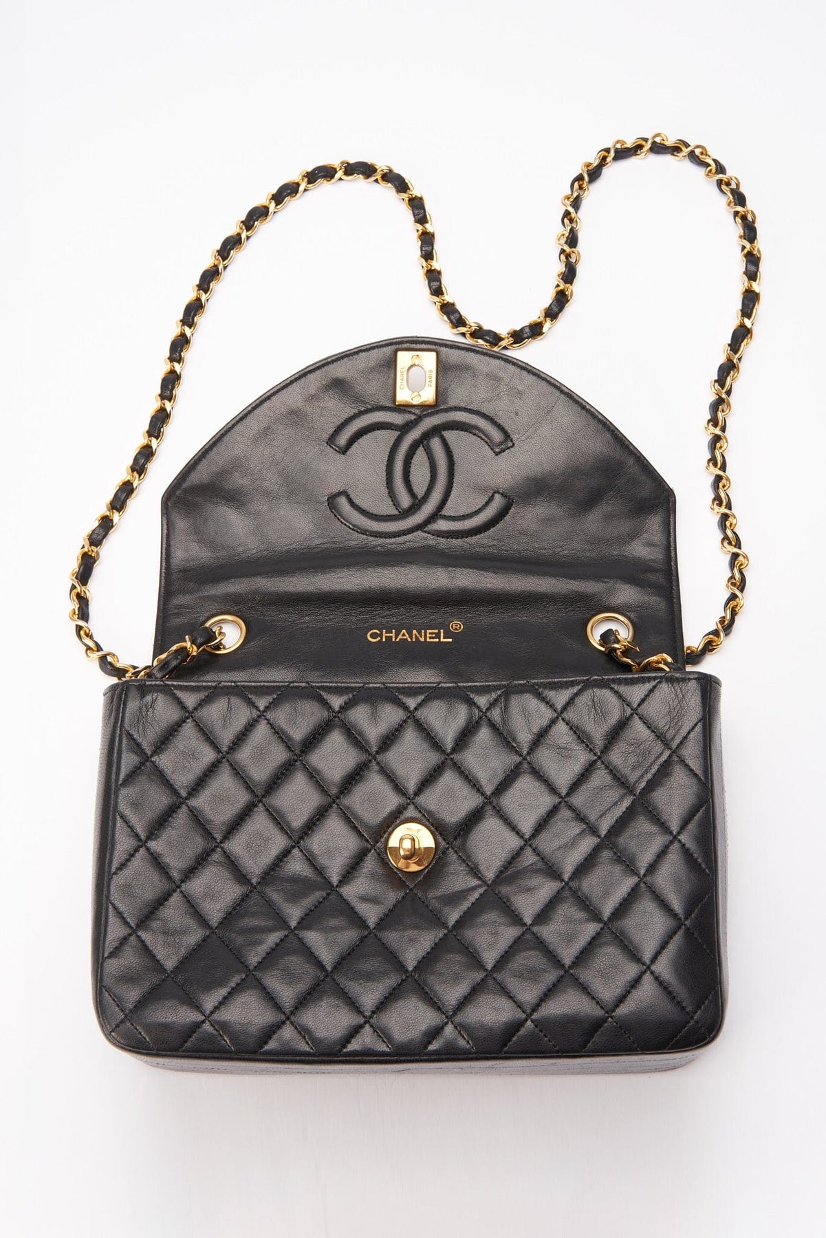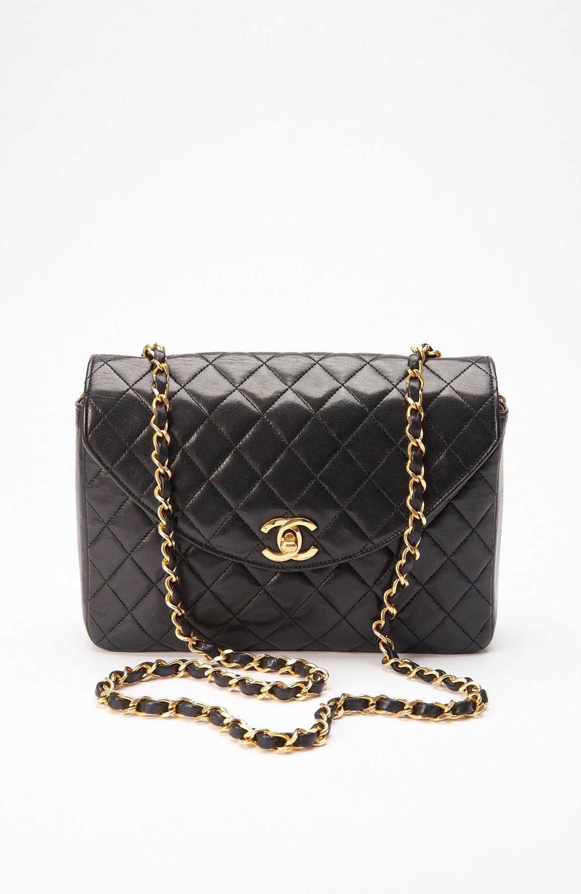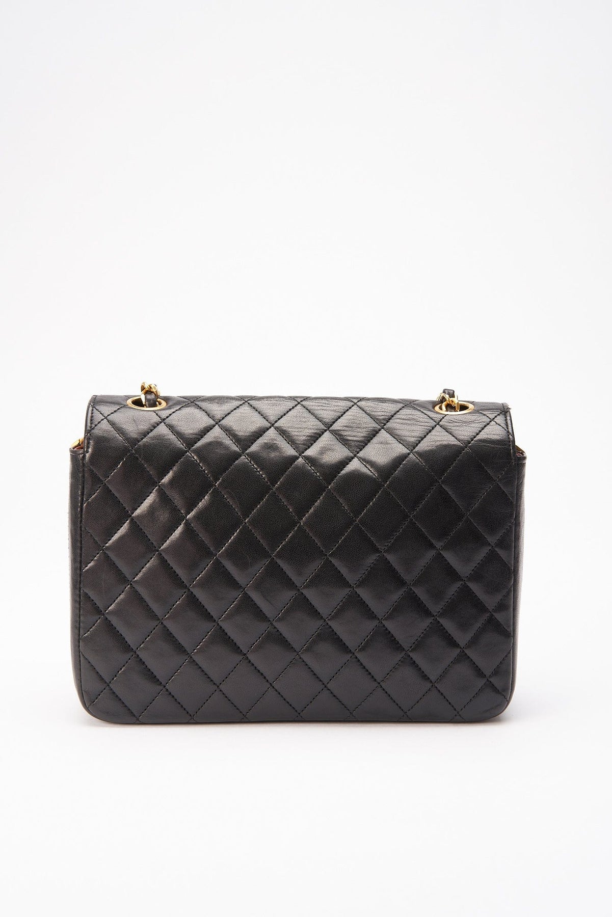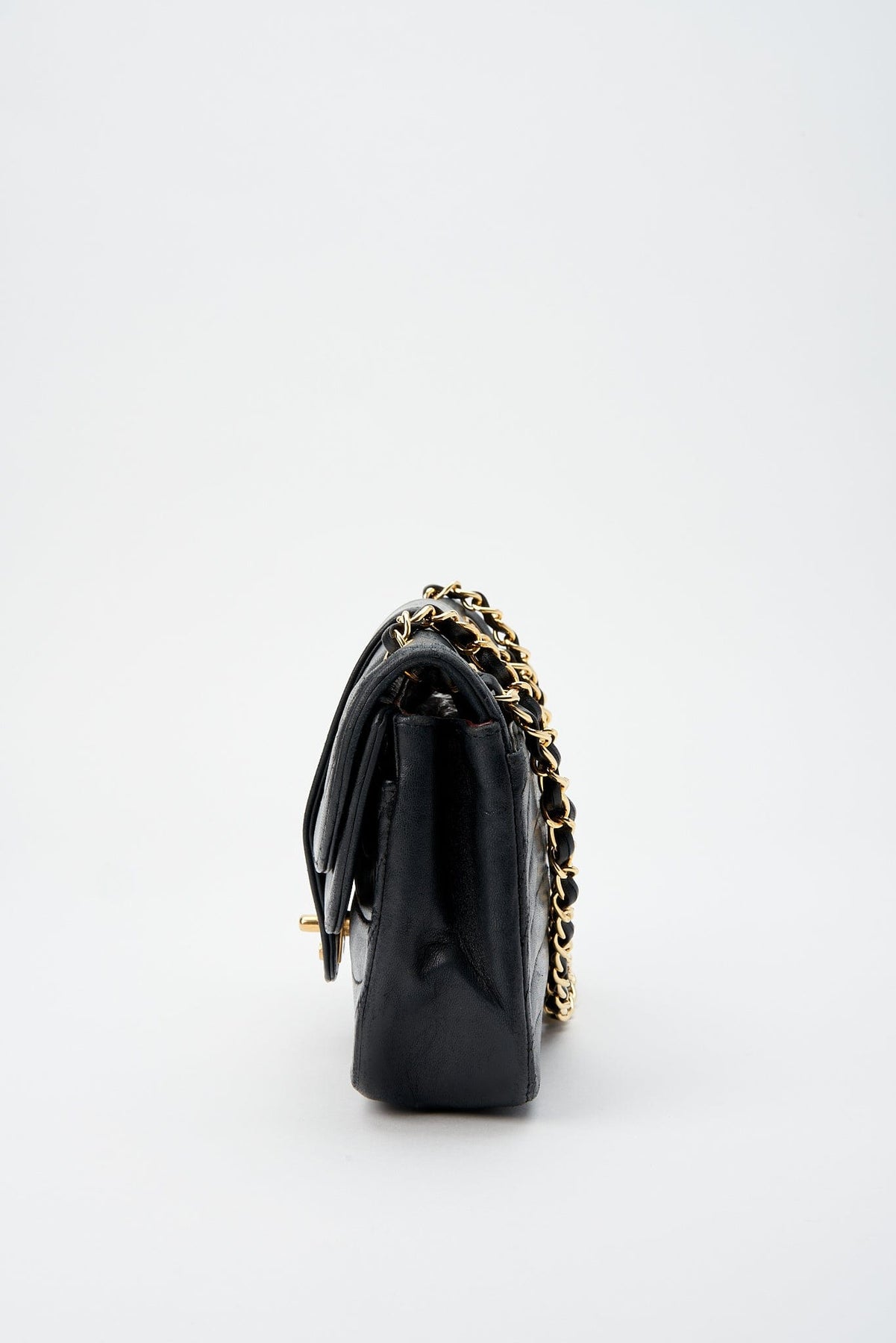 Regular price $1,990.00 Sale price $420.00 Save $1,570.00This vintage Chanel Single Flap bag is crafted with black quilted lambskin leather with 24k gold-plated hardware and a double leather-trimmed chain-link shoulder strap.