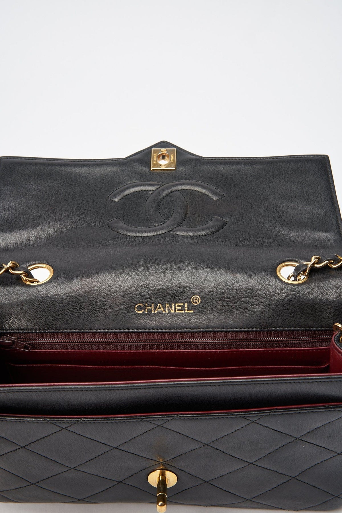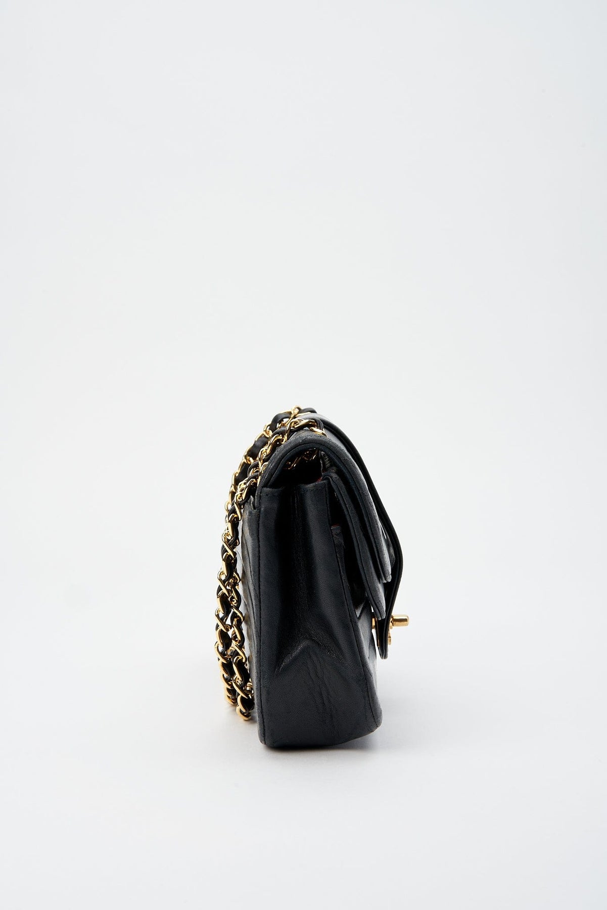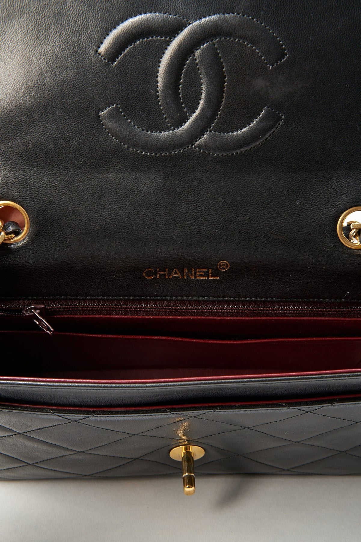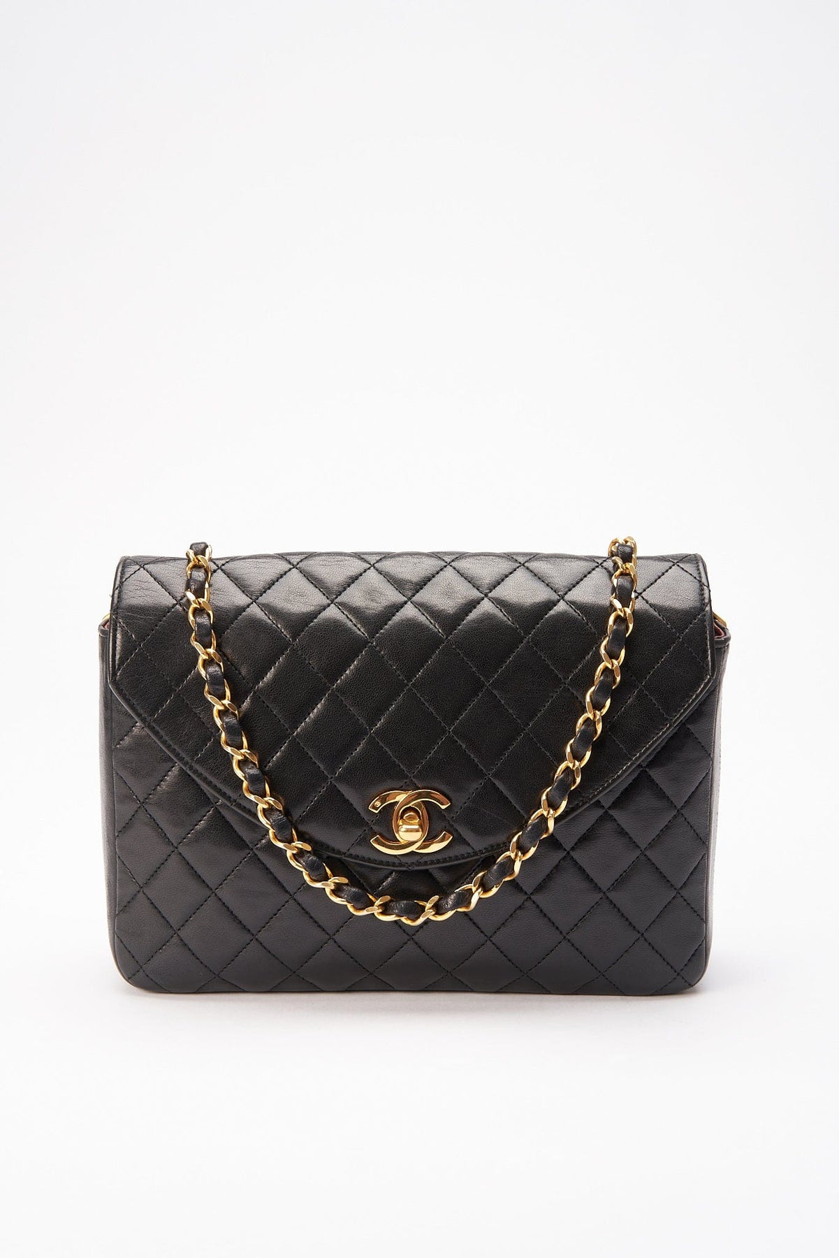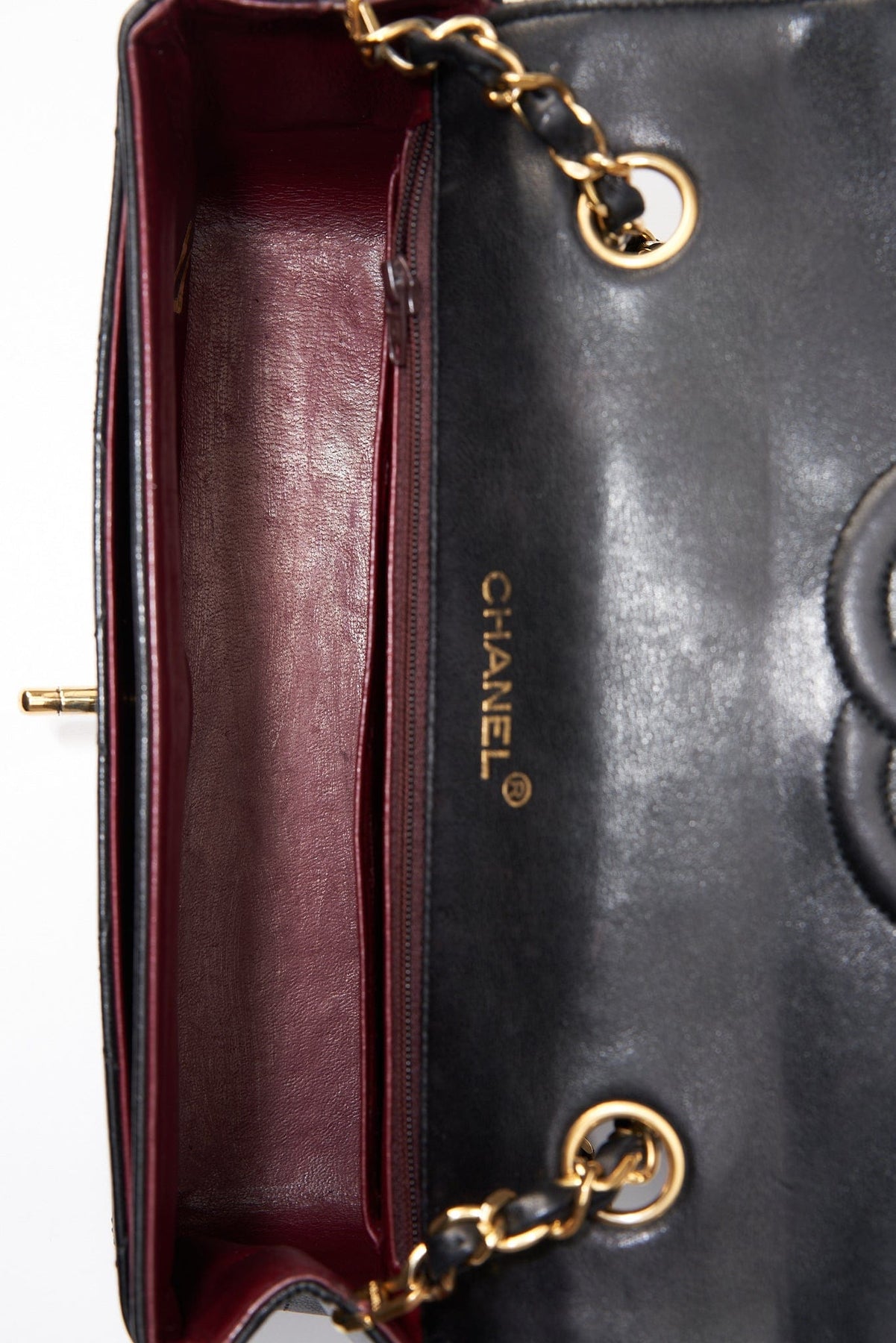 Regular price $1,990.00 Sale price $420.00 Save $1,570.00This vintage Chanel Single Flap bag is crafted with black quilted lambskin leather with 24k gold-plated hardware and a double leather-trimmed chain-link shoulder strap.