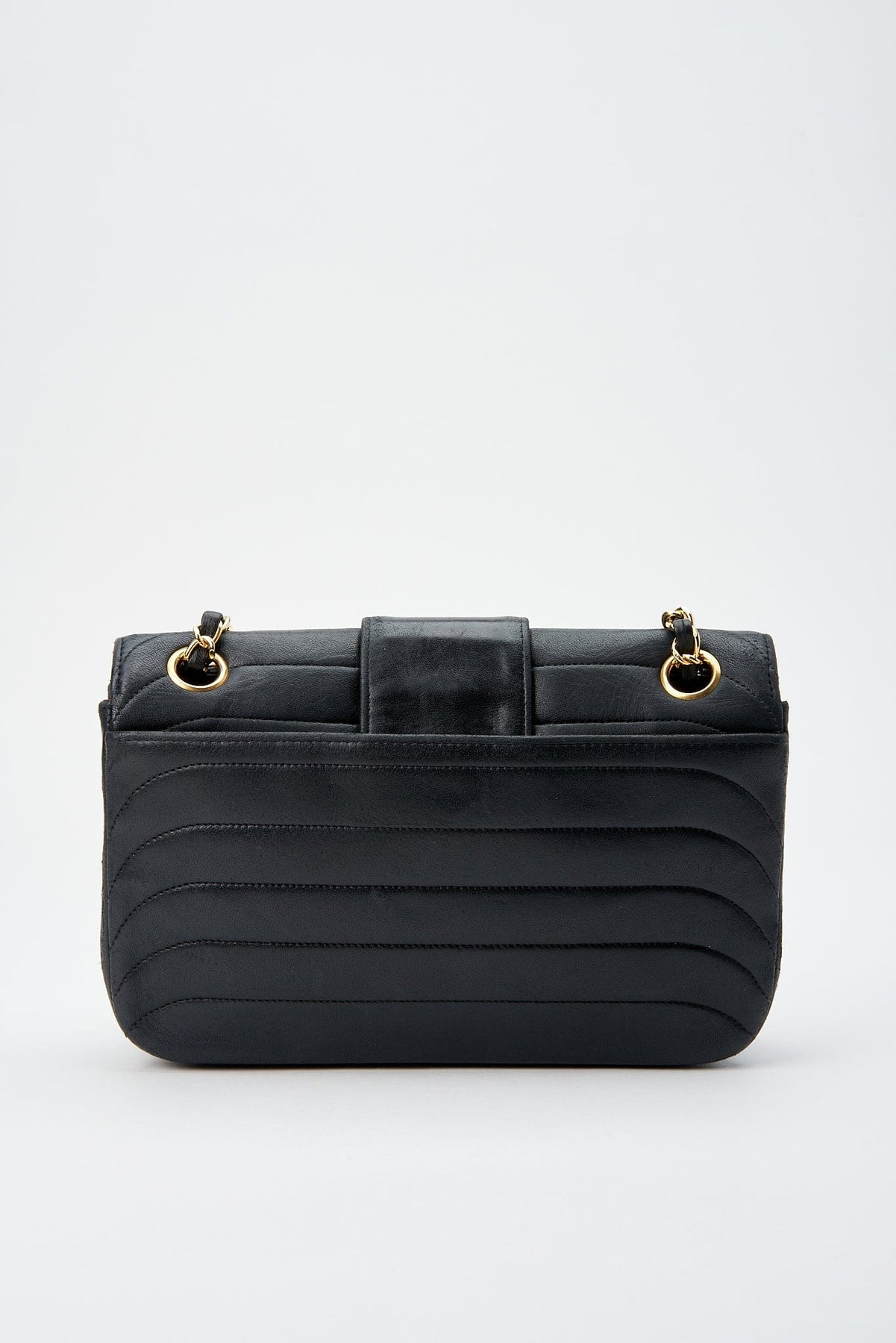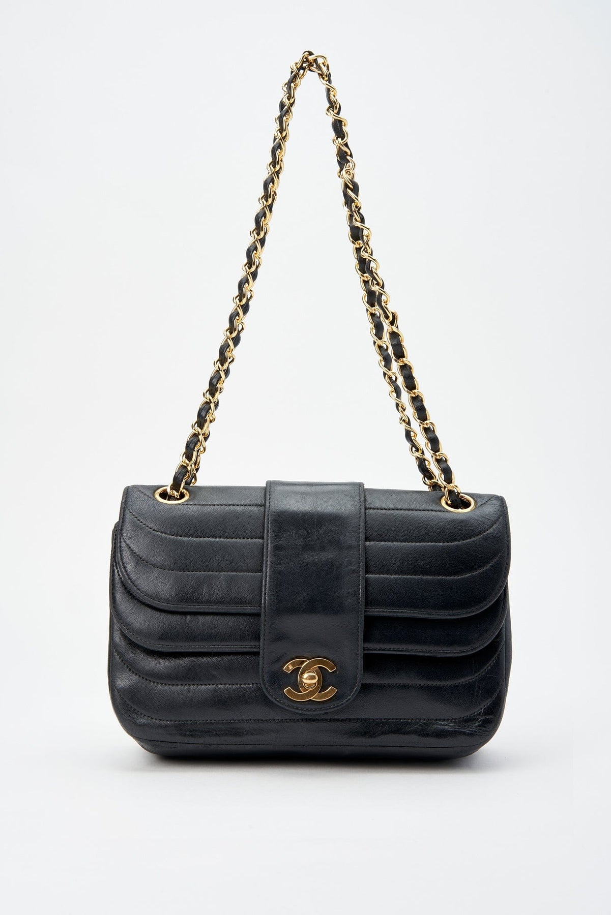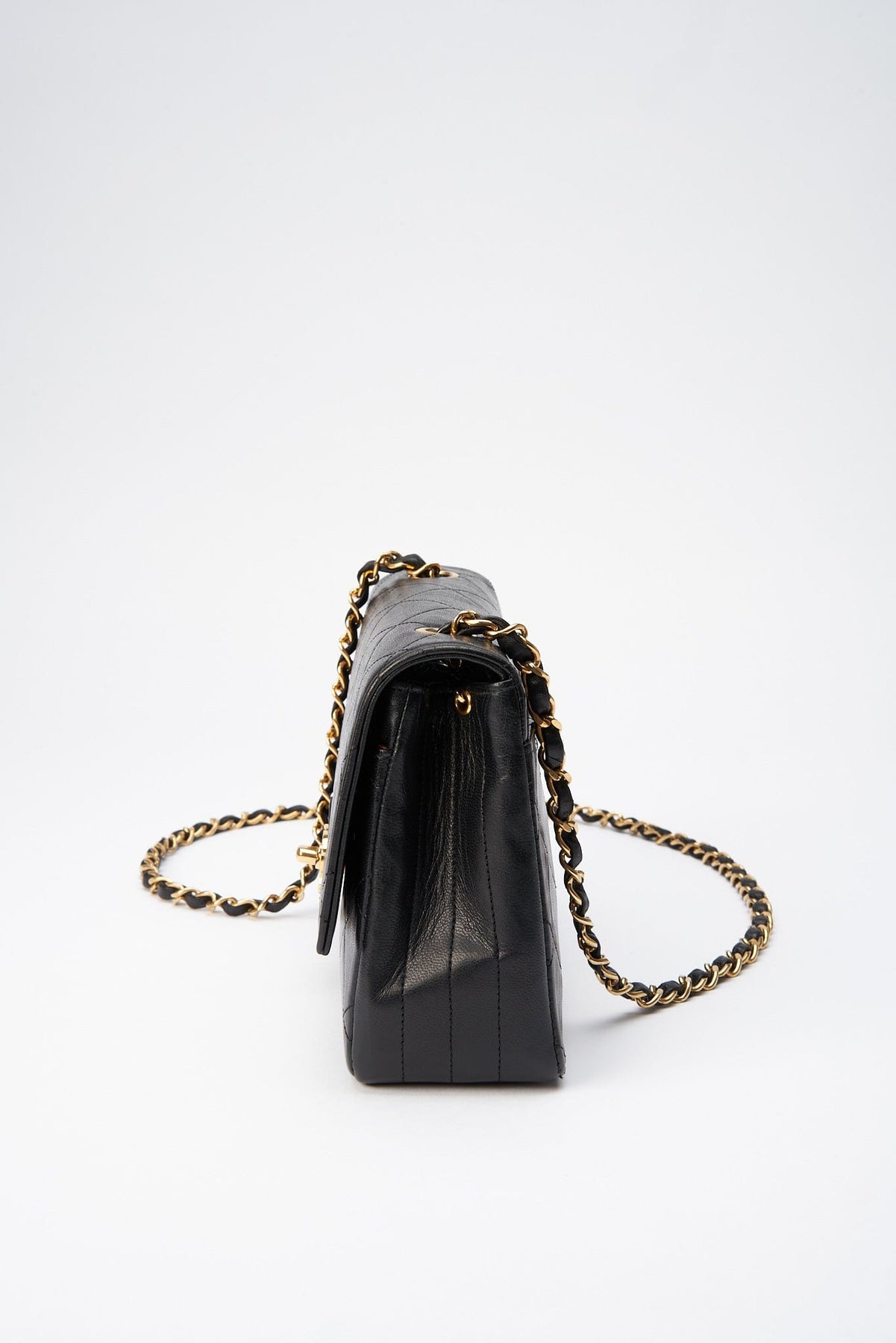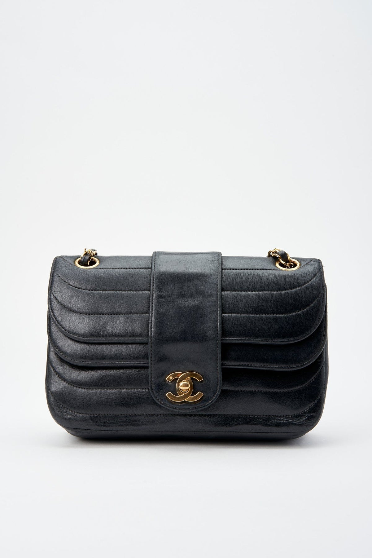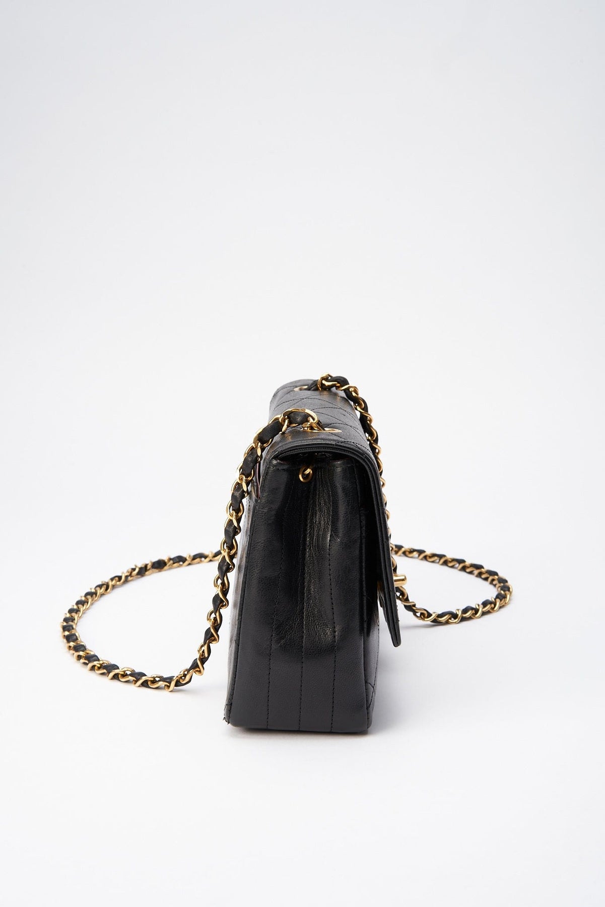 Regular price $1,990.00 Sale price $420.00 Save $1,570.00This vintage Chanel Single Flap bag is crafted with black quilted lambskin leather with 24k gold-plated hardware and a double leather-trimmed chain-link shoulder strap.