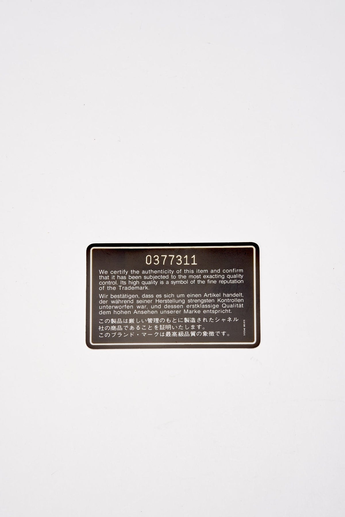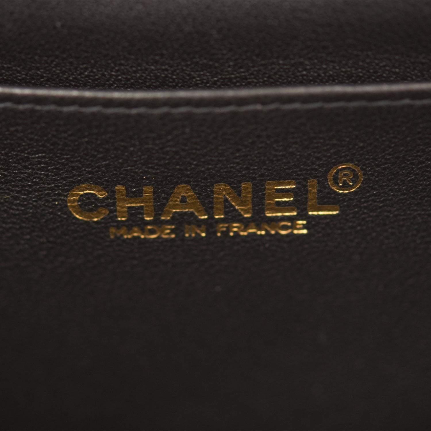 The serial number on the sticker tells us the bag was made between 1986 and 1988. This bag is in very good vintage condition with some minor signs of use. The hallmark on the CC turn lock confirms the gold hardware is plated in 24K gold, a real collectors item. Before 2008, Chanel Classic Flaps with gold coloured hardware (chains, clasps, grommets, and CC turn locks) were all plated in real 24K gold.