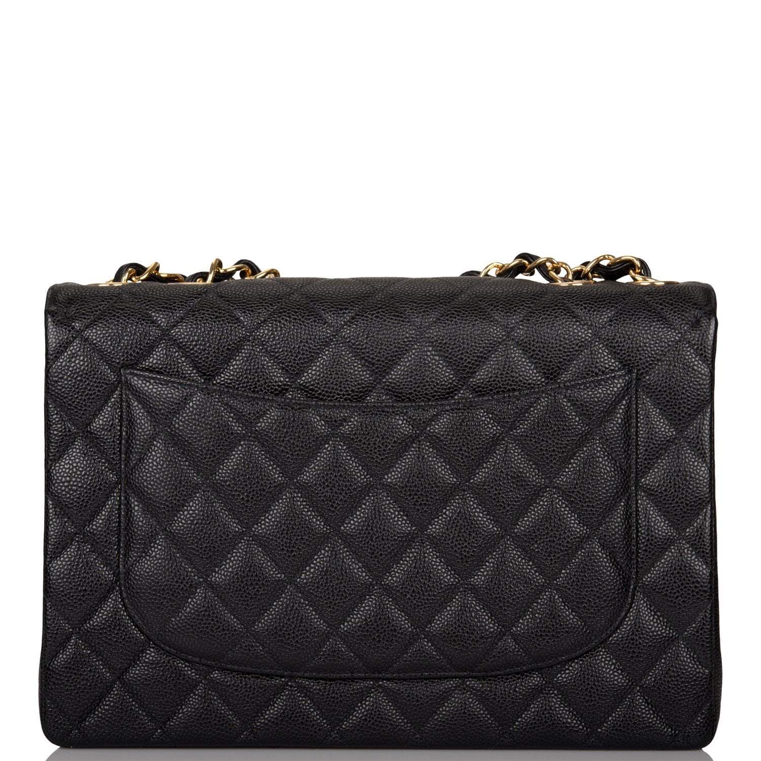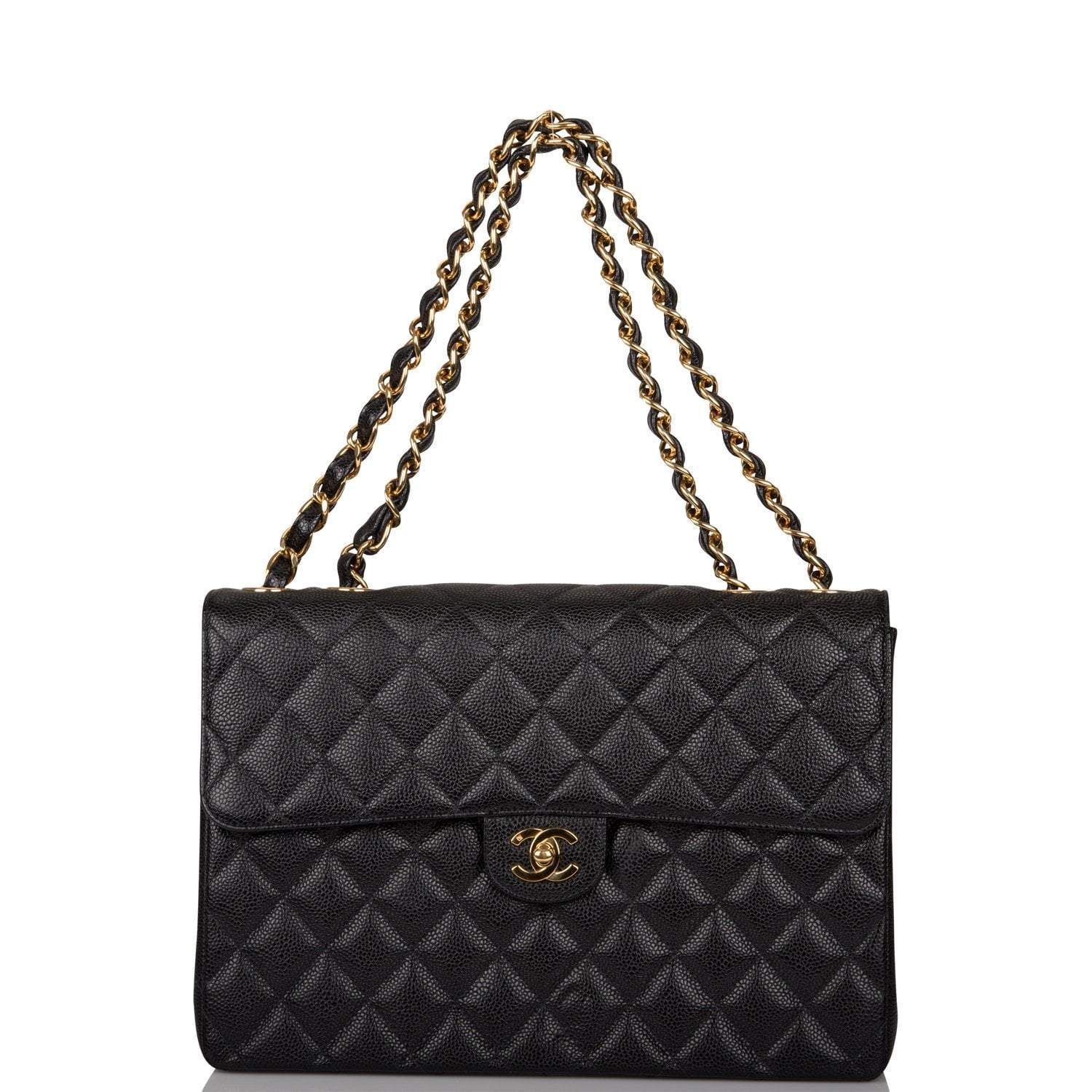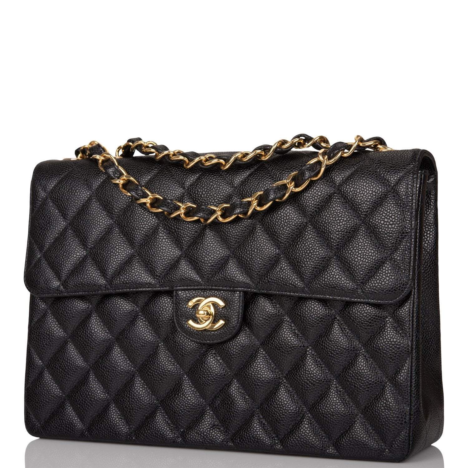 Regular price $1,048.56 Sale price $629.14 Save $419.42This Vintage Jumbo single flap bag is of black caviar leather with gold hardware and features front flap with signature CC turn lock closure, half moon back pocket, and adjustable interwoven gold chain link and black leather shoulder strap.