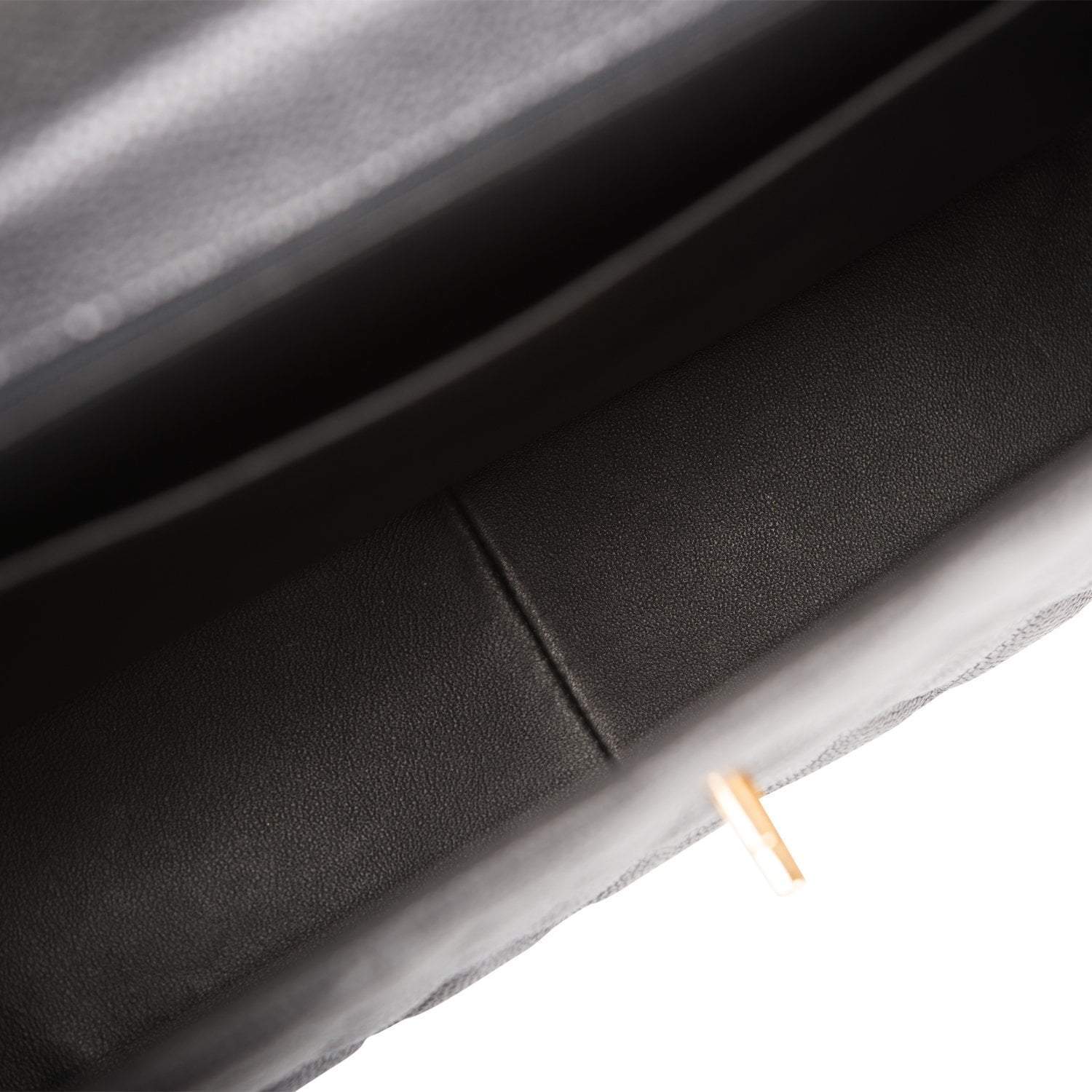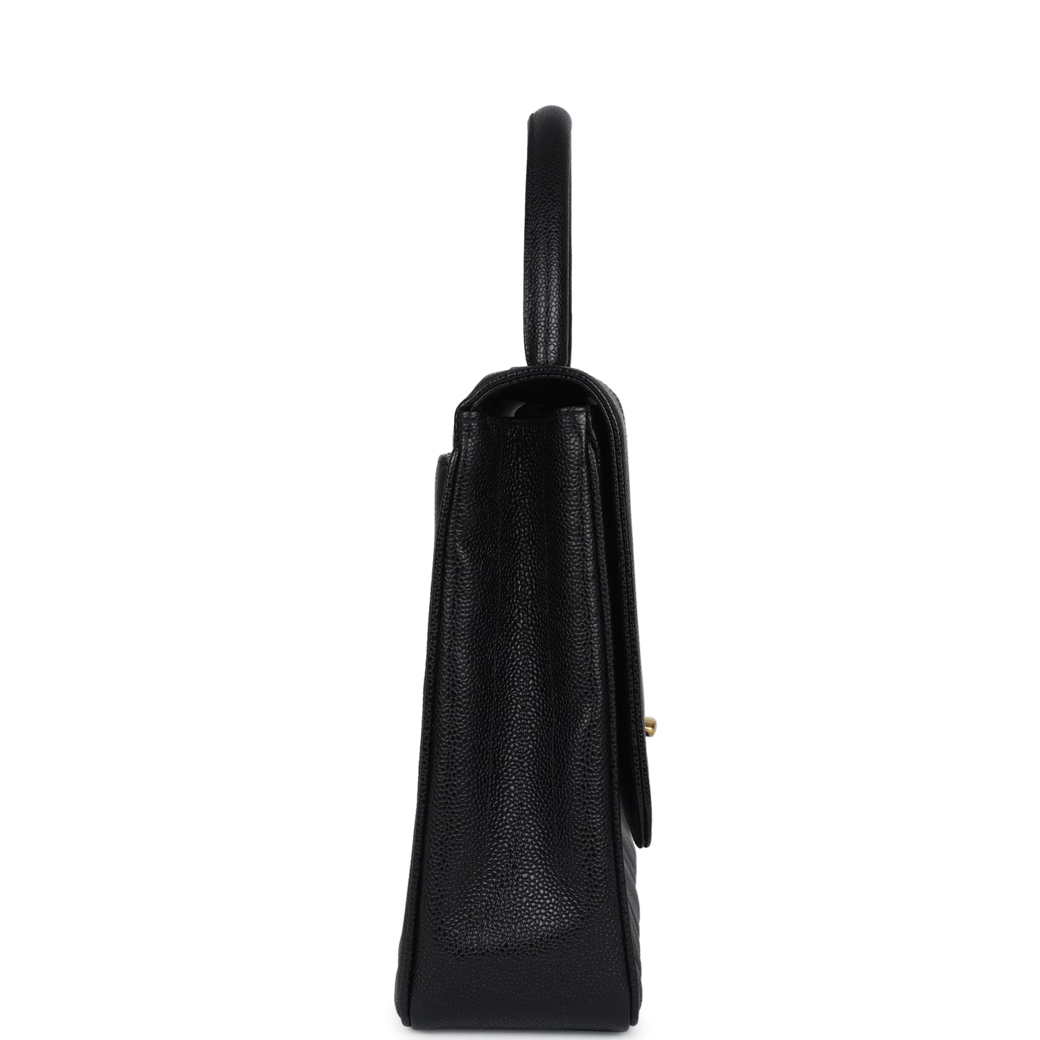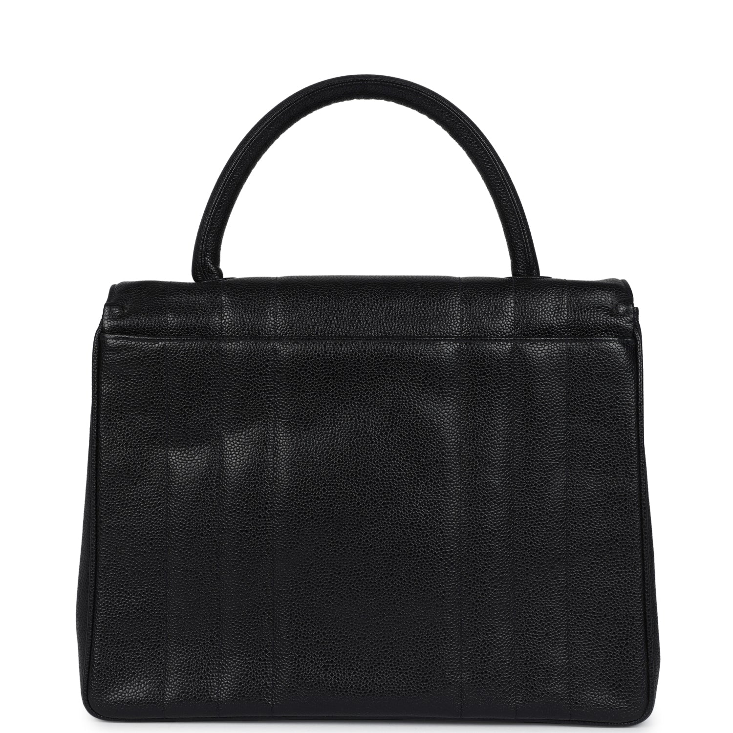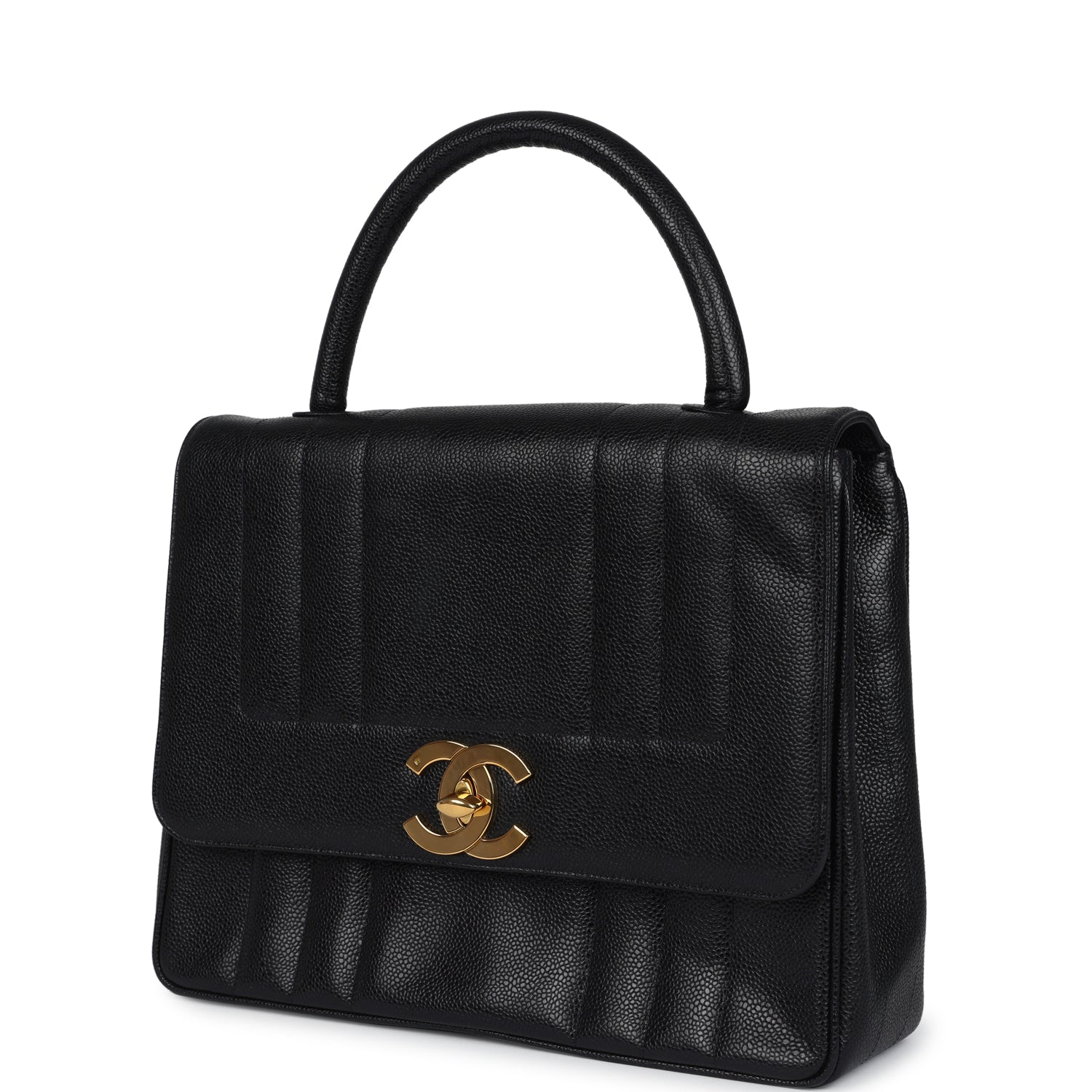 Regular price $16,850.00 Sale price $1,330.00 Save $15,520.00This New Chanel Vertical Stripe Kelly Top Handle Flap Bag is in black caviar leather with gold hardware, featuring vertical quilted leather, the signature CC turnlock closure with front flap, a back pocket and a black rolled top handle.