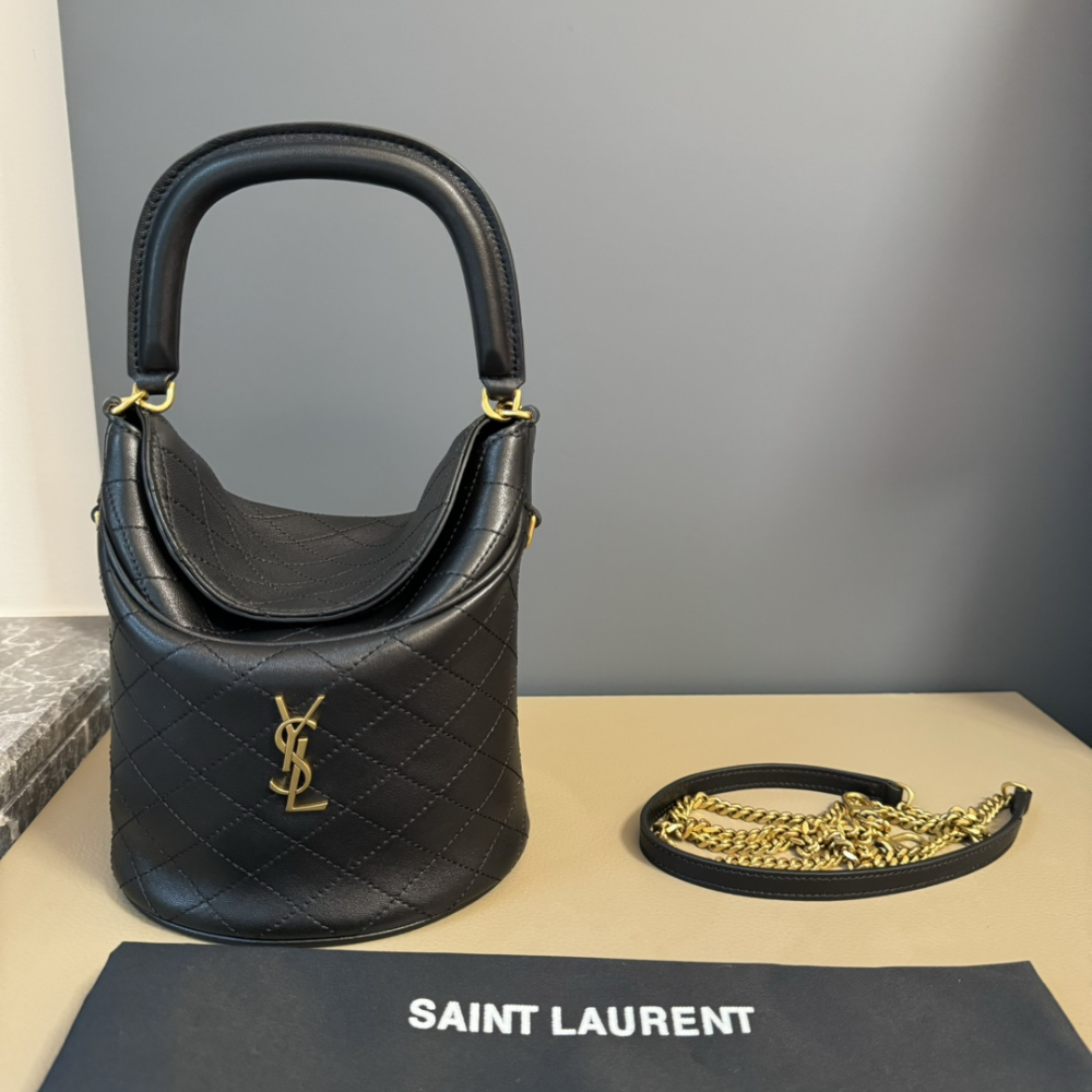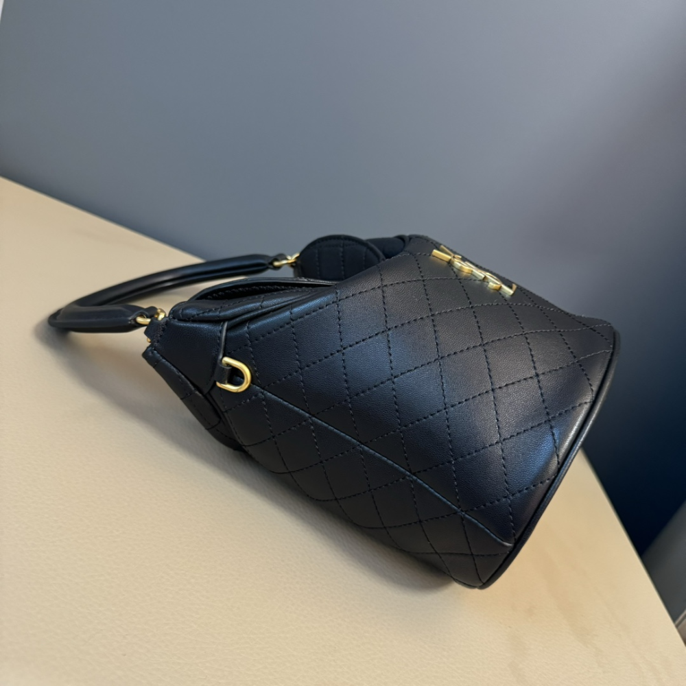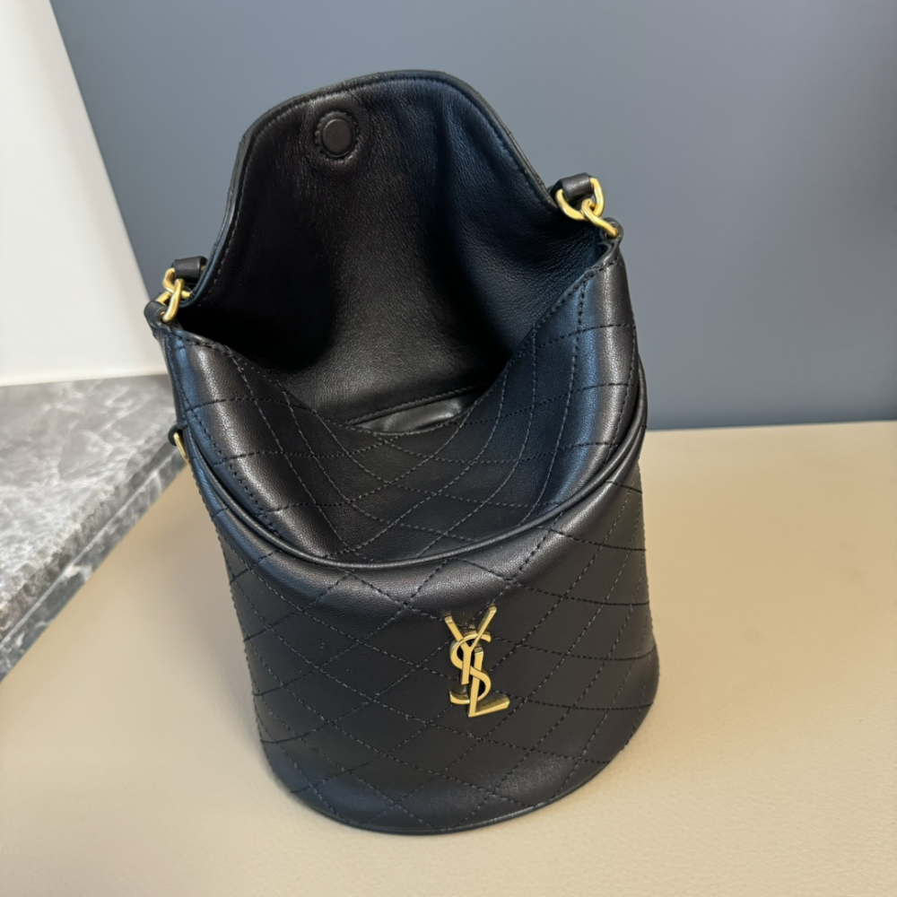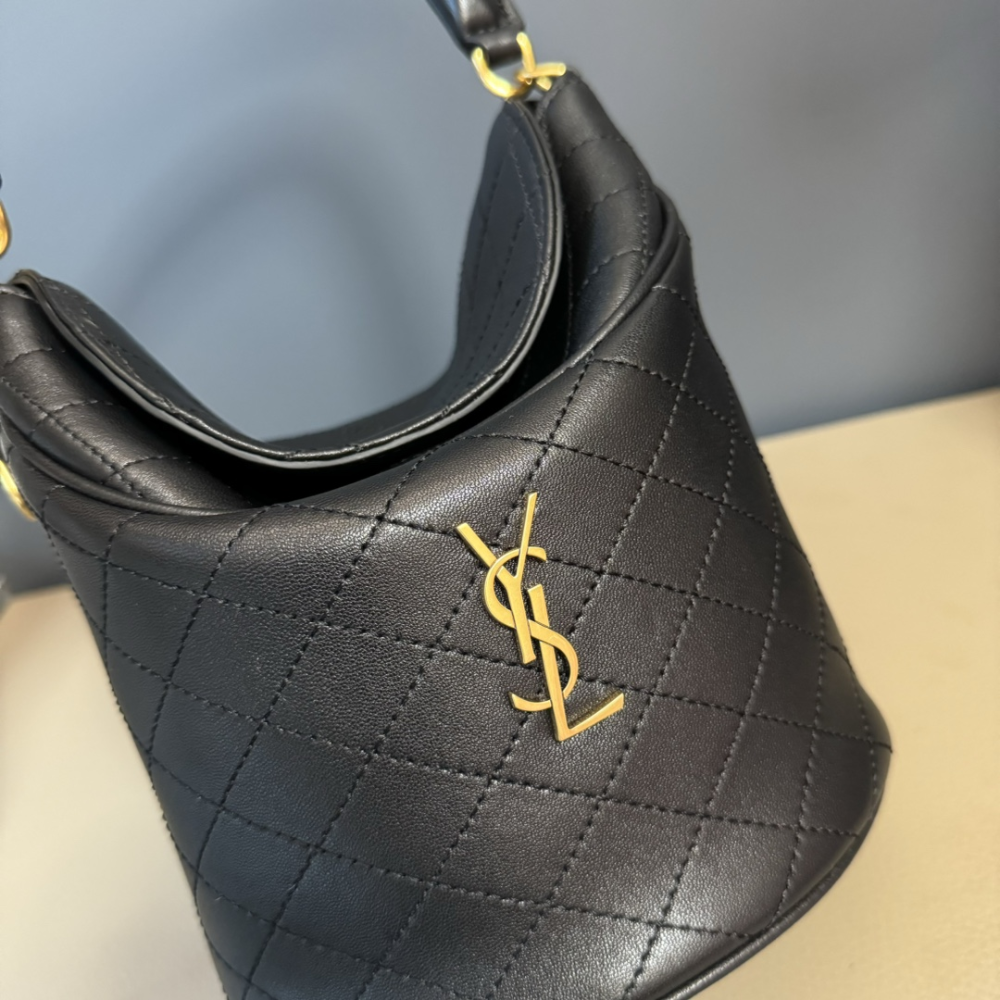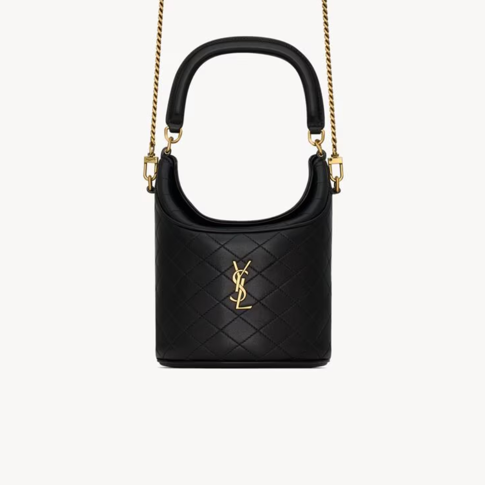 Bucket bag with a flap top, embellished with the iconic Cassandre and diamond-quilted overstitching. This versatile accessory features a rotating leather top handle and a detachable leather-and-chain strap, allowing for shoulder or crossbody carry.