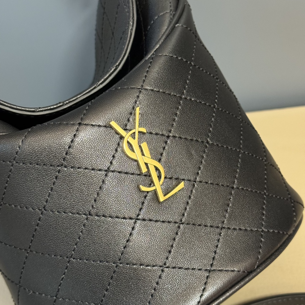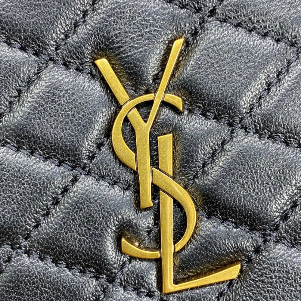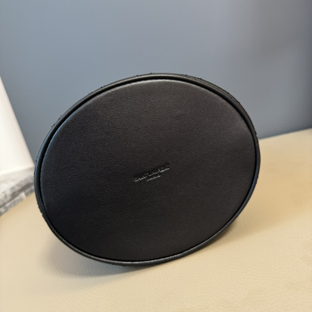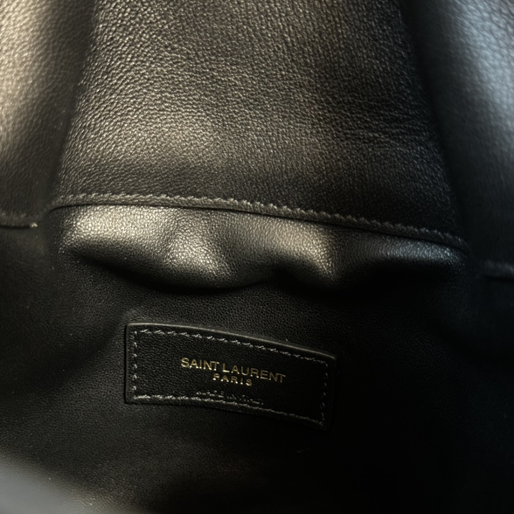 Bucket bag with a flap top, embellished with the iconic Cassandre and diamond-quilted overstitching. This versatile accessory features a rotating leather top handle and a detachable leather-and-chain strap, allowing for shoulder or crossbody carry.