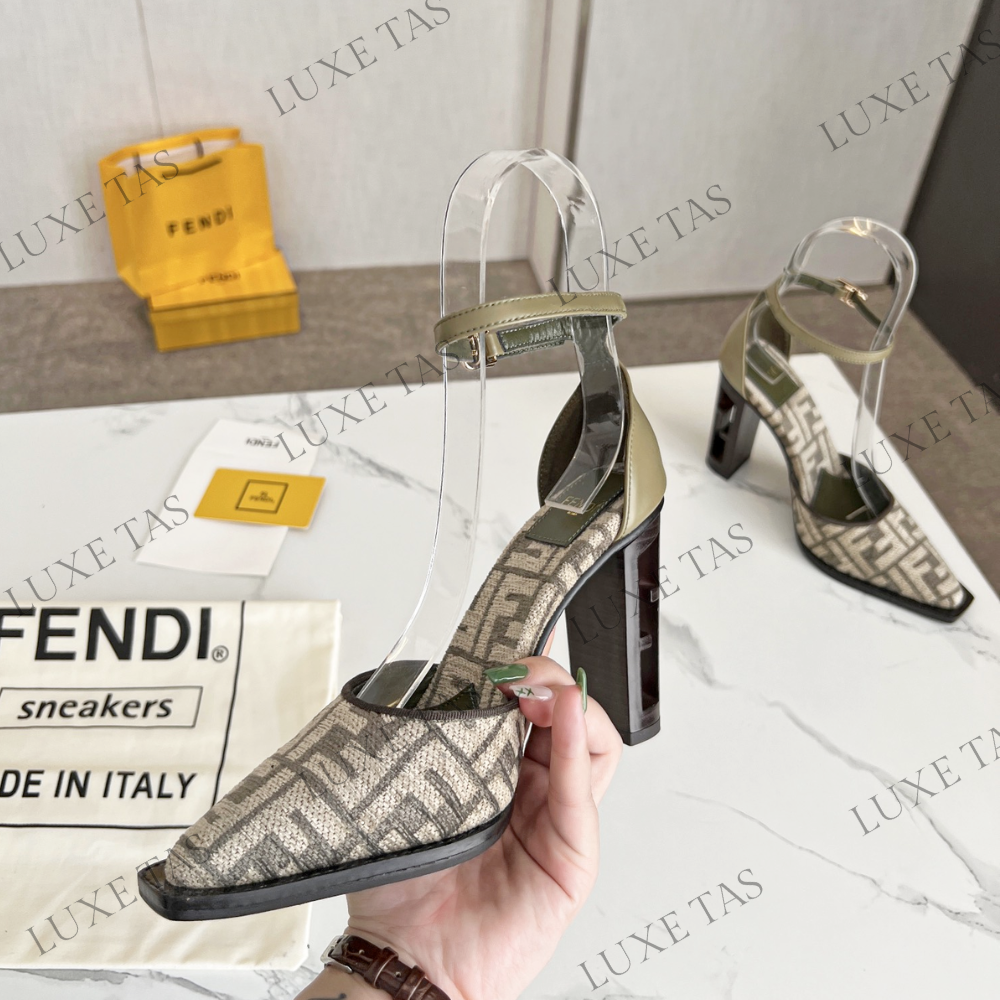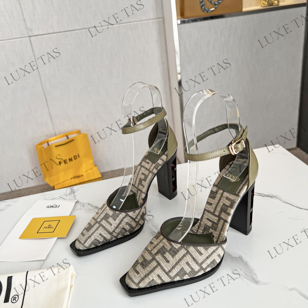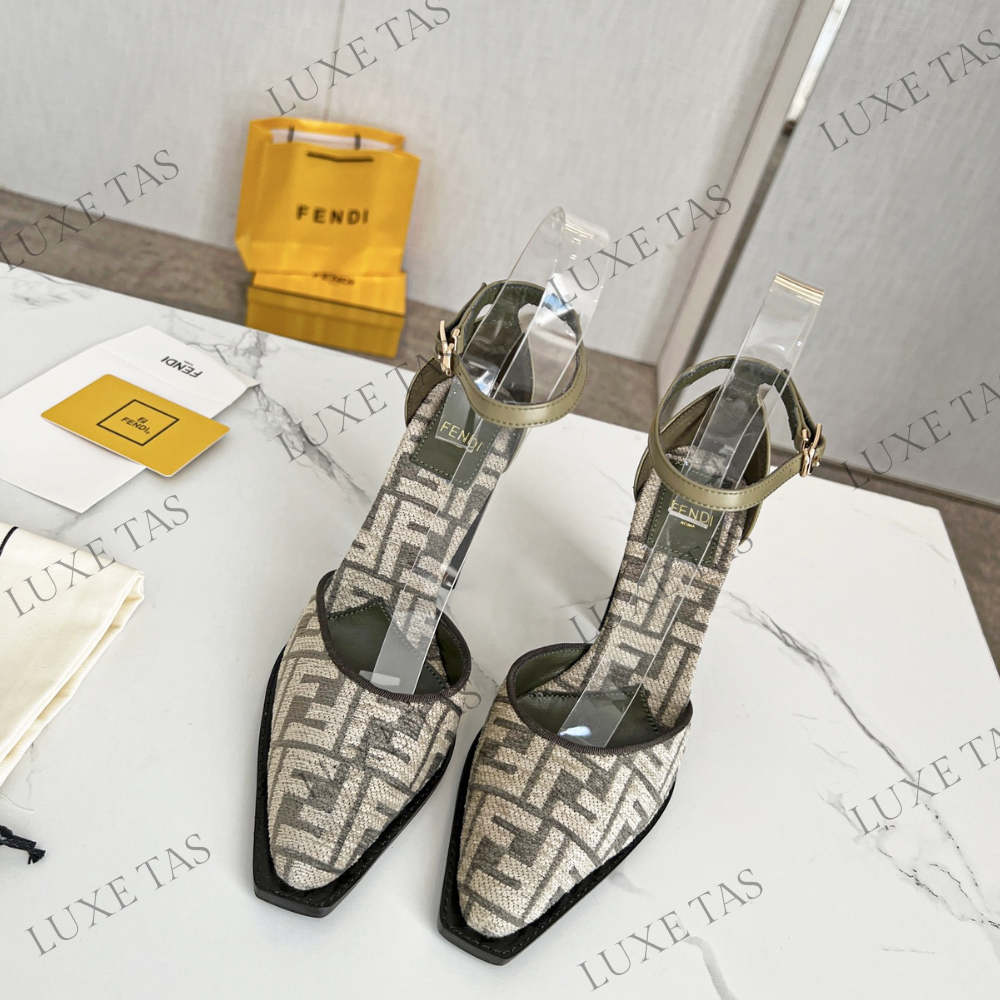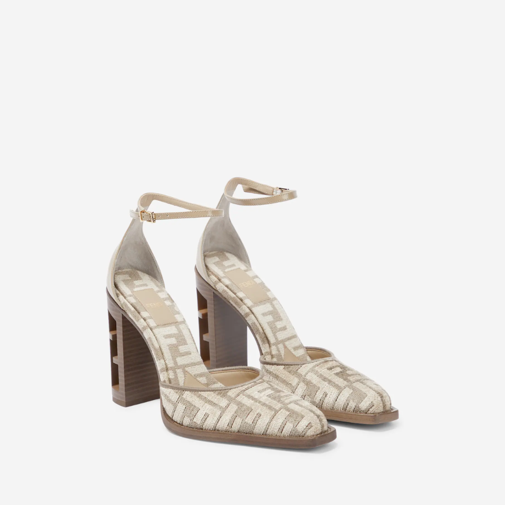 Elevate your work or daytime look with these stylish pumps featuring chunky block heels and unique cutouts inspired by iconic FF logo. Crafted from chenille, the pumps showcase a sophisticated beige jacquard logo motif, adding a touch of elegance. The slender ankle ties provide a feminine and adjustable fit, ensuring comfort throughout the day. These pumps are the perfect choice for adding a fashionable twist to any outfit.