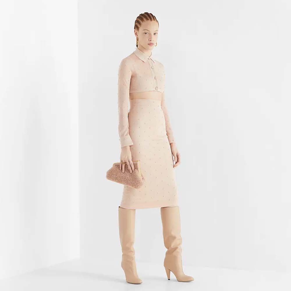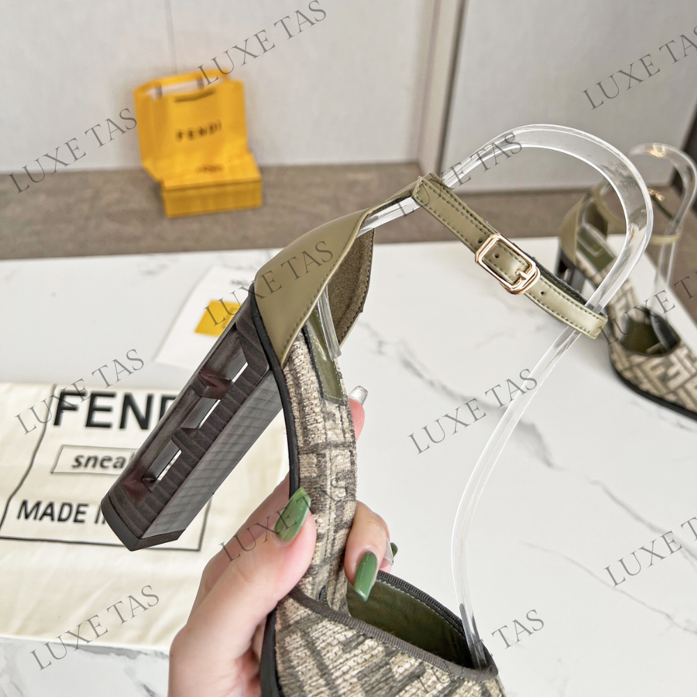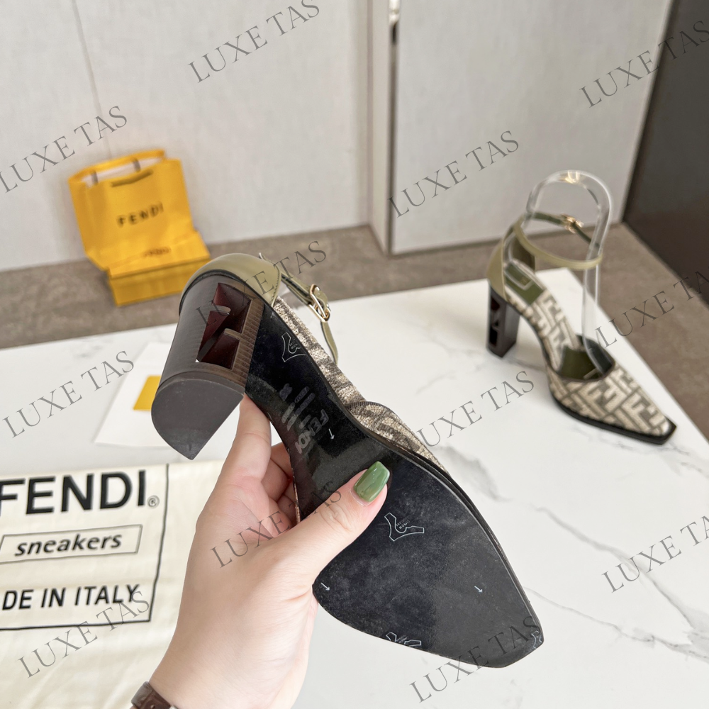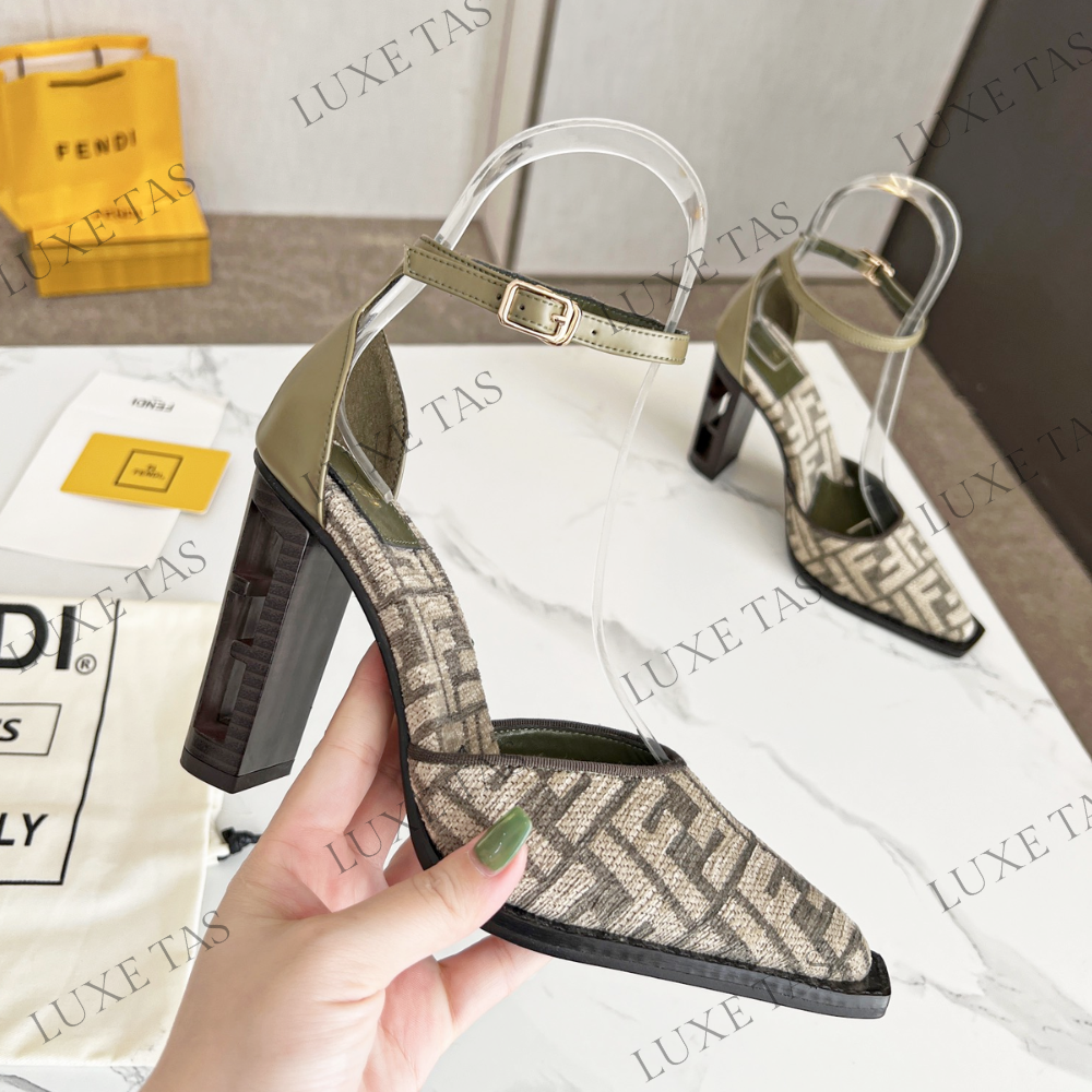 Elevate your work or daytime look with these stylish pumps featuring chunky block heels and unique cutouts inspired by iconic FF logo. Crafted from chenille, the pumps showcase a sophisticated beige jacquard logo motif, adding a touch of elegance. The slender ankle ties provide a feminine and adjustable fit, ensuring comfort throughout the day. These pumps are the perfect choice for adding a fashionable twist to any outfit.