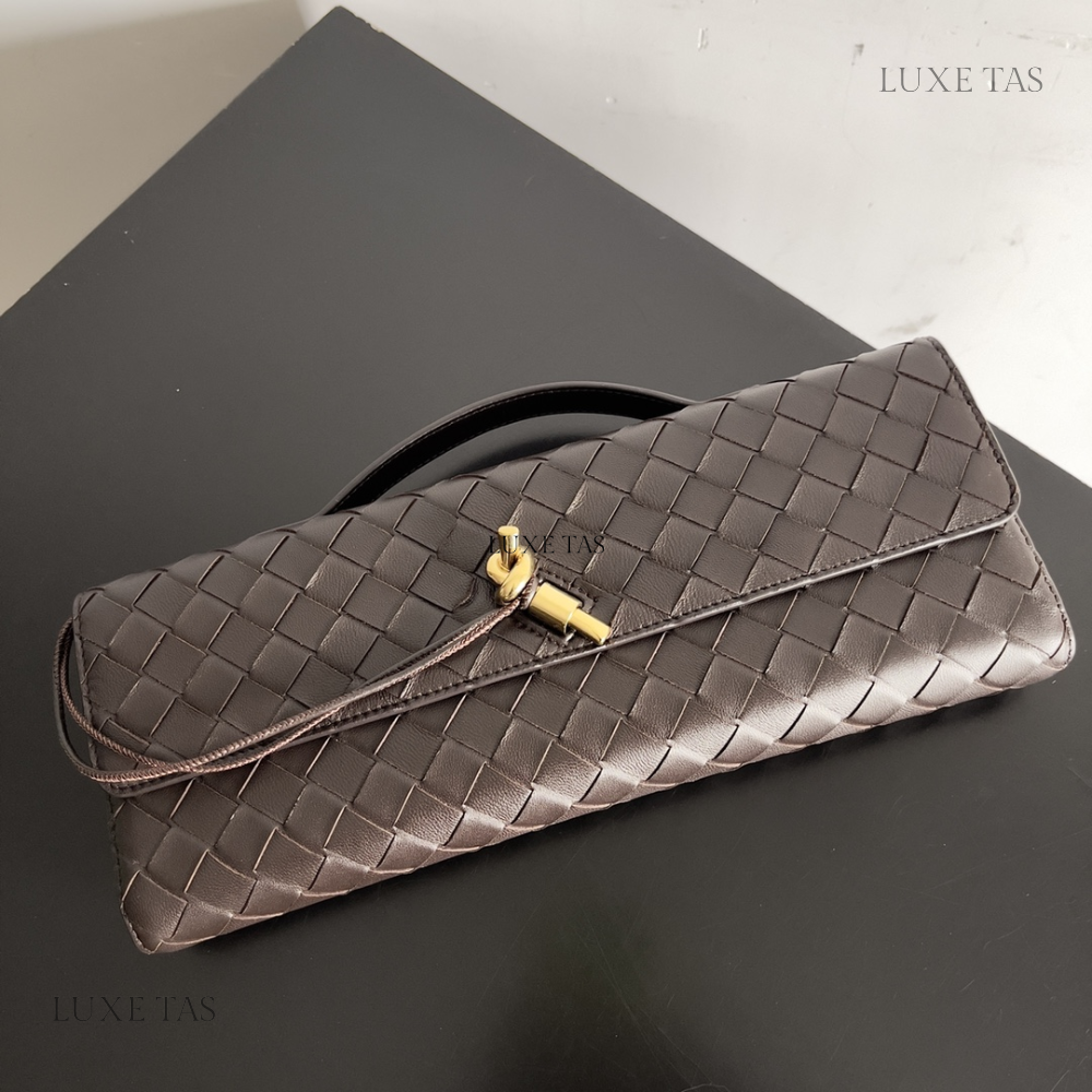 Step into sophistication with our stunning Clutch with handle, meticulously crafted using the renowned Intrecciato technique in sumptuous lambskin leather! Featuring an elongated silhouette and a sleek metallic knot closure, this accessory exudes timeless elegance. Whether you're attending a gala or a casual gathering, it's the perfect finishing touch to elevate your look. Indulge in luxury with our exquisite clutch and make a stylish statement wherever you go!