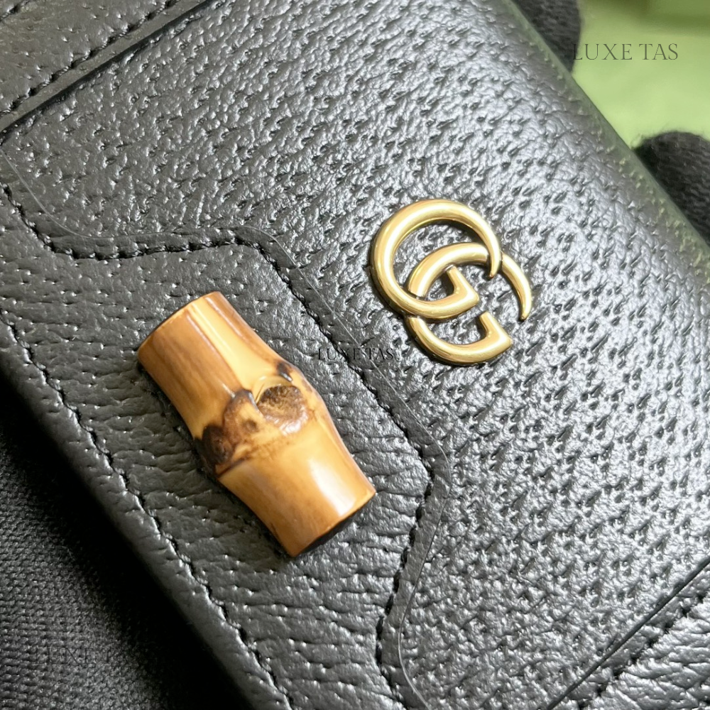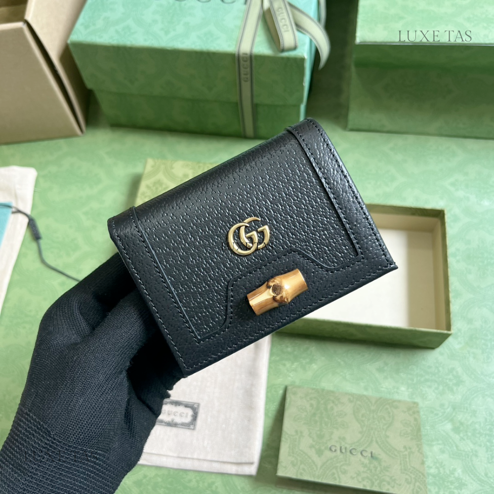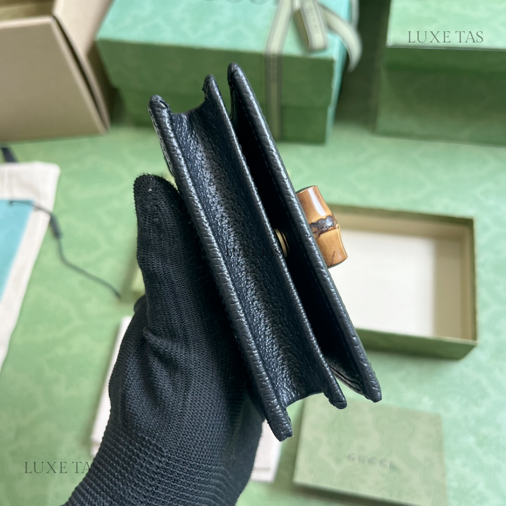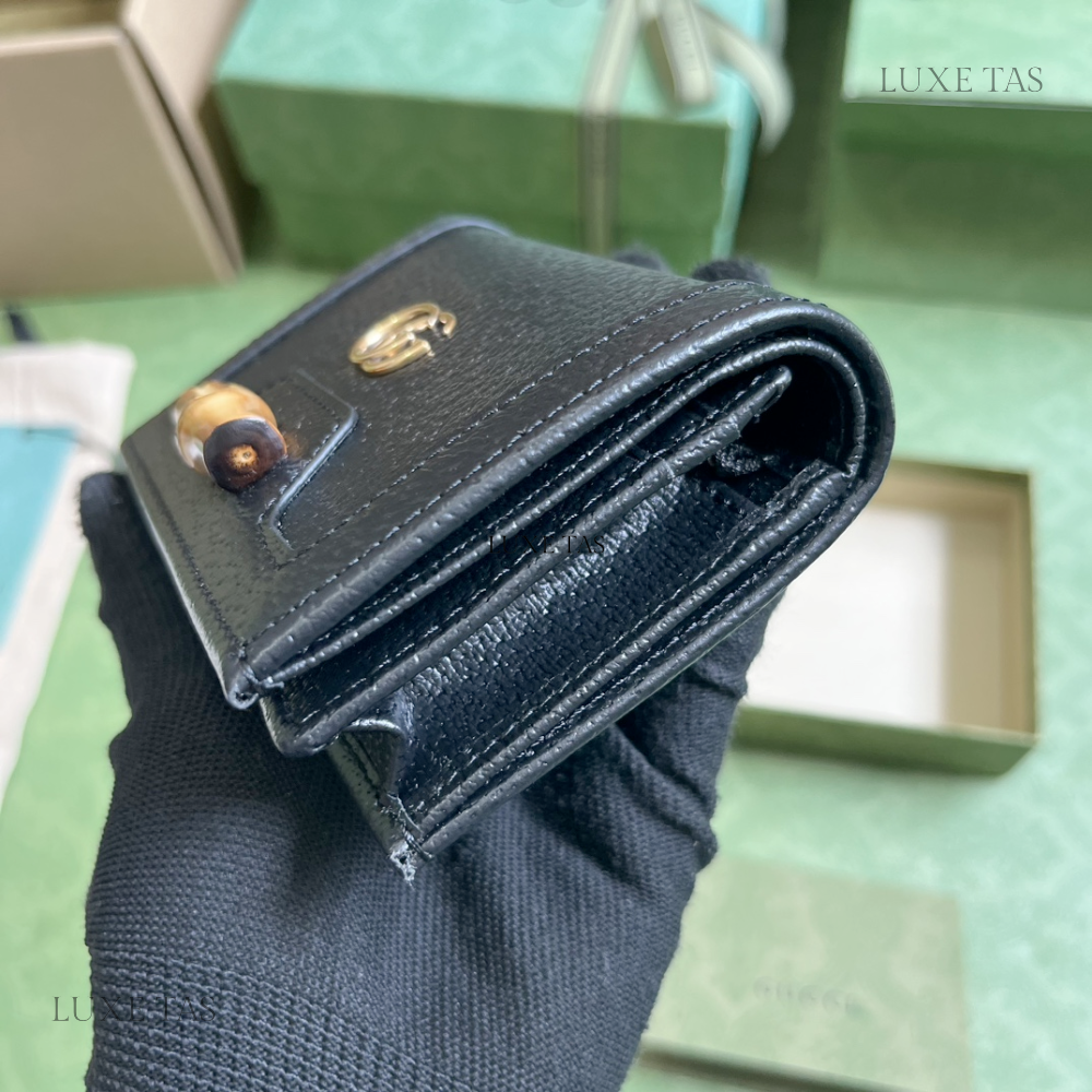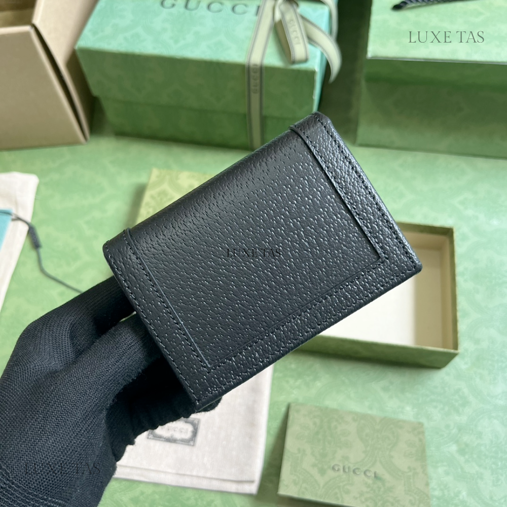 Celebrate GG's rich heritage with this captivating card case wallet featuring a symbolic bamboo closure. Meticulously crafted from sleek black leather, this accessory exudes timeless elegance. Adorning it is the iconic GG's monogram hardware, adding a touch of prestige to its impeccable design. Embrace the allure of tradition and luxury with every use of this exquisite piece.