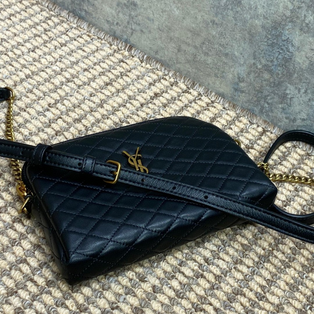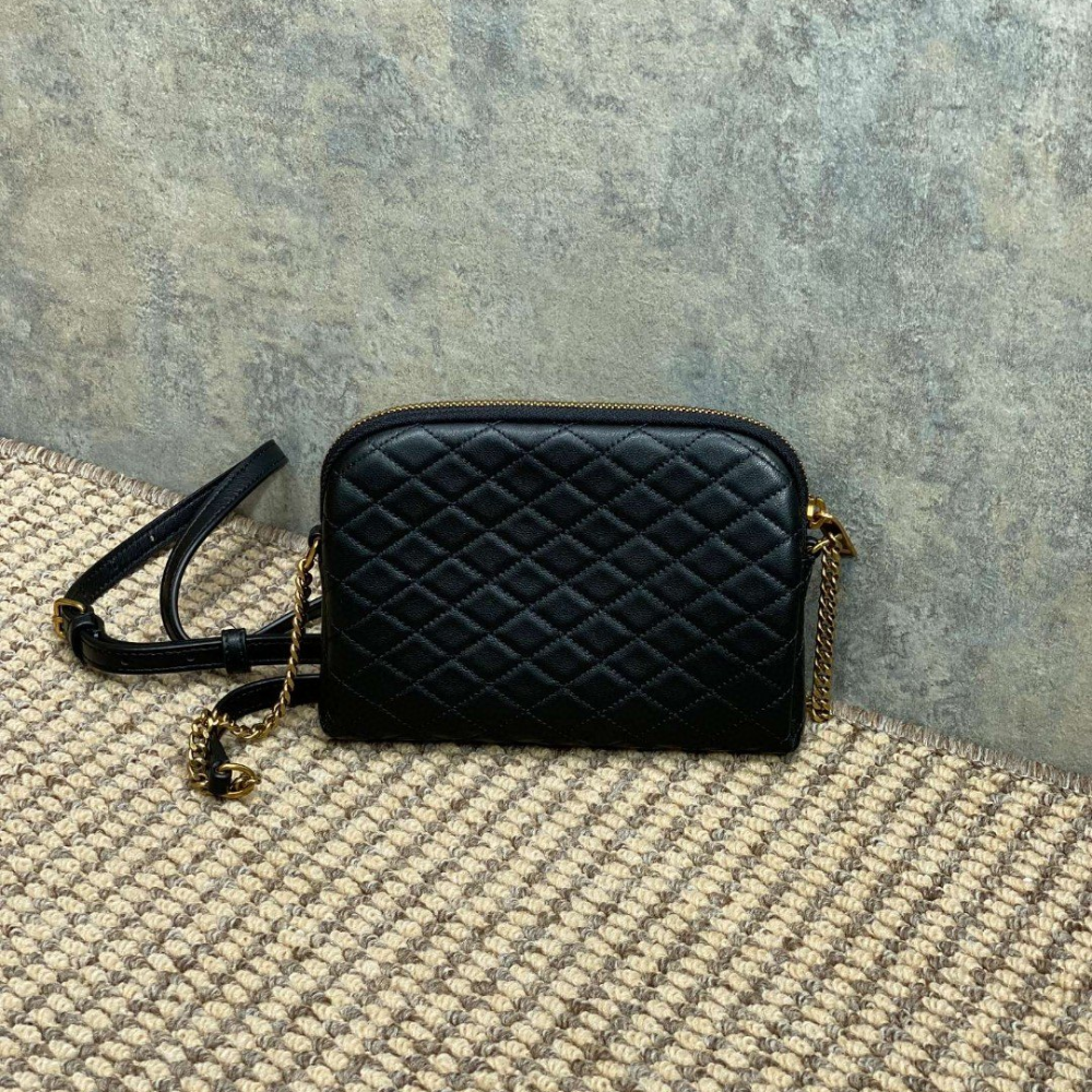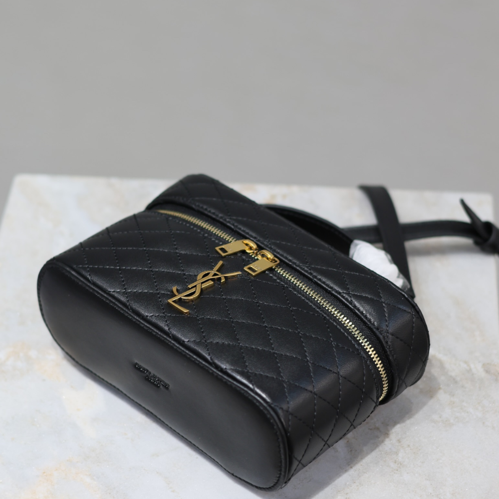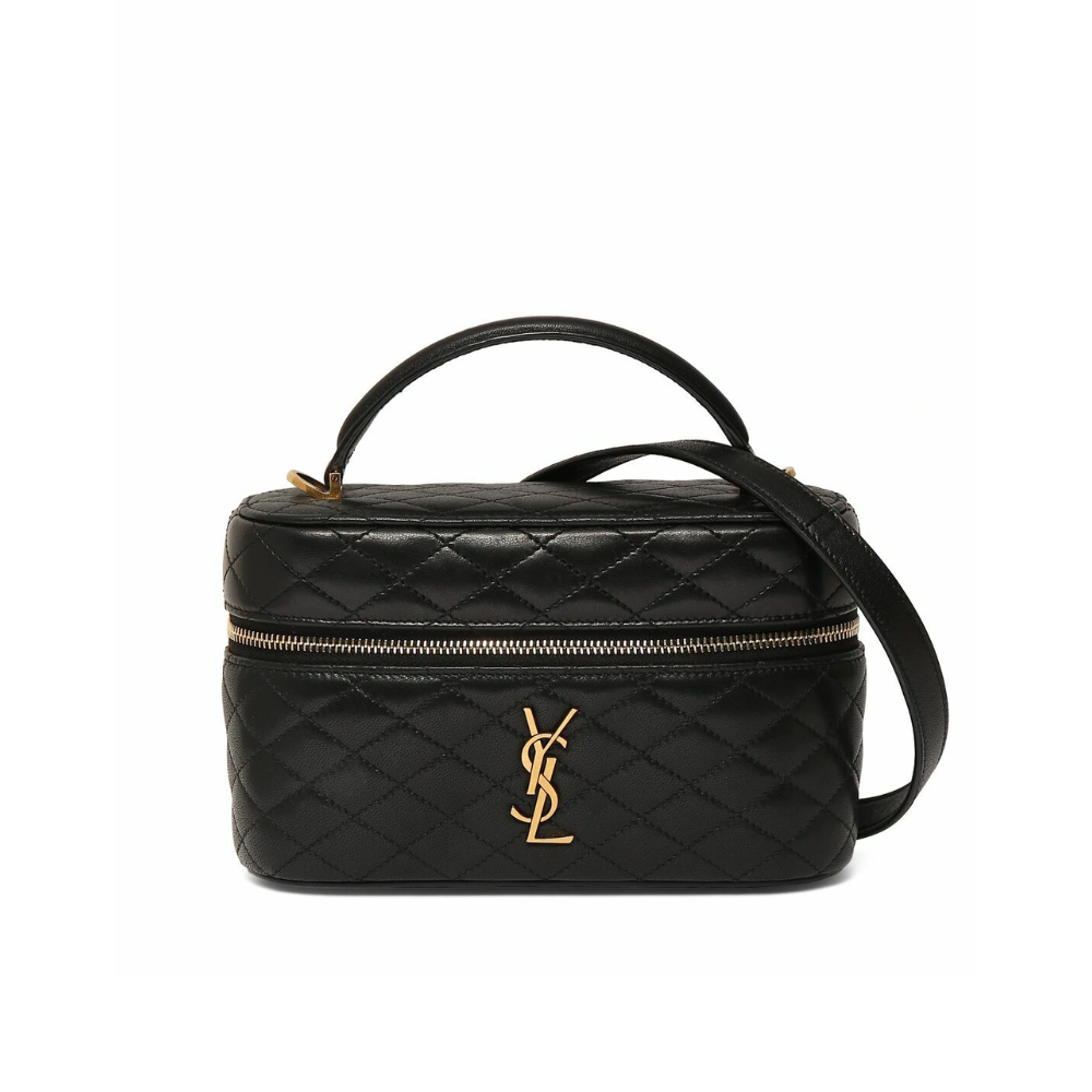 The Gaby mini vanity bag is a stylish and adaptable accessory, crafted from luxurious lambskin leather with diamond-quilted stitching and bronze-tone hardware. It includes a leather handle, a detachable strap for shoulder or crossbody wear, a zip closure, and an internal card slot.