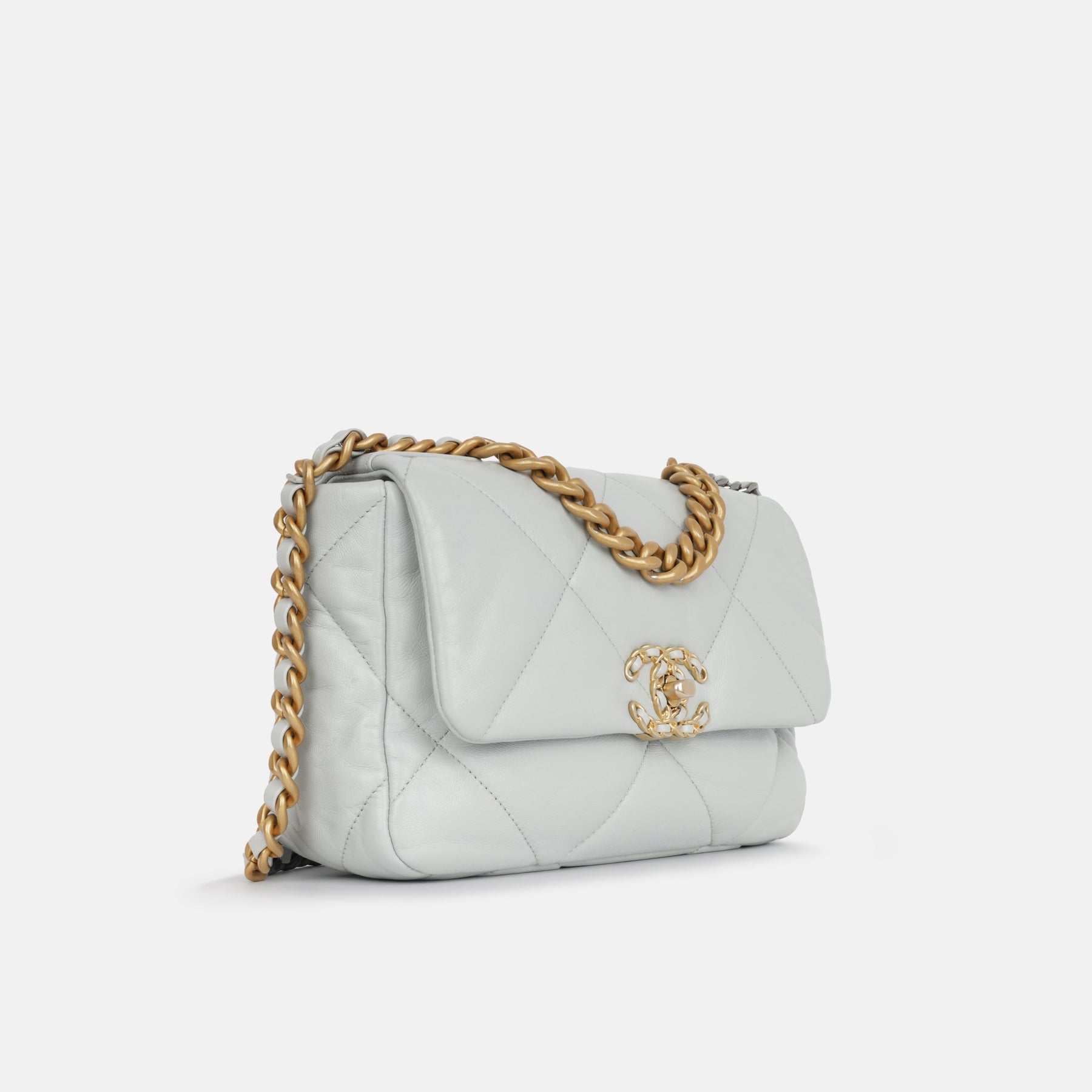 Regular price $2,880.00 Sale price $420.00 Save $2,460.00For timeless Parisian-chic there is no better investment than a Chanel flap bag. However, for something both classic and on-trend, the Chanel 19 Flap Bag ticks all boxes. This light blue shade is unique and particularly sought after; and it will compliment a range of outfits in your wardrobe. The interwoven chain sits elegantly on your shoulder or doubled up on your arm.
