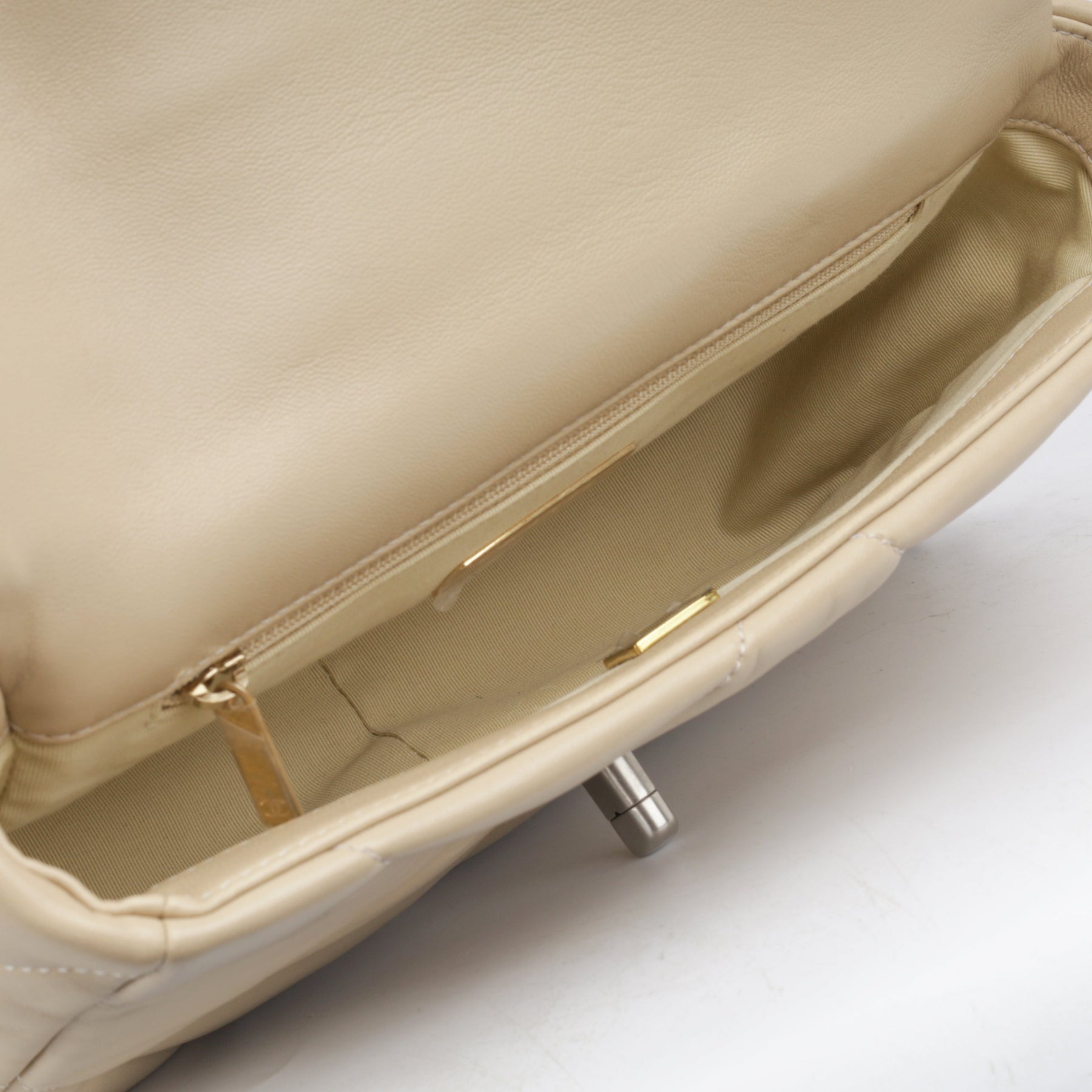 Regular price $2,920.00 Sale price $410.00 Save $2,510.00For timeless Parisian-chic there is no better investment than a Chanel flap bag. However, for something both classic and on-trend, the Chanel 19 Flap Bag ticks all boxes. This beige is unique and particularly sought after; and it will compliment a range of outfits in your wardrobe. The interwoven chain sits elegantly on your shoulder or doubled up on your arm.