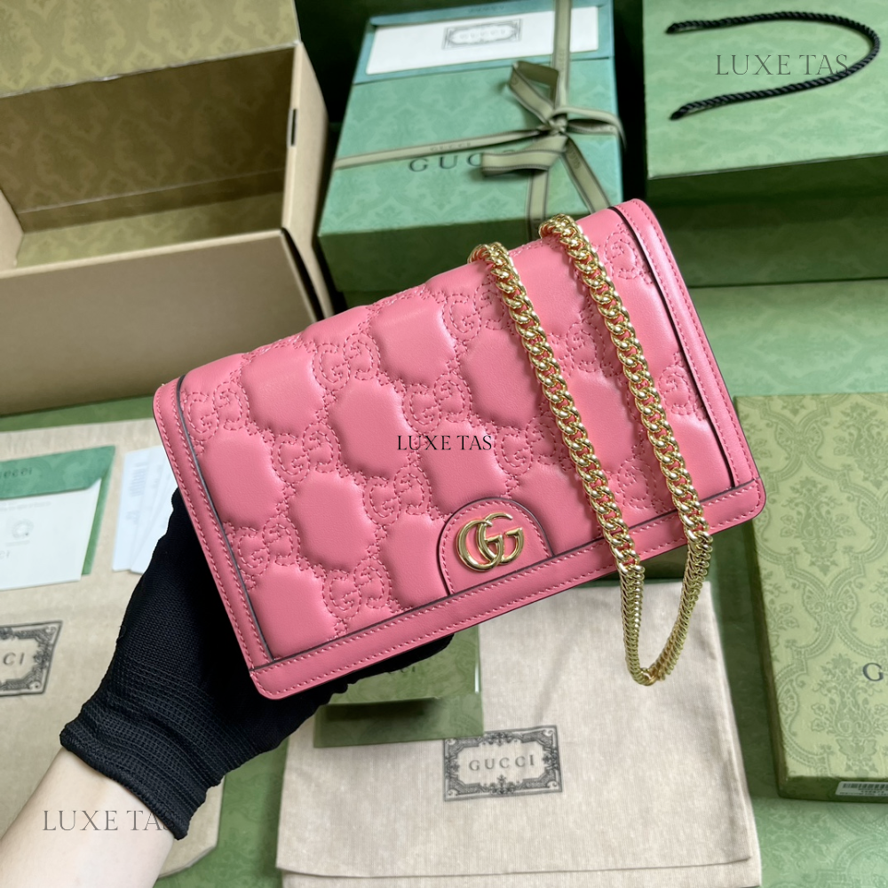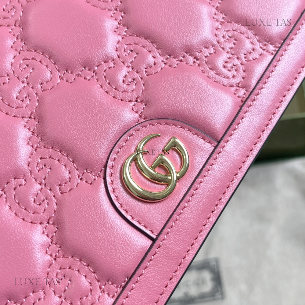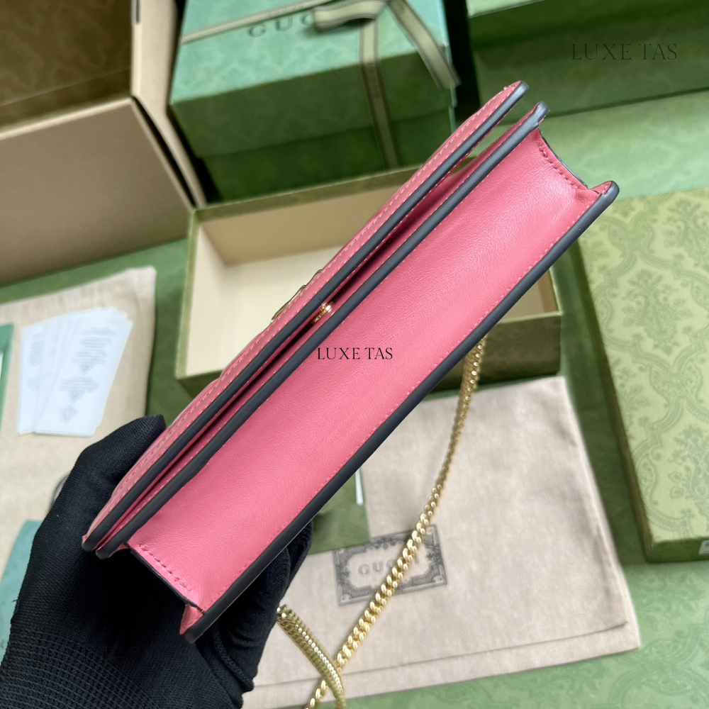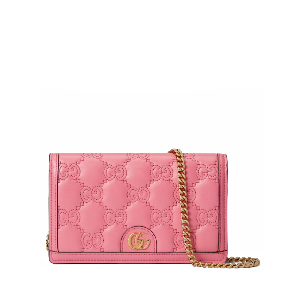 Indulge in the unmistakable charm of GG's signature Matelassé leather, celebrated for its luxuriously soft texture. This iconic material adorns a range of exquisite small leather accessories, including the elegant chain wallet in a delightful shade of pink. The wallet's textured geometric motif showcases the brand's unique touch, while the Double G hardware embellishes the front, adding a touch of unmistakable logo flair to this exceptional design. Experience the allure of timeless sophistication and contemporary style in this one-of-a-kind piece from GG's collection of small leather accessories.