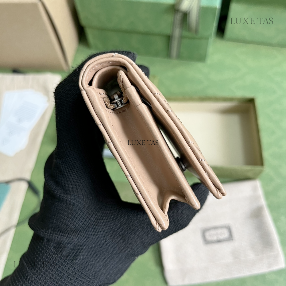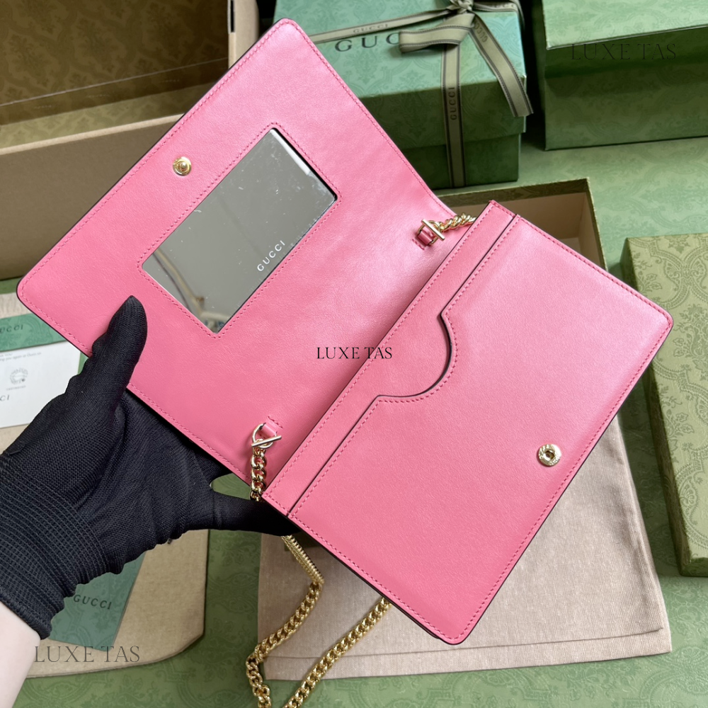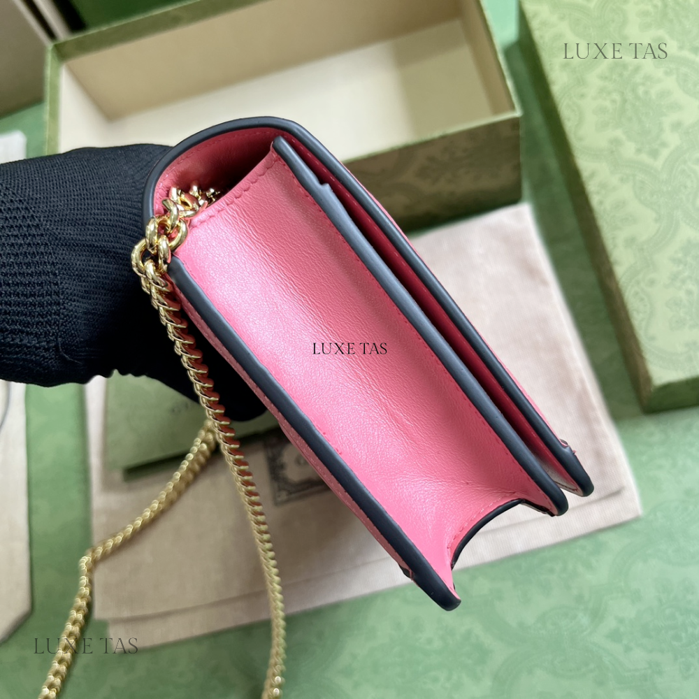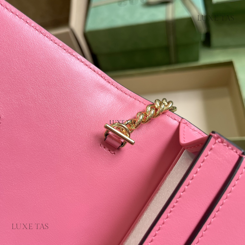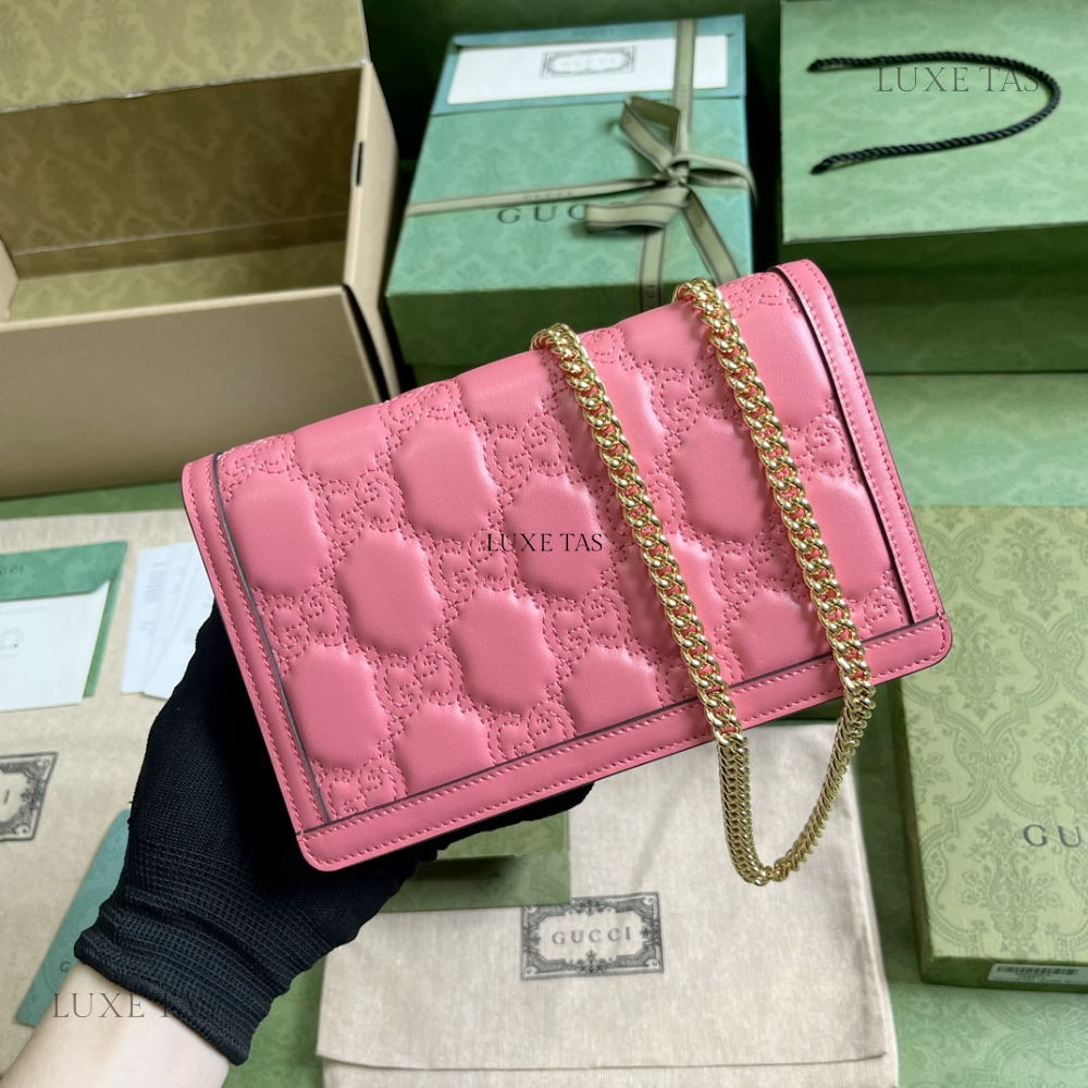 Indulge in the unmistakable charm of GG's signature Matelassé leather, celebrated for its luxuriously soft texture. This iconic material adorns a range of exquisite small leather accessories, including the elegant chain wallet in a delightful shade of pink. The wallet's textured geometric motif showcases the brand's unique touch, while the Double G hardware embellishes the front, adding a touch of unmistakable logo flair to this exceptional design. Experience the allure of timeless sophistication and contemporary style in this one-of-a-kind piece from GG's collection of small leather accessories.