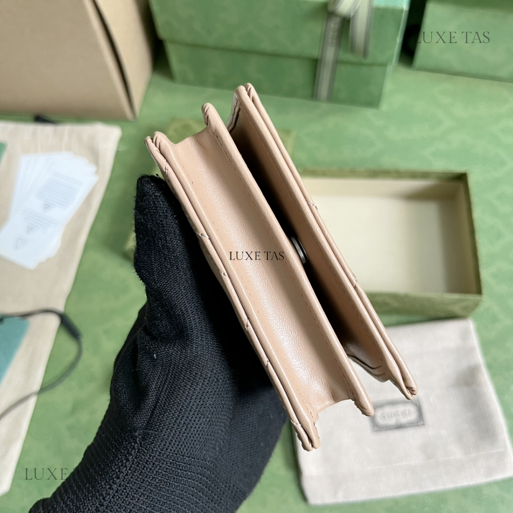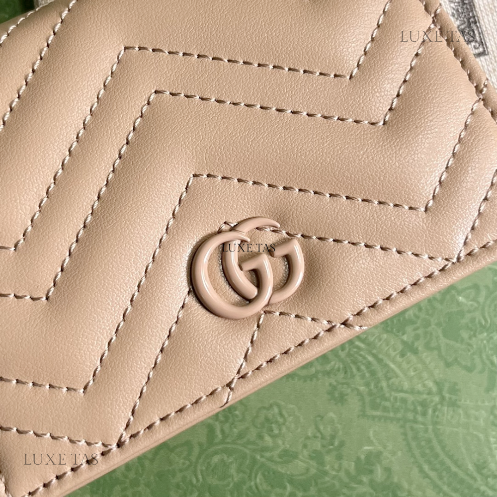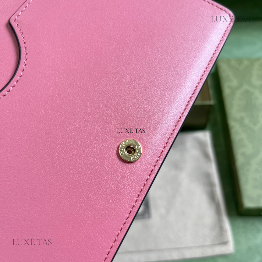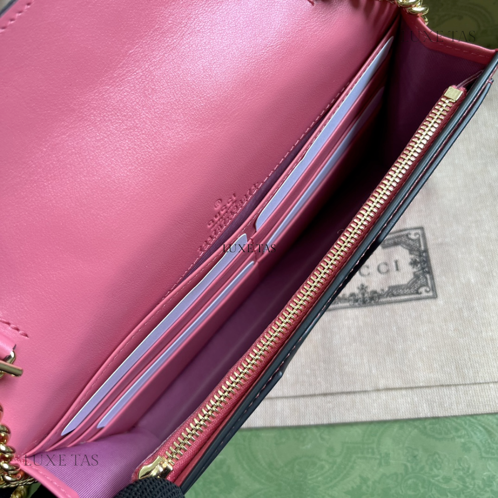 Indulge in the unmistakable charm of GG's signature Matelassé leather, celebrated for its luxuriously soft texture. This iconic material adorns a range of exquisite small leather accessories, including the elegant chain wallet in a delightful shade of pink. The wallet's textured geometric motif showcases the brand's unique touch, while the Double G hardware embellishes the front, adding a touch of unmistakable logo flair to this exceptional design. Experience the allure of timeless sophistication and contemporary style in this one-of-a-kind piece from GG's collection of small leather accessories.