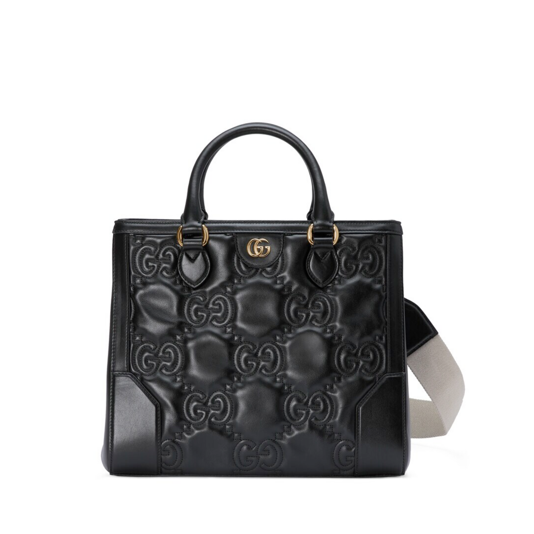 The House's signature matelassé leather is renowned for its incredibly soft finish. This tactile material is a defining feature of the textured GG motif showcased across a selection of handbags, including this black leather tote bag. The iconic Double G hardware further accentuates the logo-inspired feel of the design.