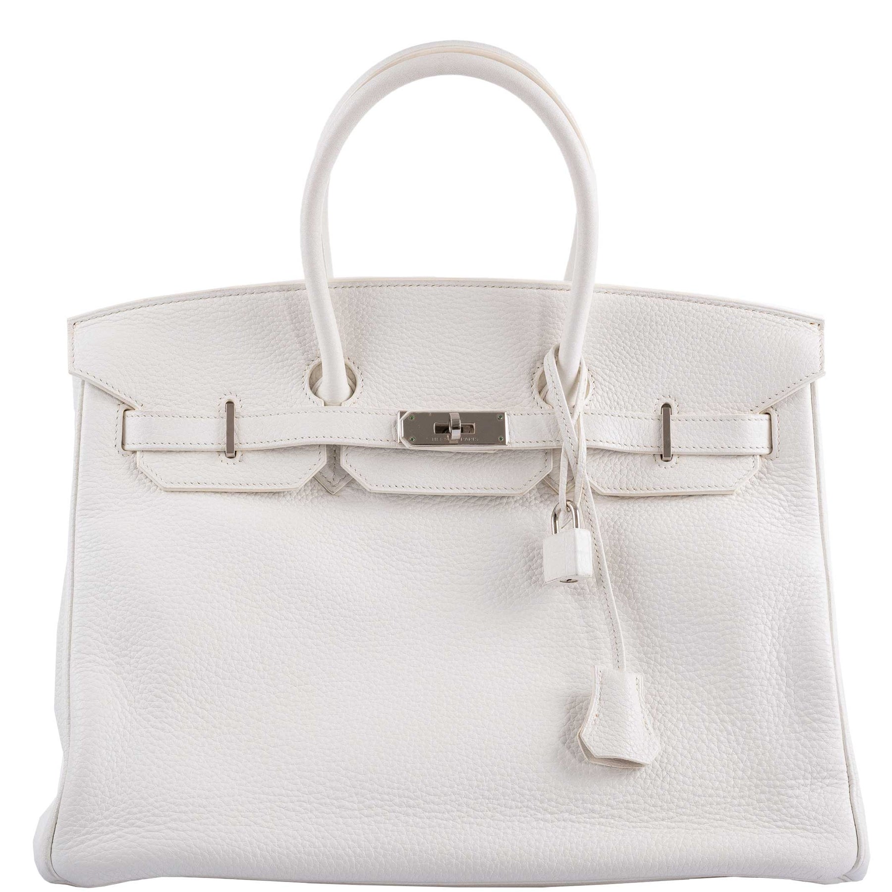 Regular price $1,205.00 Sale price $723.00 Save $482.00Birkin bags are known for being challenging to get, always ‘sold out’ in stores, and being offered even a simple leather Birkin is never guaranteed. The White Clemence leather Birkin 35cm is a timeless staple in your collection, especially with Palladium hardware. This Birkin features a front toggle closure, clochette with lock and two keys, and double rolled handles