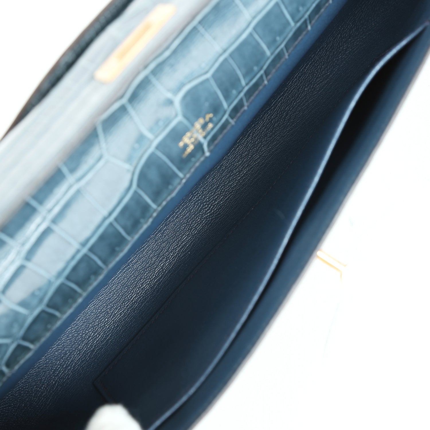 The interior is lined in Turquoise swift leather and has one interior slit pocket on front wall.