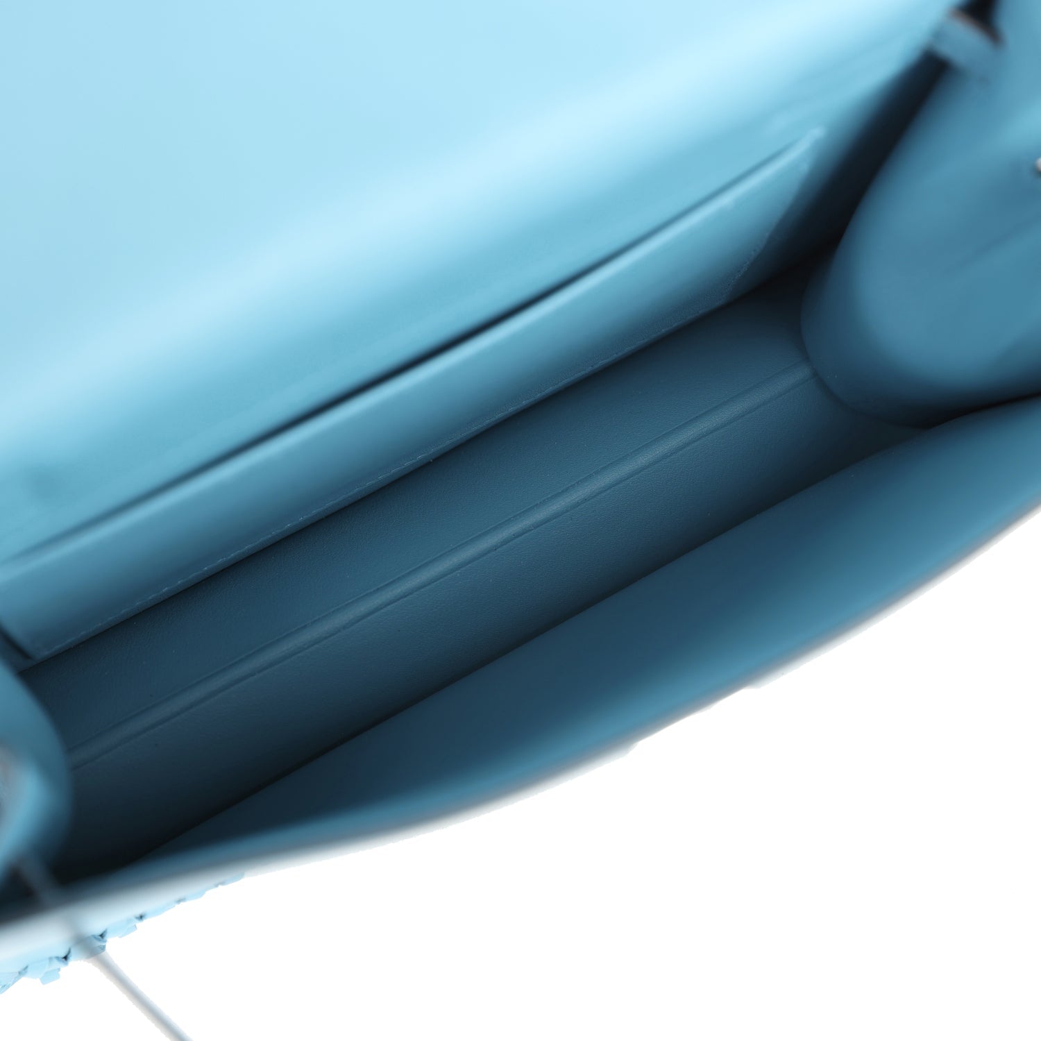 The interior is lined with Bleu Zanzibar lambskin and has a removable Hermes stamped base and an open wall pocket.