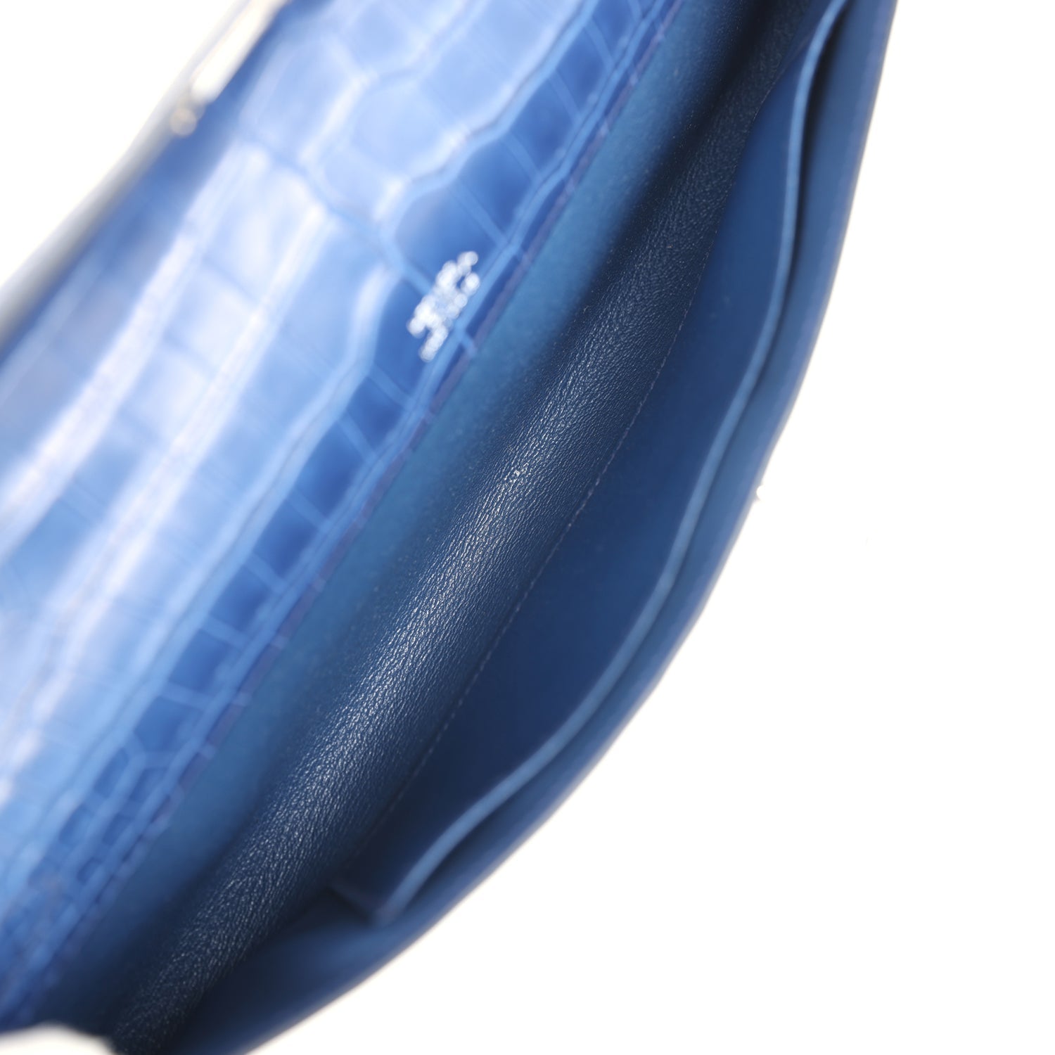 The interior is lined with Blue Jean lambskin and has an open wall pocket.