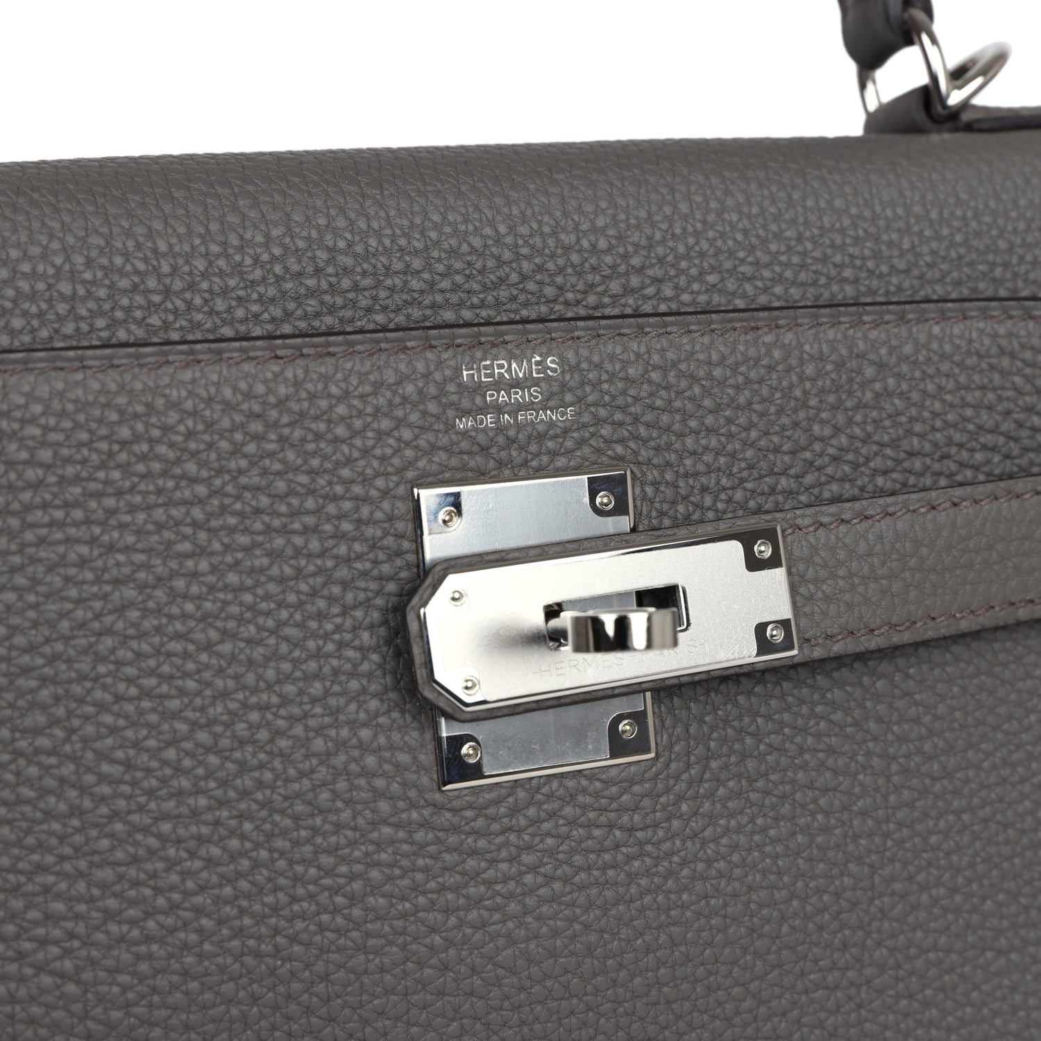Regular price $1,855.00 Sale price $1,113.00 Save $742.00This Kelly, in the Retourne style, is in Gris Neve togo leather with palladium hardware and has tonal stitching, front flap, two straps with center toggle closure, clochette with lock and two keys, single rolled handle and removable shoulder strap.