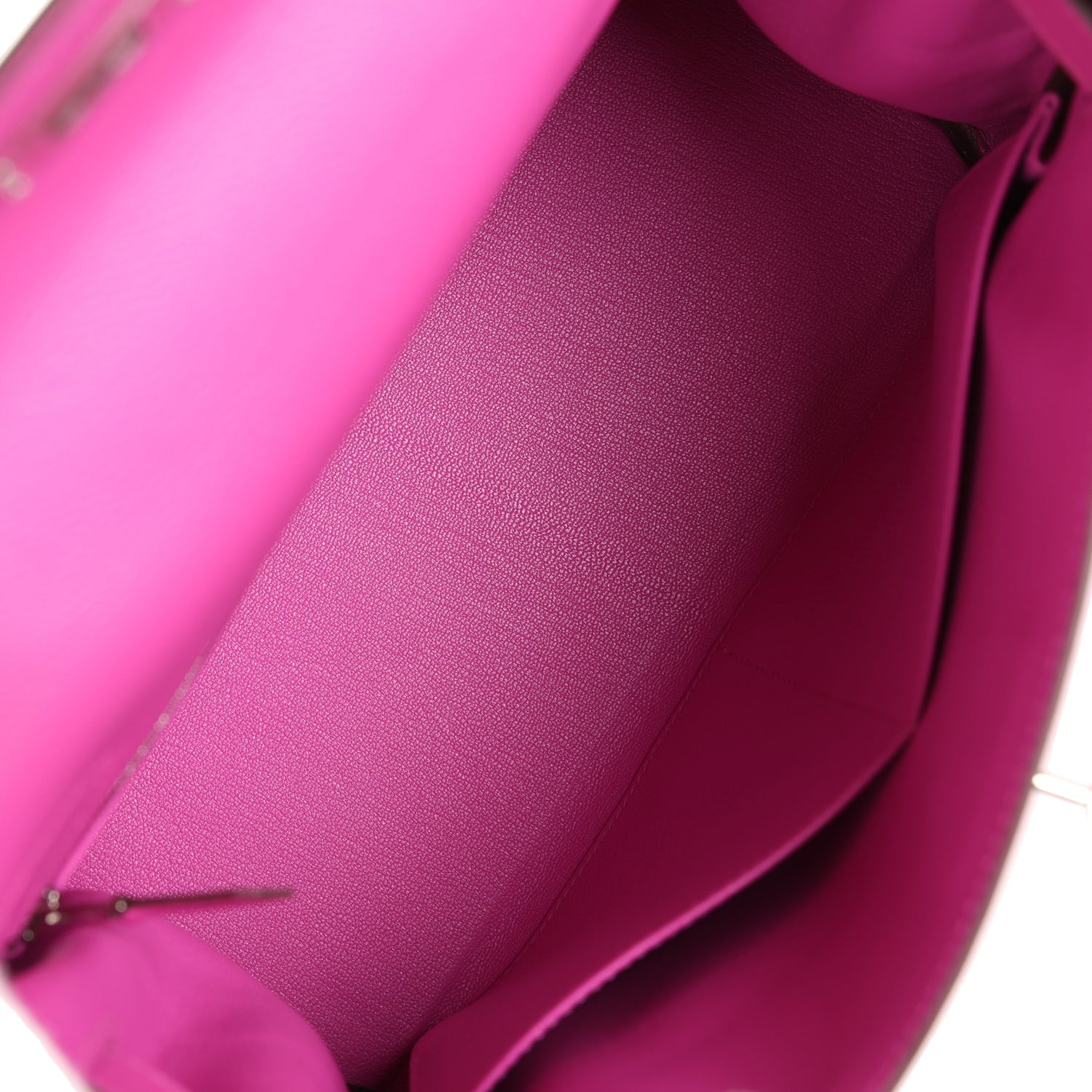 Regular price $1,575.00 Sale price $945.00 Save $630.00This Kelly, in the Retourne style, is in Rose Pourpre evercolor leather with palladium hardware and has tonal stitching, front flap, two straps with center toggle closure, clochette with lock and two keys, single rolled handle and a removable shoulder strap.