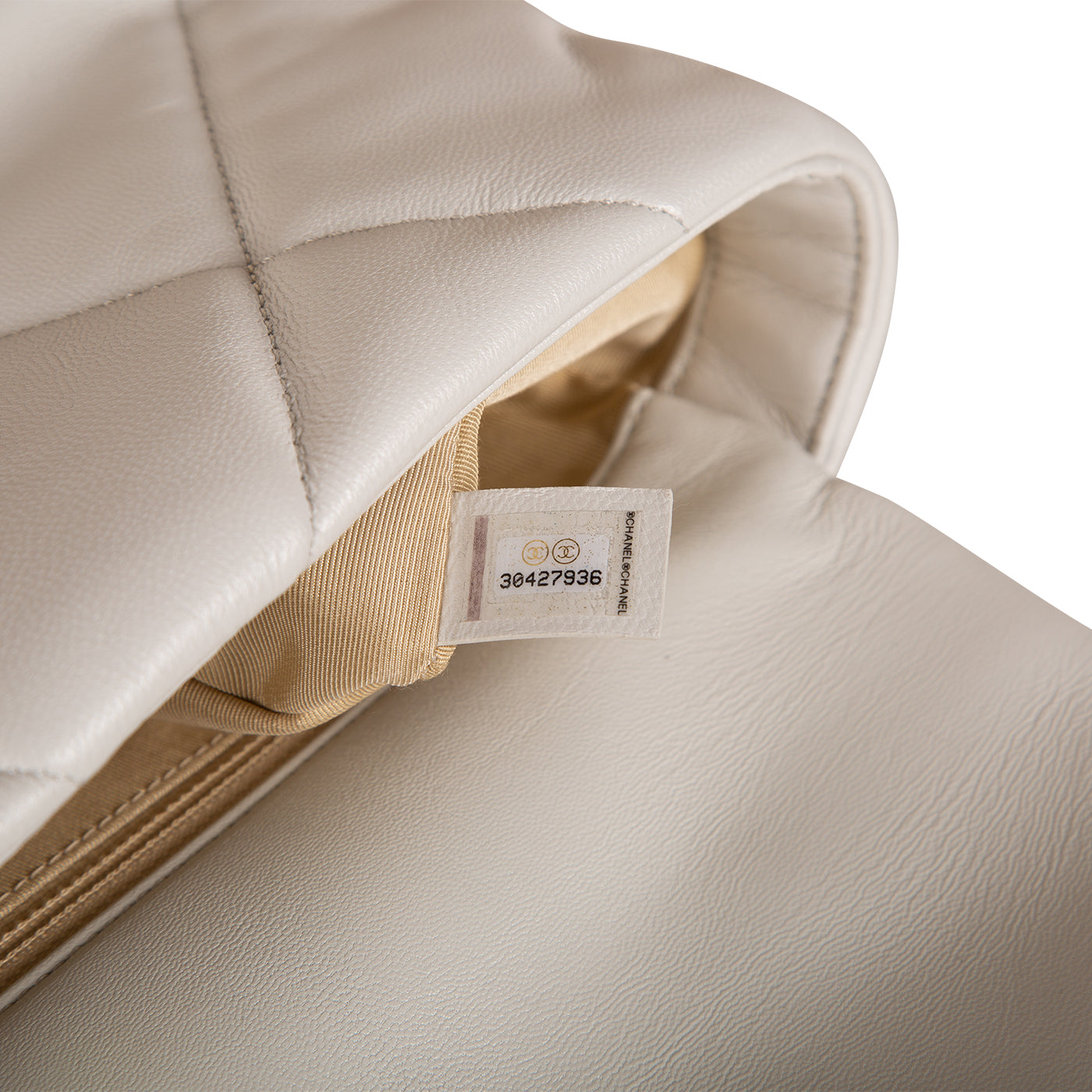 Regular price $2,930.00 Sale price $440.00 Save $2,490.00For timeless Parisian-chic there is no better investment than a Chanel flap bag. However, for something both classic and on-trend, the Chanel 19 Flap Bag ticks all boxes and is quite possibly the most sought after bag in the world at this moment. Constructed from white lambskin and paired with two-tone hardware, both Gold and Ruthenium, this icon is a real statement piece. The interwoven chain sits elegantly on your shoulder or doubled up on your arm. Under the creative direction of Karl Lagerfeld, Chanel continues with its line of classic quilted bags. Style with absolutely everything...really!