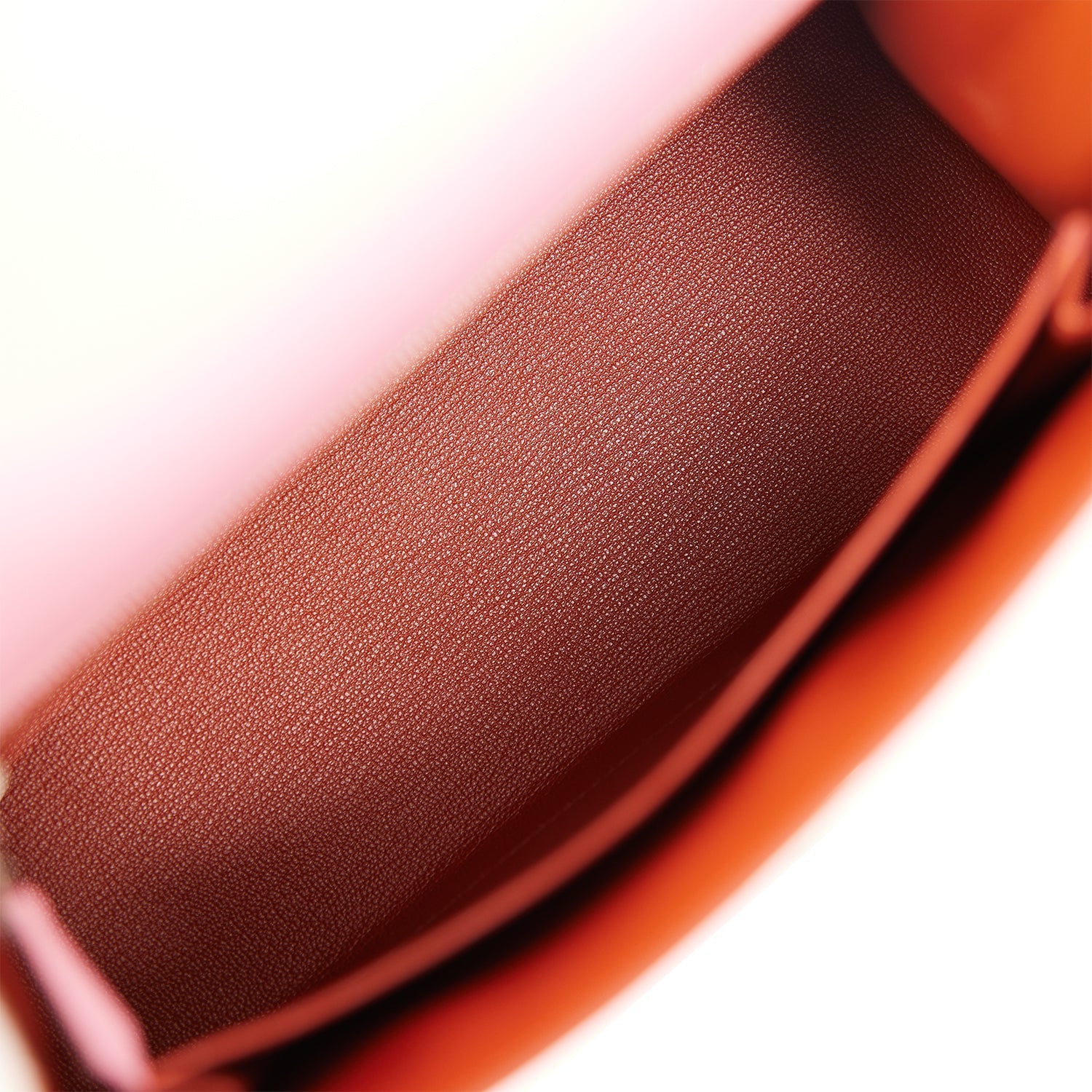 The interior is lined with Orange chevre leather and has one zip pocket with an Hermes engraved pull and one open pocket on the opposite side.
