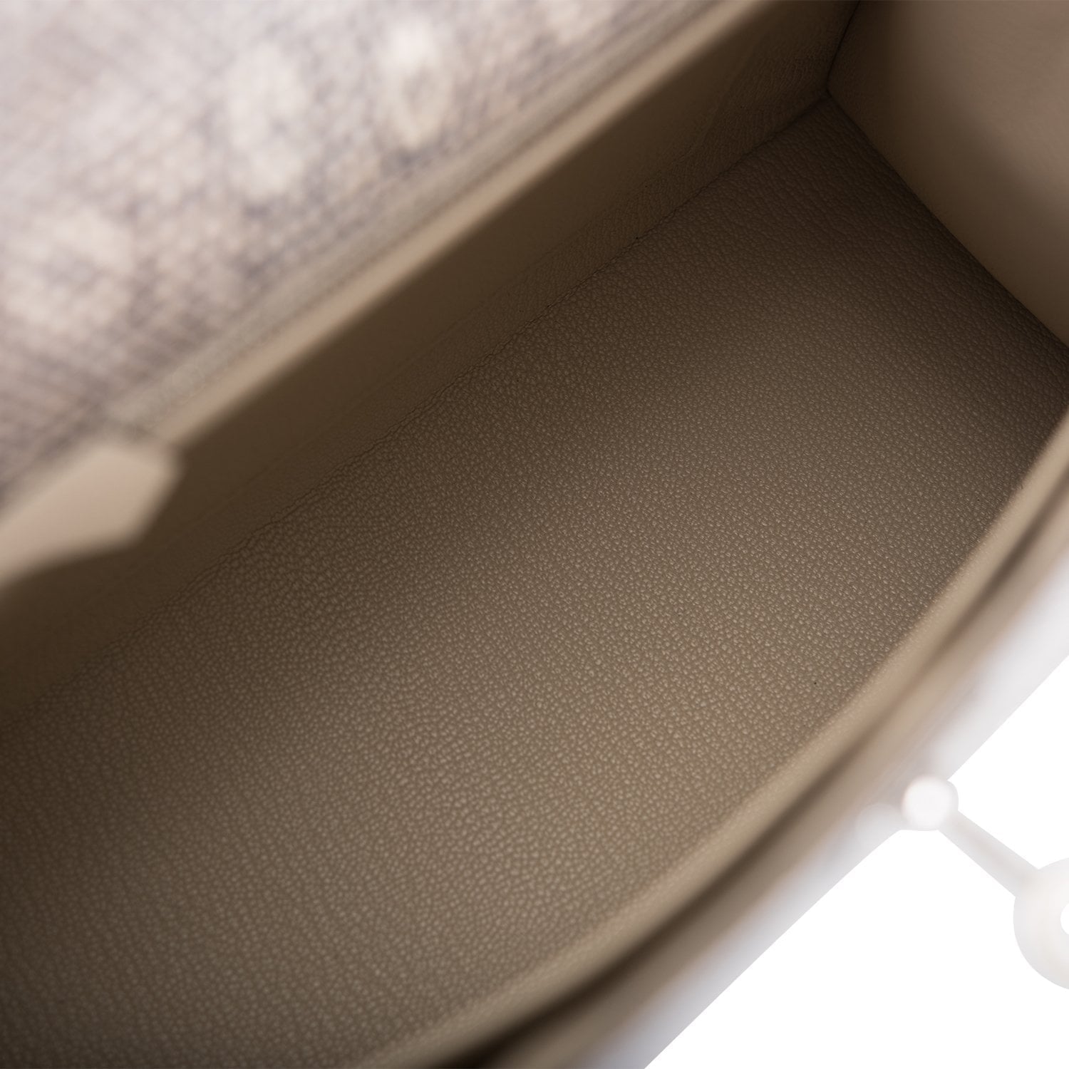 The interior is lined with Etoupe chevre leather and has one zip pocket with an Hermes engraved pull and one open pocket on the opposite side.
