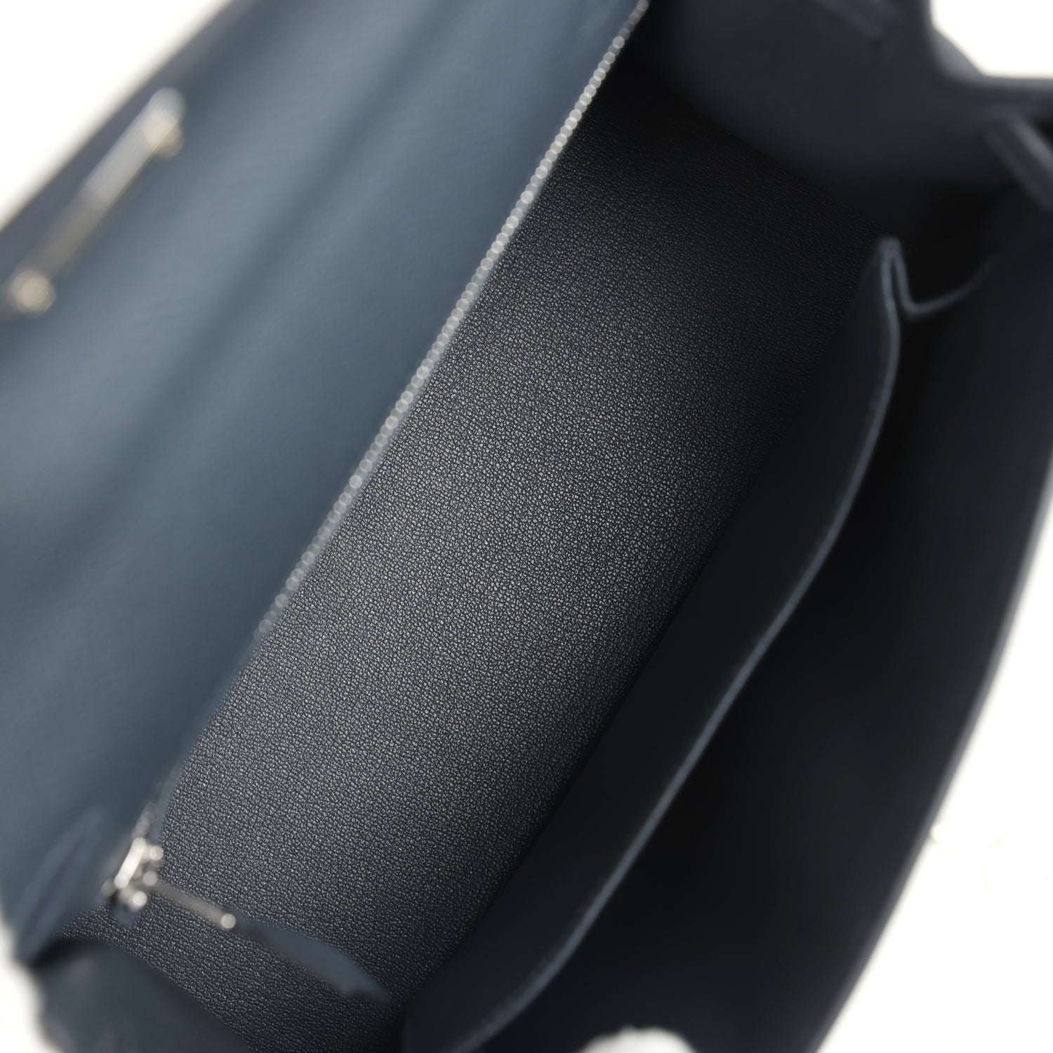 The interior is lined with Gris Platine chevre leather and has one zip pocket with an Hermes engraved pull and one open pocket on the opposite side.