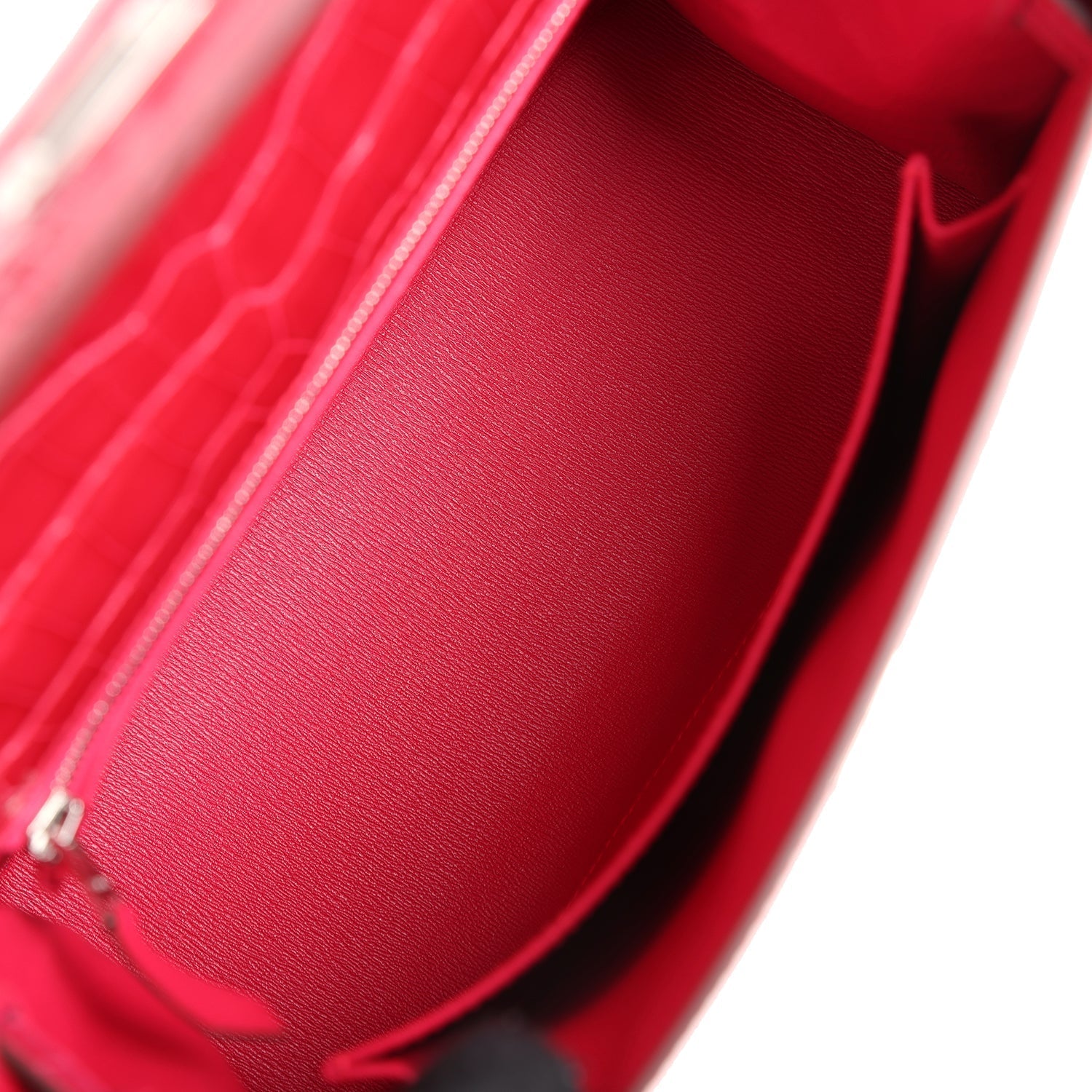 The interior is lined with Rouge Sellier chevre leather and has one zip pocket with an Hermes engraved pull and one open pocket on the opposite side.