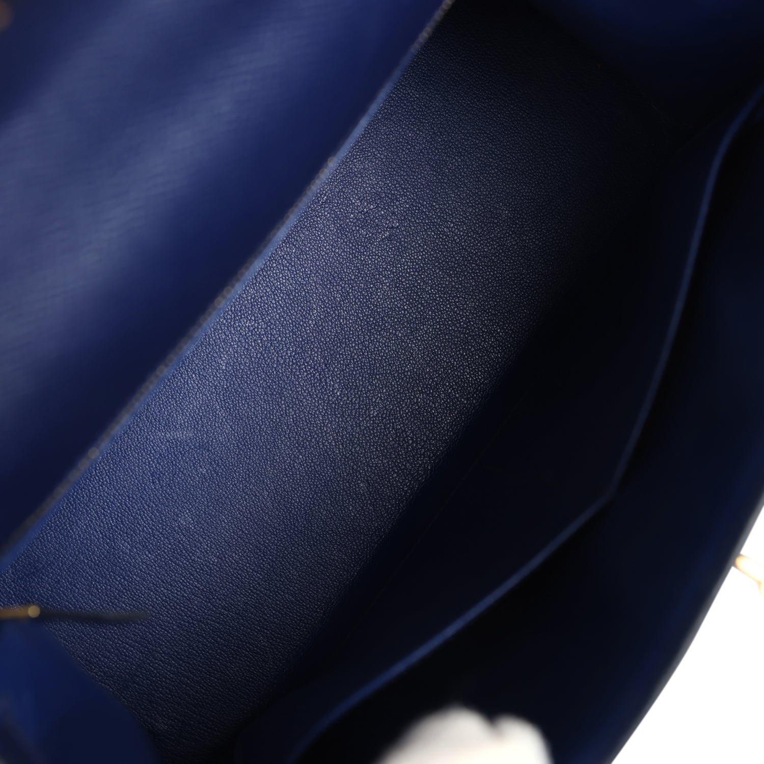 Regular price $1,715.00 Sale price $1,029.00 Save $686.00This Kelly, in the Sellier style, is in Bleu Electrique tadelakt leather with gold hardware and has tonal stitching, front flap, two straps with center toggle closure, clochette with lock and two keys a single rolled handle and removable shoulder strap.