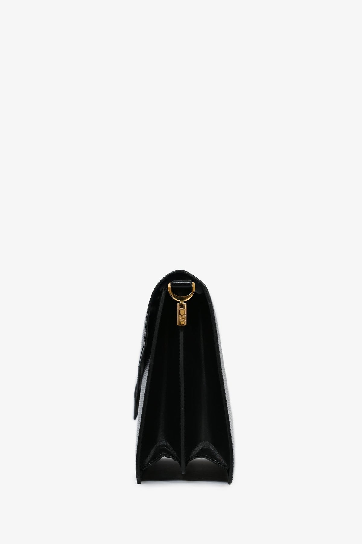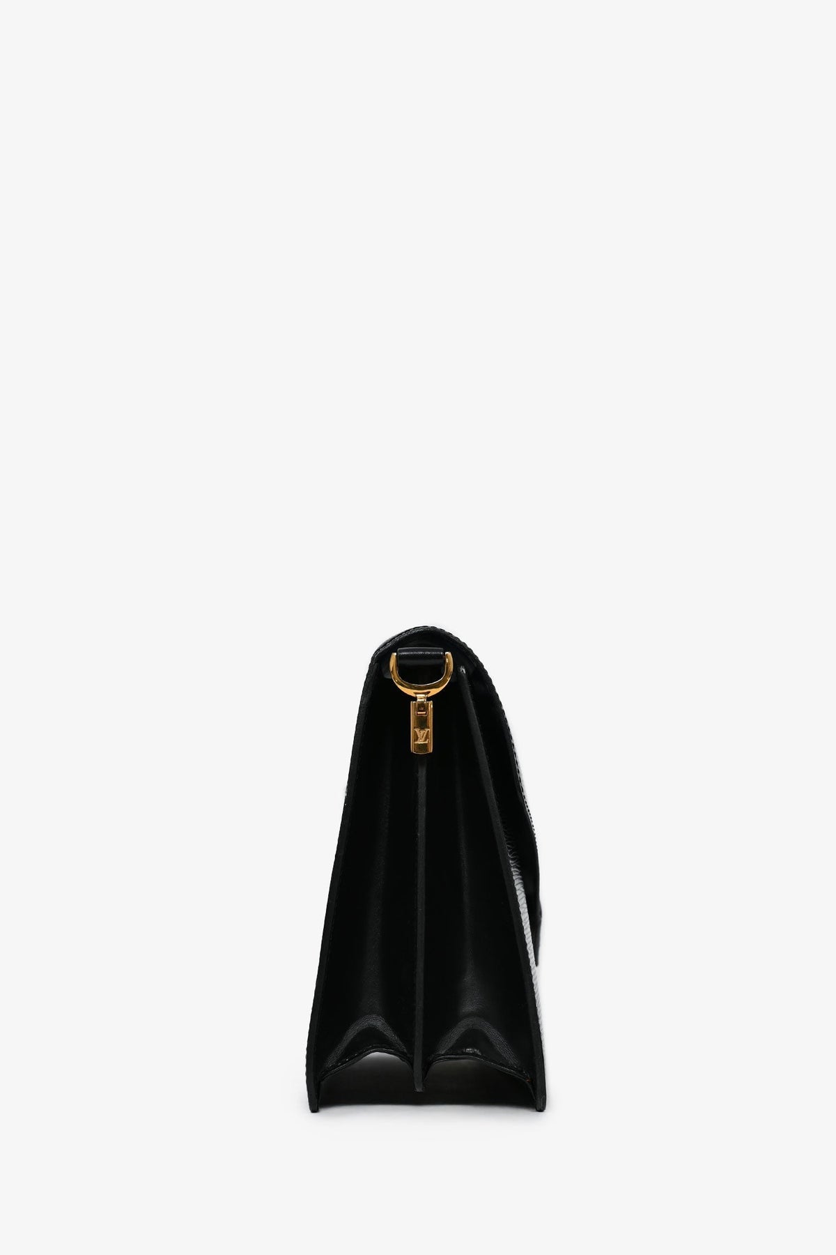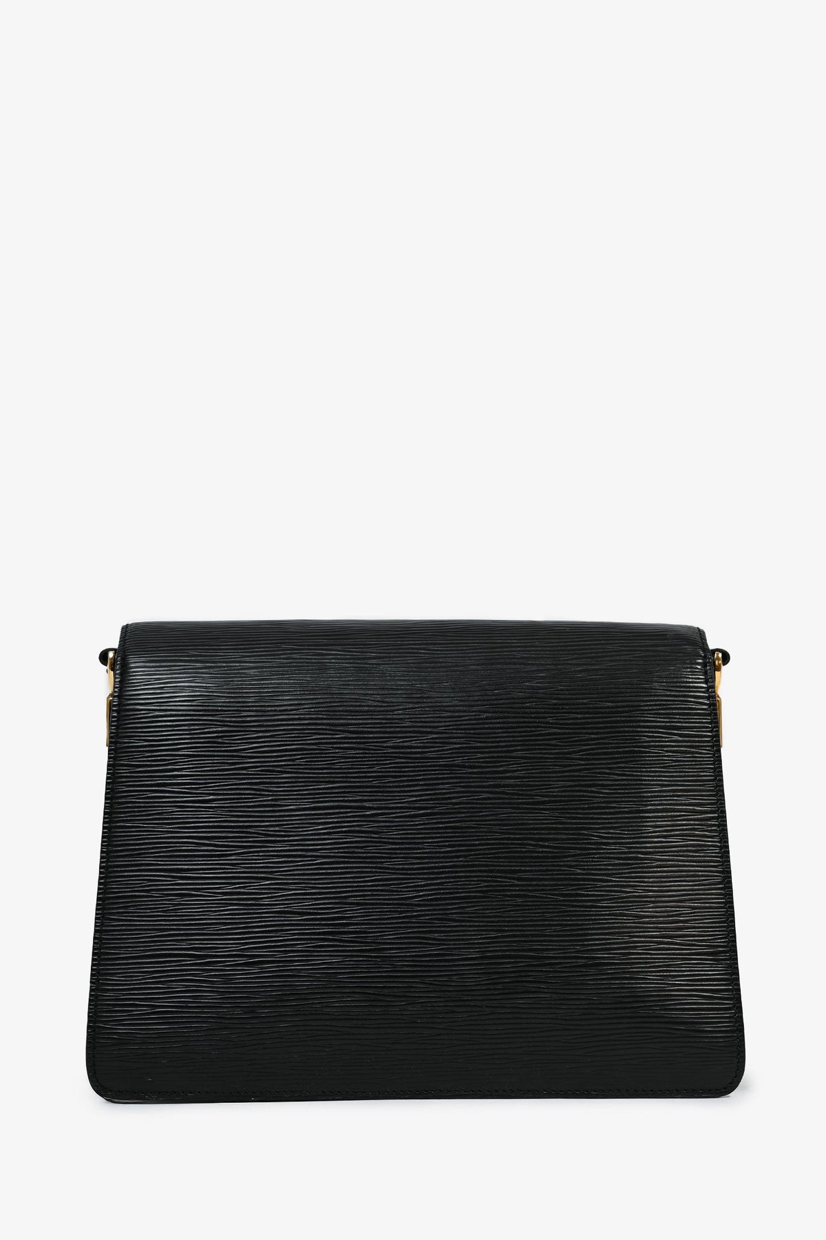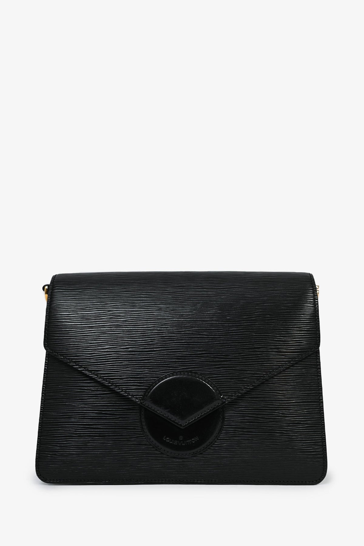 Louis Vuitton 1990 Black Epi Leather 'Osh' Adjustable Shoulder Strap Bag. Fold-over flap with a snap closure. Leather detailing. Coated trimming. Gold-tone hardware. Adjustable shoulder strap. 2 interior compartments with a zipped pouch. Tonal stitching.