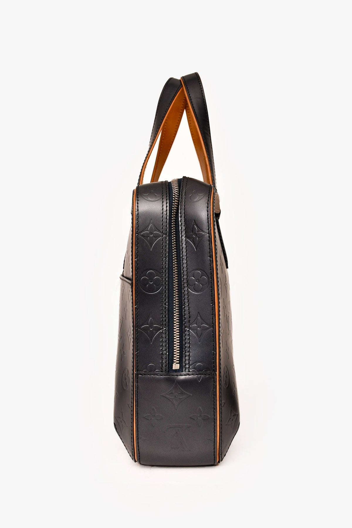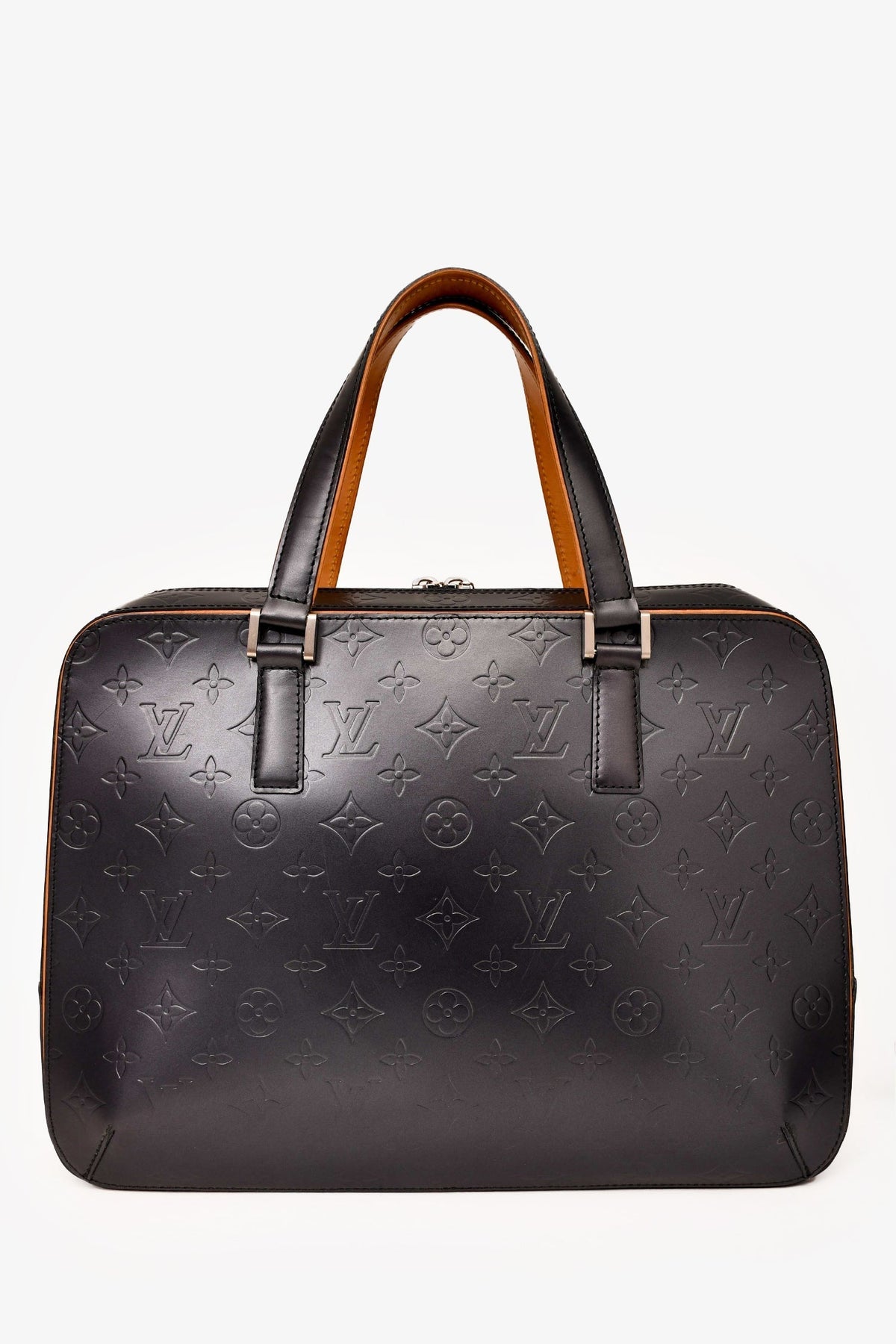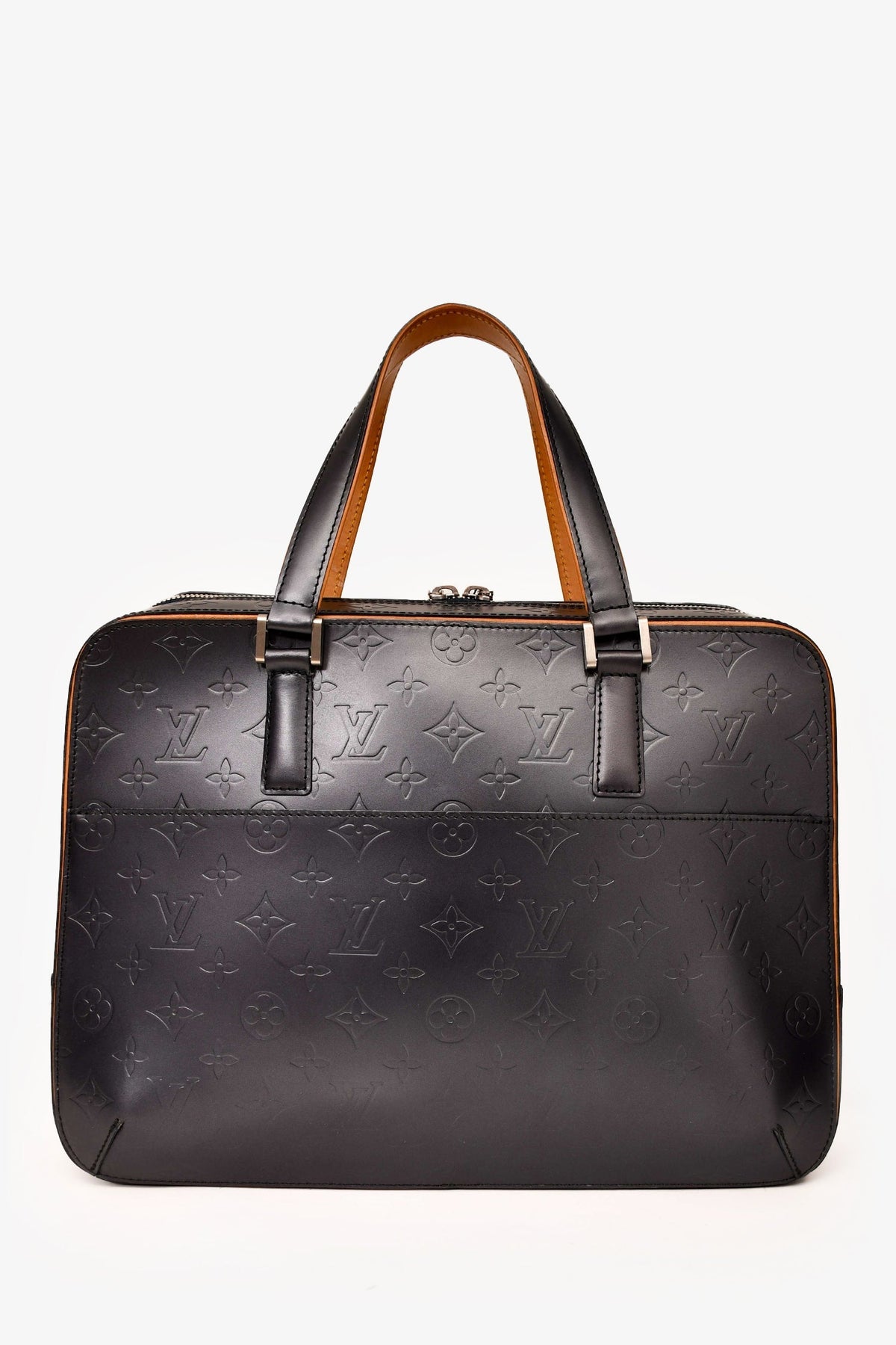 Louis Vuitton 2002 Matte Greyish Blue Leather Monogram Briefcase. Top zip-up closure. Dual top handles. Single exterior slip compartment. 2 interior slip pockets. Single interior zip pocket. Tonal textile interior lining. Silver-toned hardware. Tonal stitching.