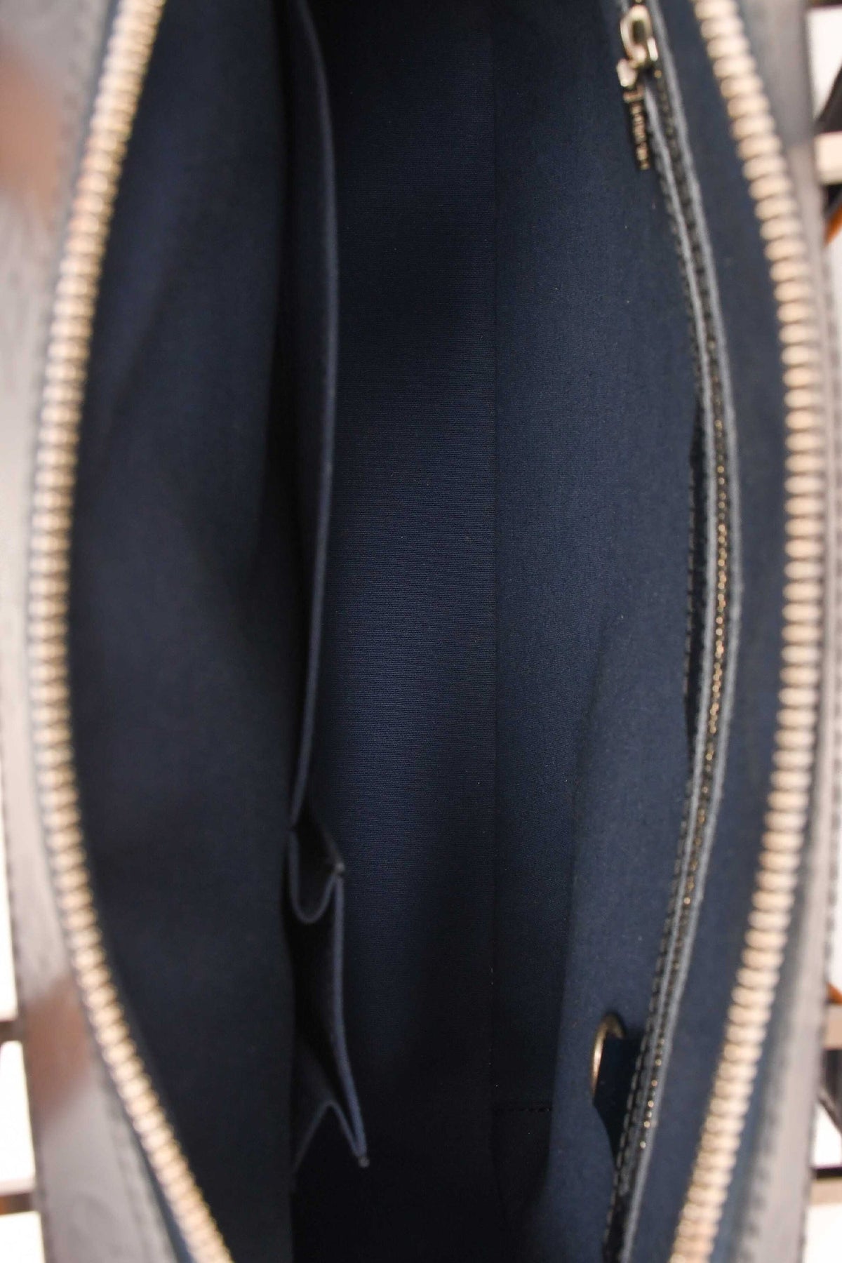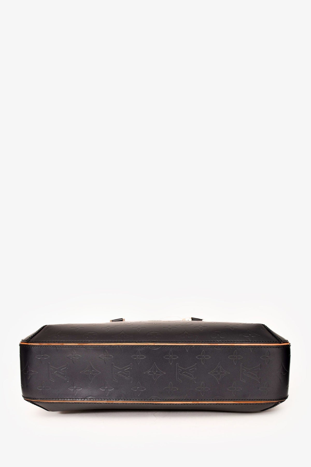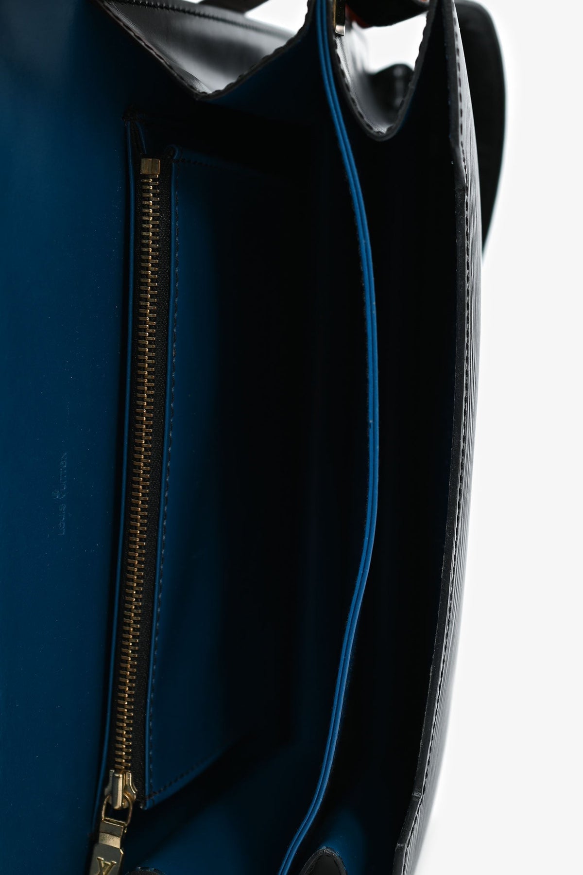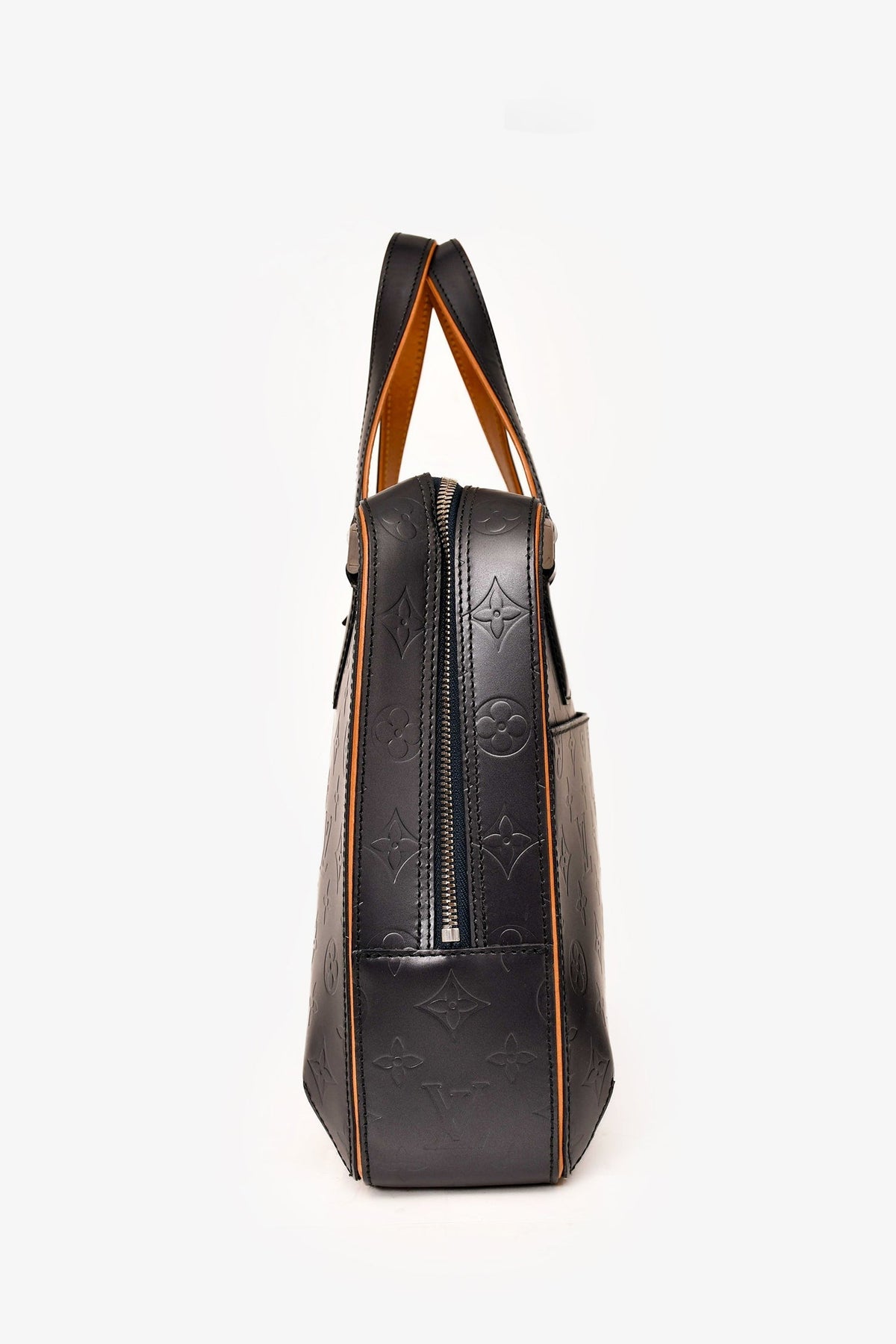 Louis Vuitton 2002 Matte Greyish Blue Leather Monogram Briefcase. Top zip-up closure. Dual top handles. Single exterior slip compartment. 2 interior slip pockets. Single interior zip pocket. Tonal textile interior lining. Silver-toned hardware. Tonal stitching.