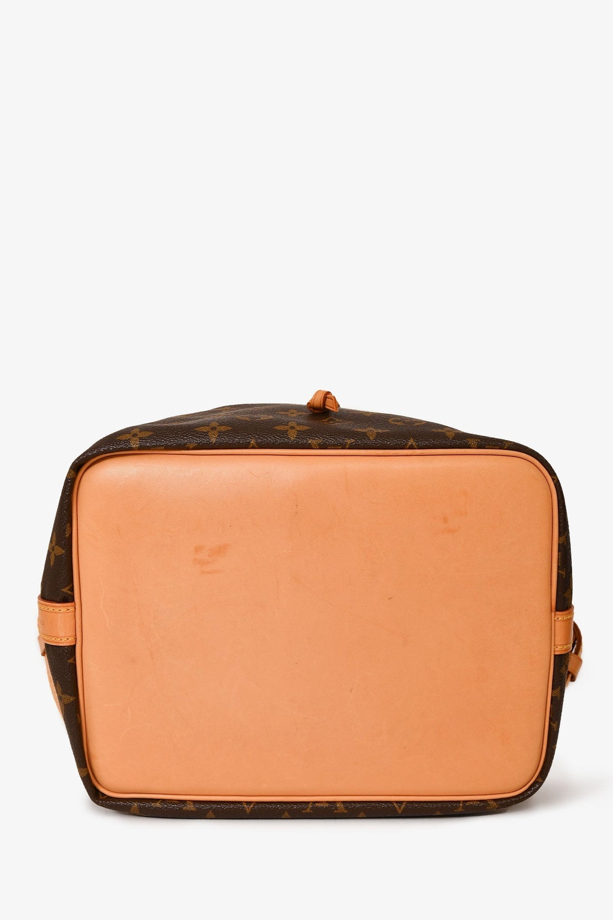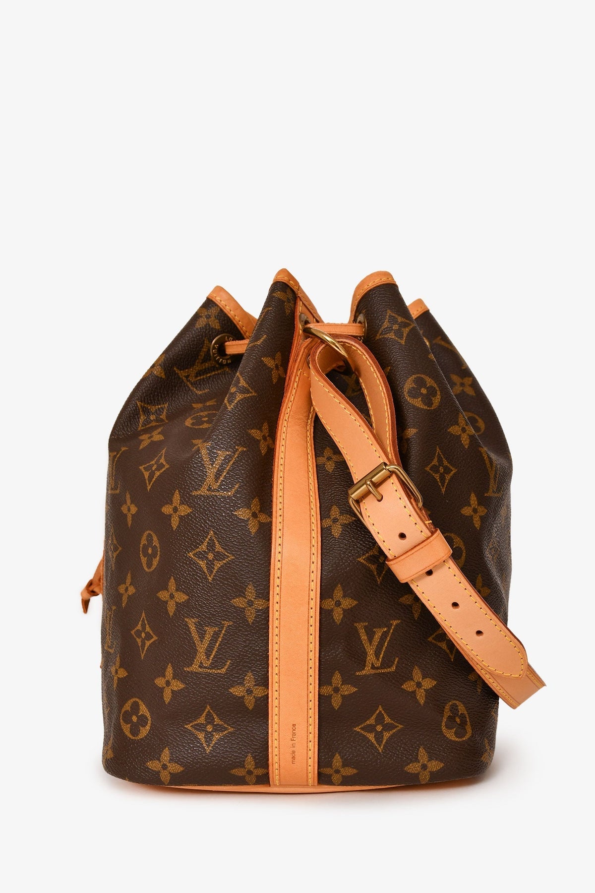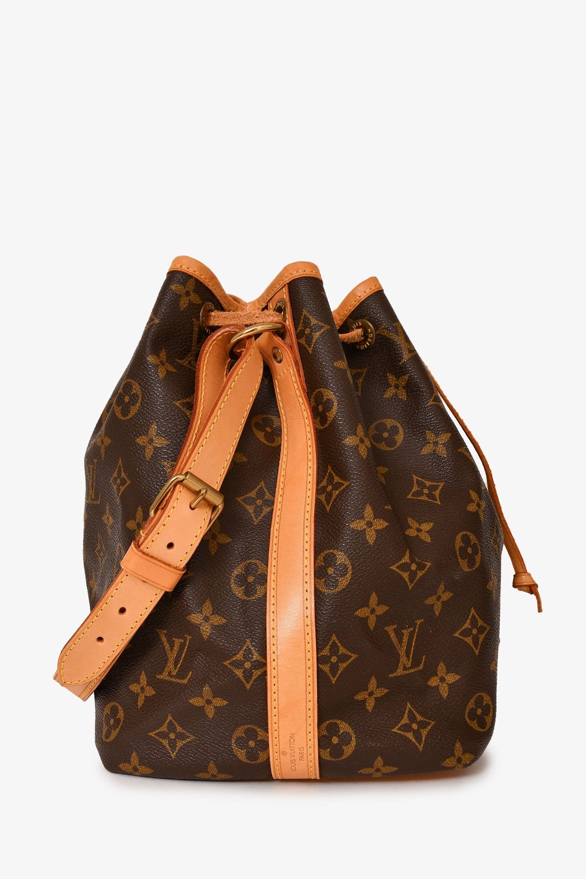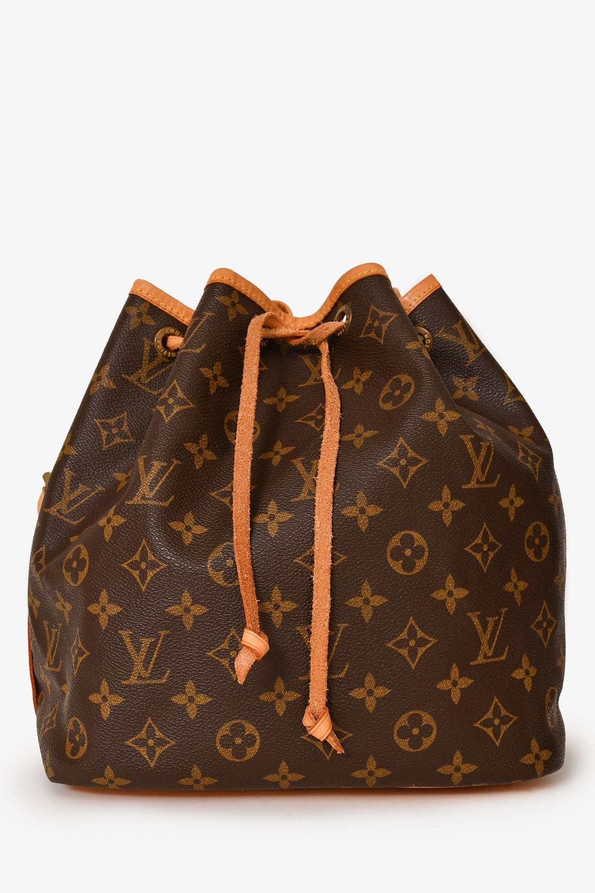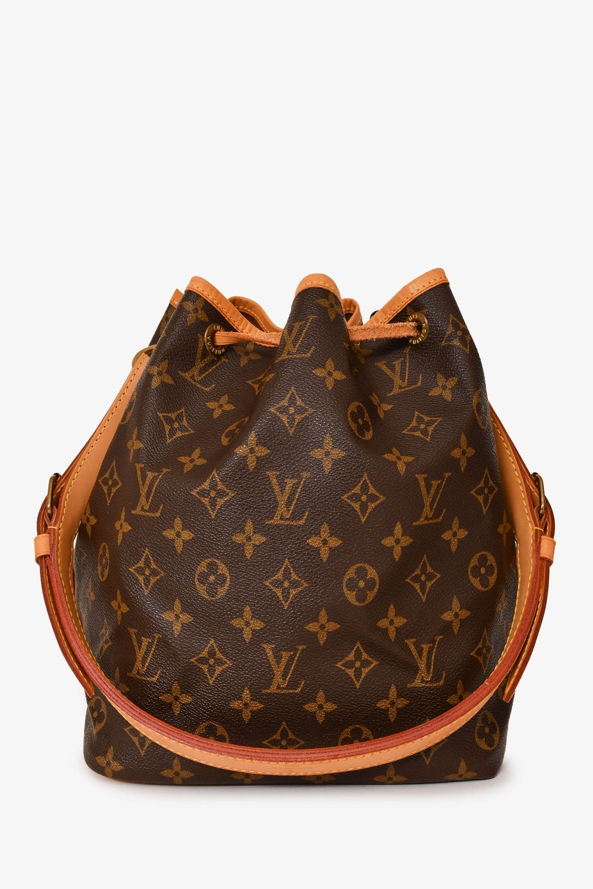 Regular price $1,840.00 Sale price $490.00 Save $1,350.00Louis Vuitton 1998 Brown Leather/ Canvas Monogram Petit Noé Bucket Bag. Top drawstring closure. Adjustable strap. Tonal textile interior lining. Gold-toned hardware. Tonal stitching.
