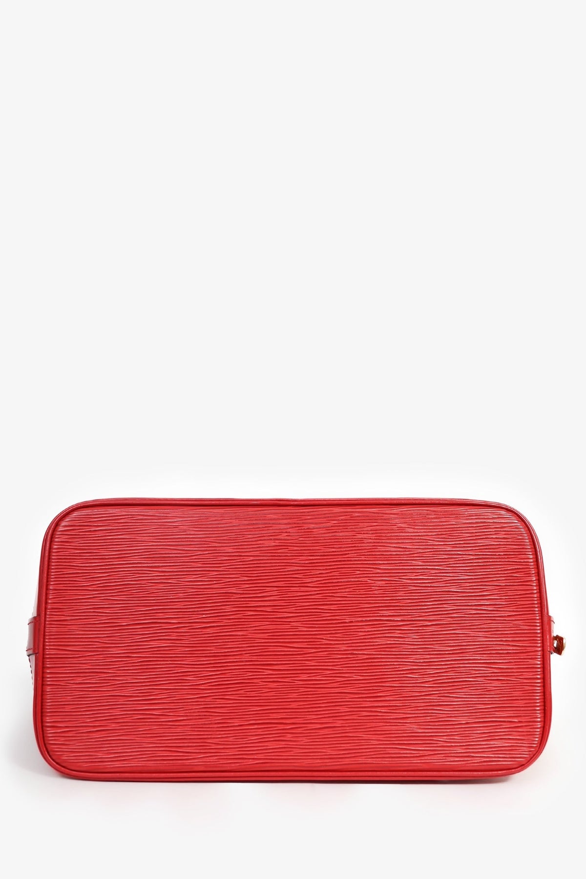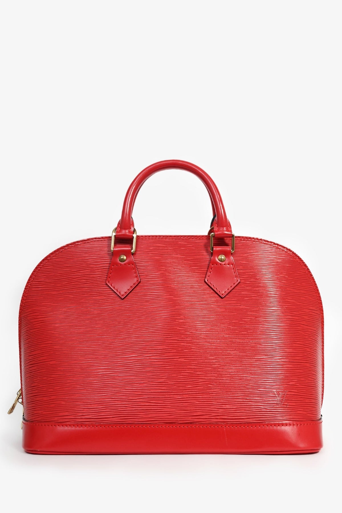 Louis Vuitton 1996 Red Epi Leather 'Alma' PM Top Handle. Gold-tone hardware. Dual top handles. Coated trimming. Lined interior with a slip compartment. Tonal stitching.