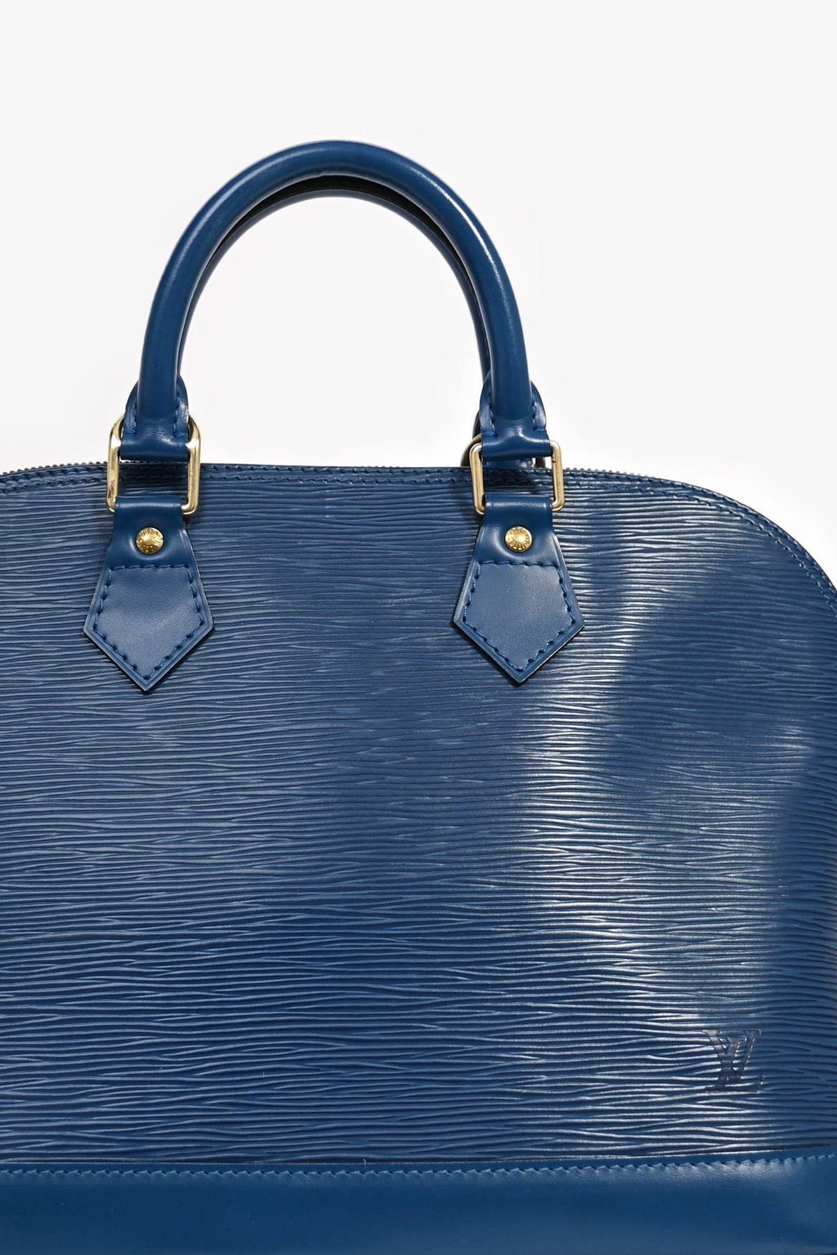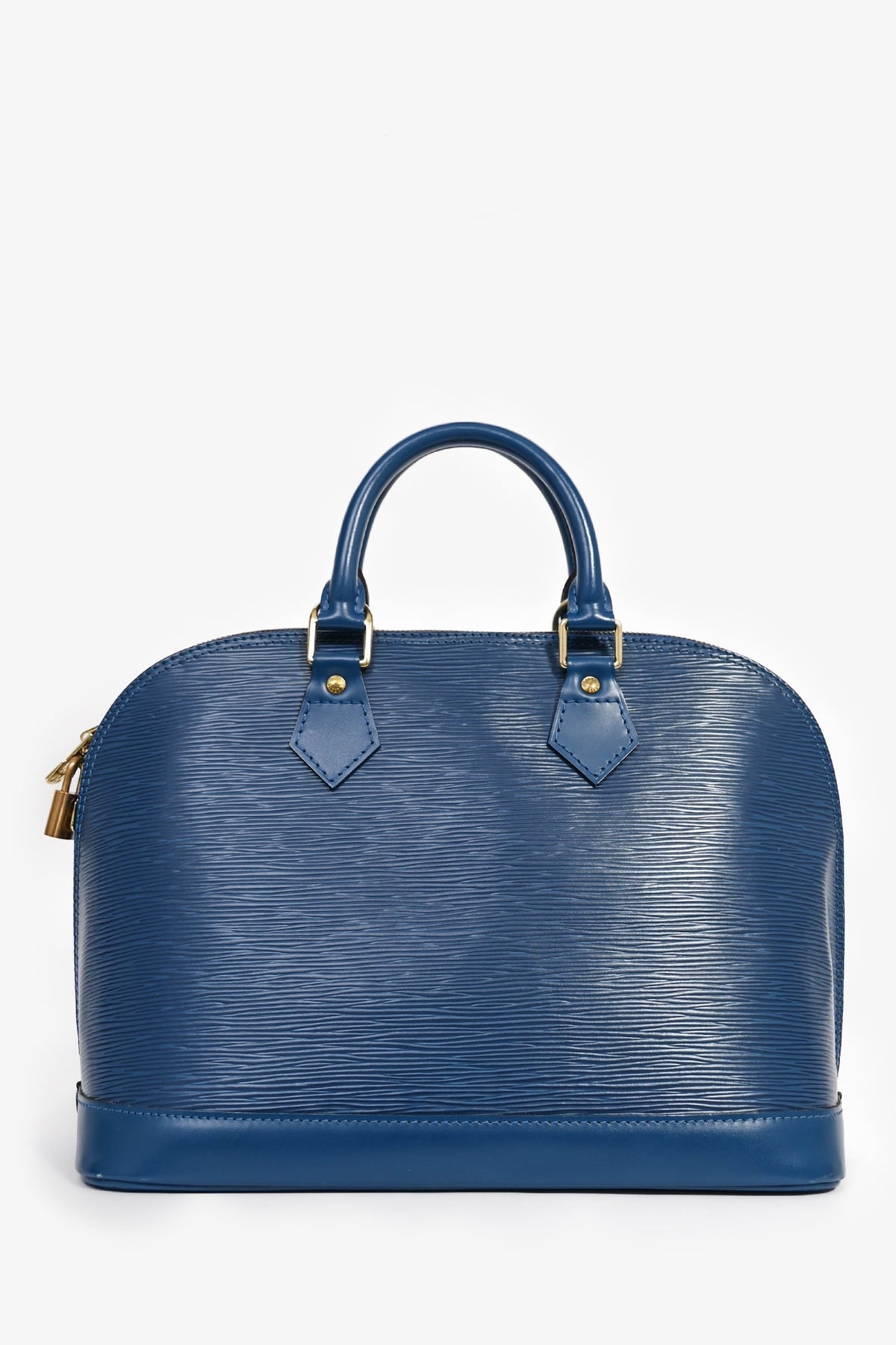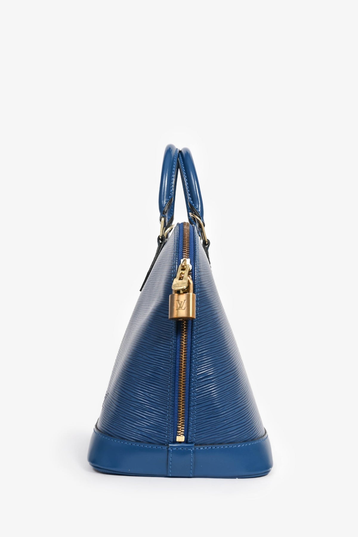 Louis Vuitton 1997 Blue Epi Leather 'Alma' PM Top Handle. Dual top handles. Gold-tone hardware. Attached lock. Suede lined interior with a slip compartment. Coated trimming. Tonal stitching.