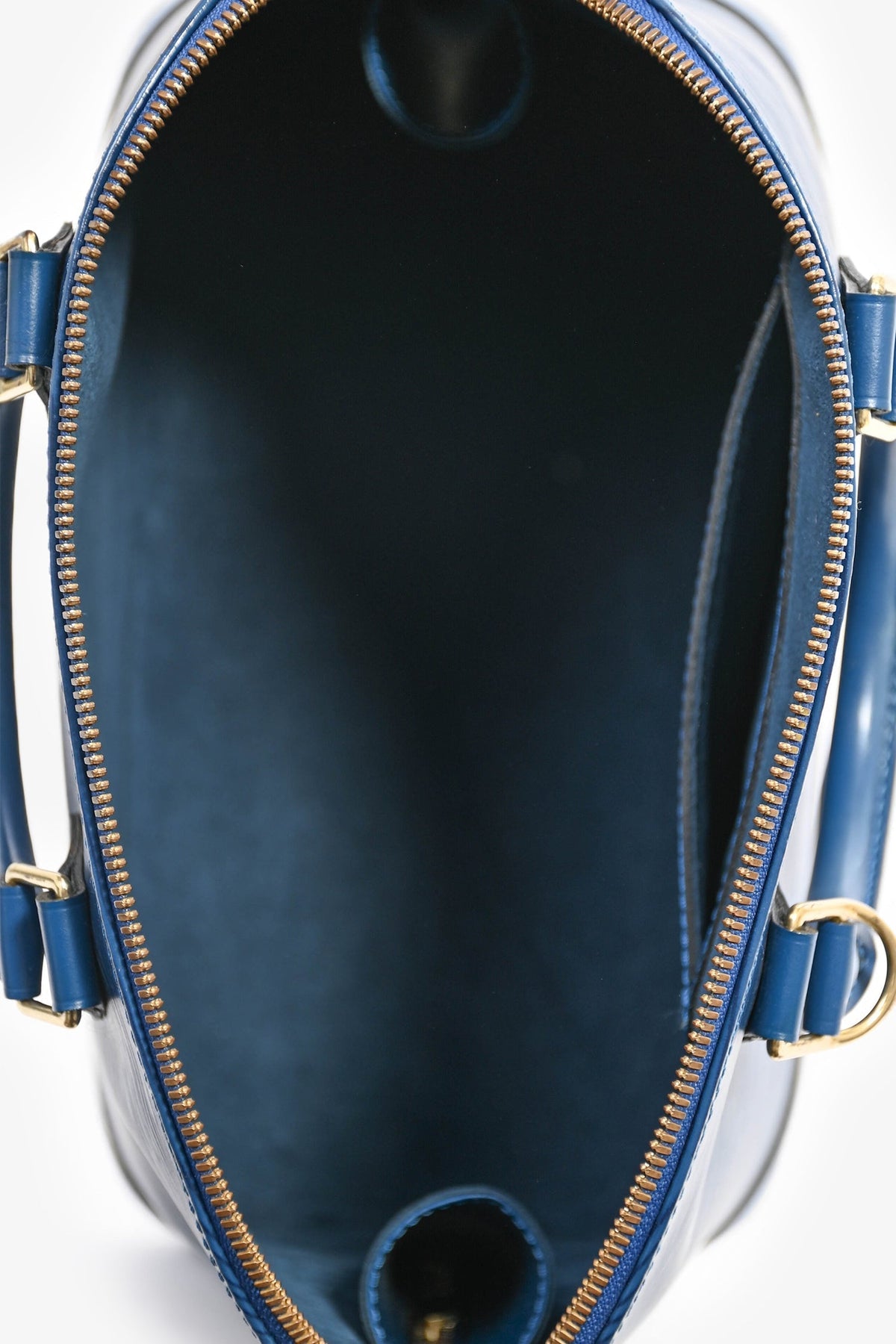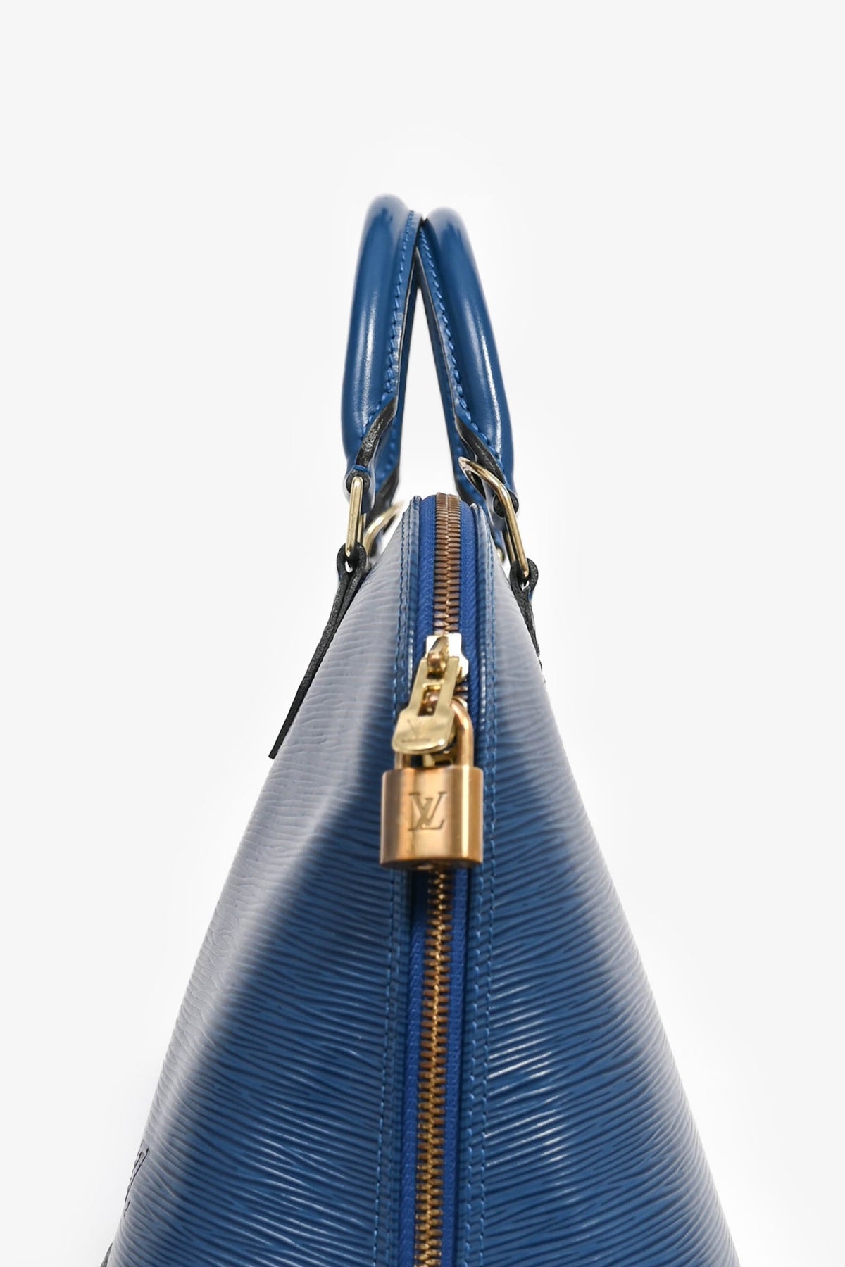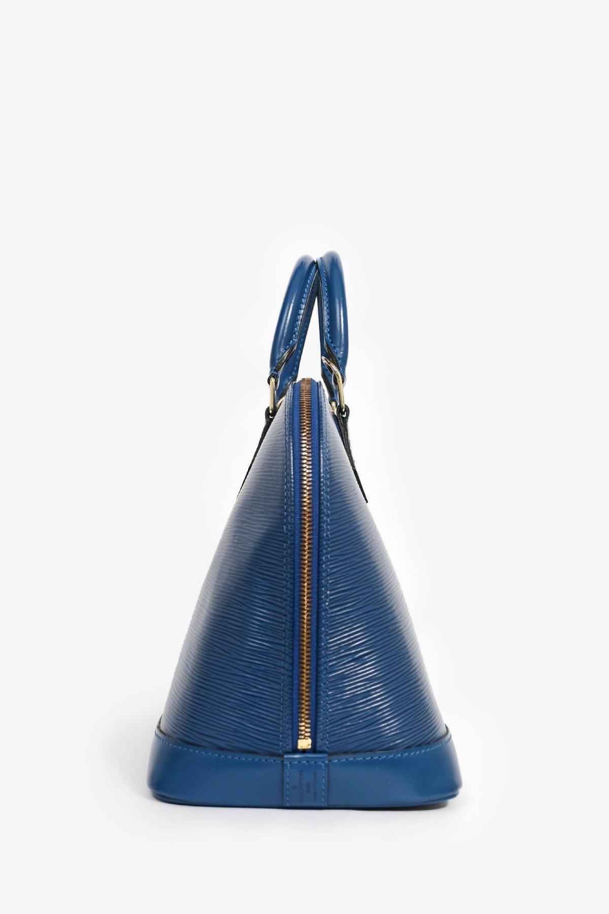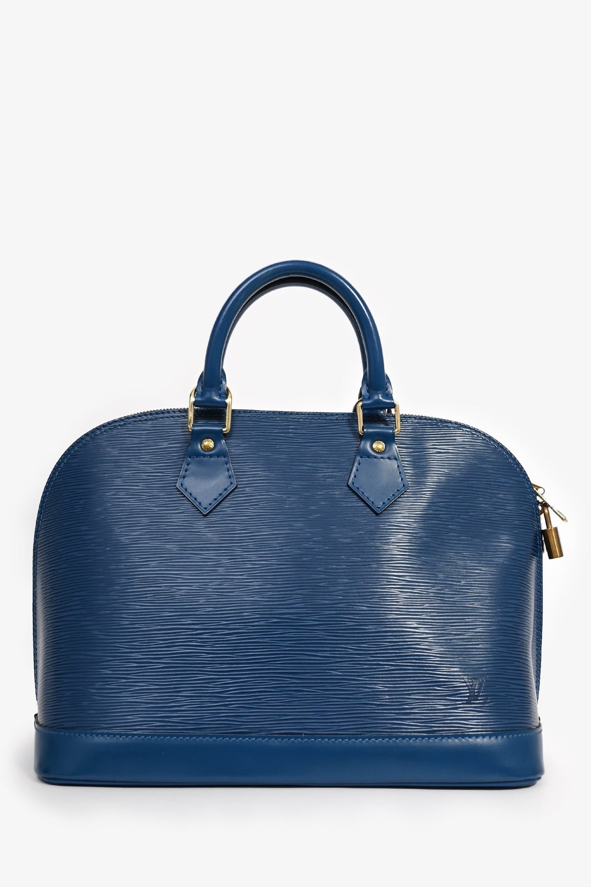 Louis Vuitton 1997 Blue Epi Leather 'Alma' PM Top Handle. Dual top handles. Gold-tone hardware. Attached lock. Suede lined interior with a slip compartment. Coated trimming. Tonal stitching.