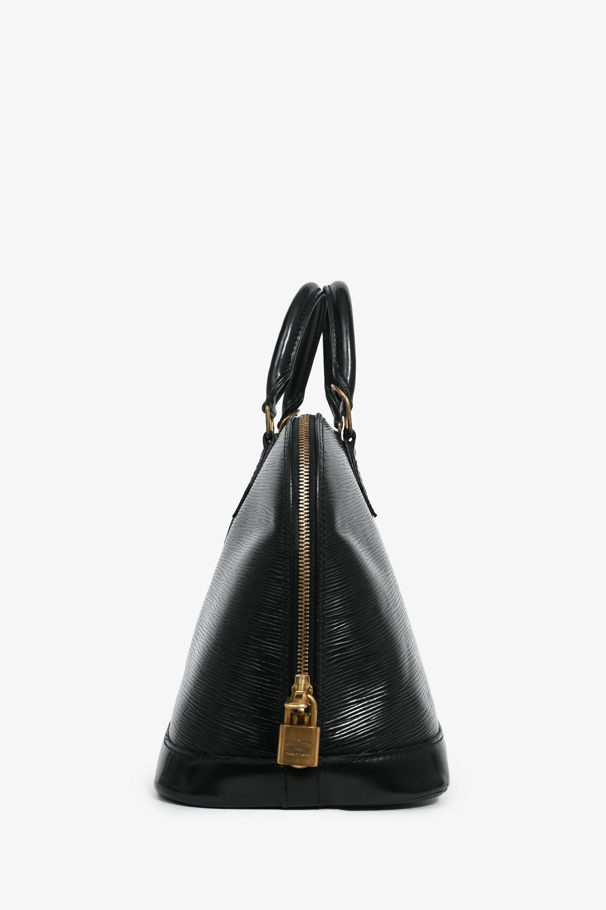 Louis Vuitton 1998 Black Epi Leather Alma MM Top Handle. 2 top handles. Gold-tone hardware. Lined suede interior with a slip compartment. Comes with a lock. Smooth leather trimming. Tonal stitching.