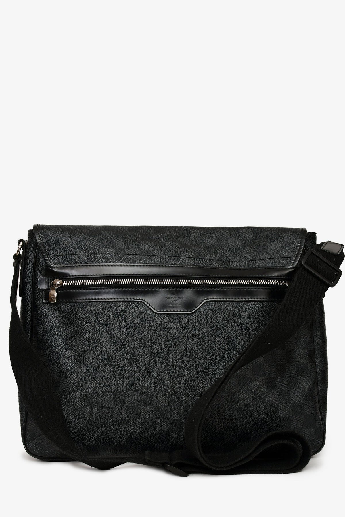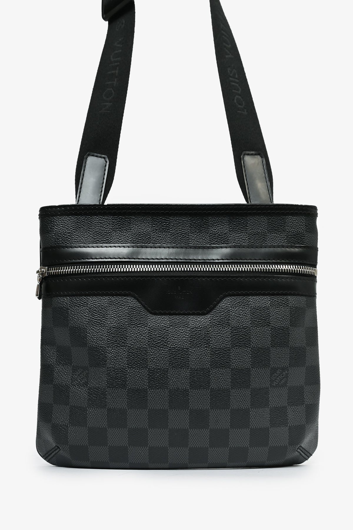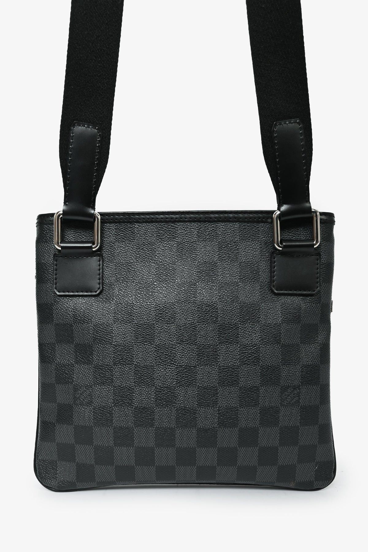 Louis Vuitton 2012 Damier Graphite Thomas Crossbody Bag. Front zip pocket. Top zip closure. Tonal textile interior lining. 2 interior wall slip pockets. Adjustable strap. Silver-tone hardware.
