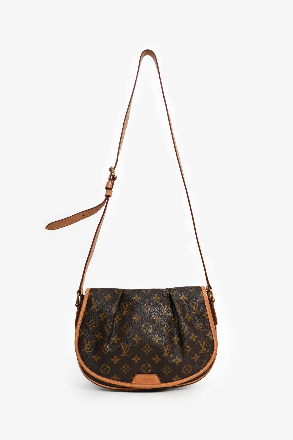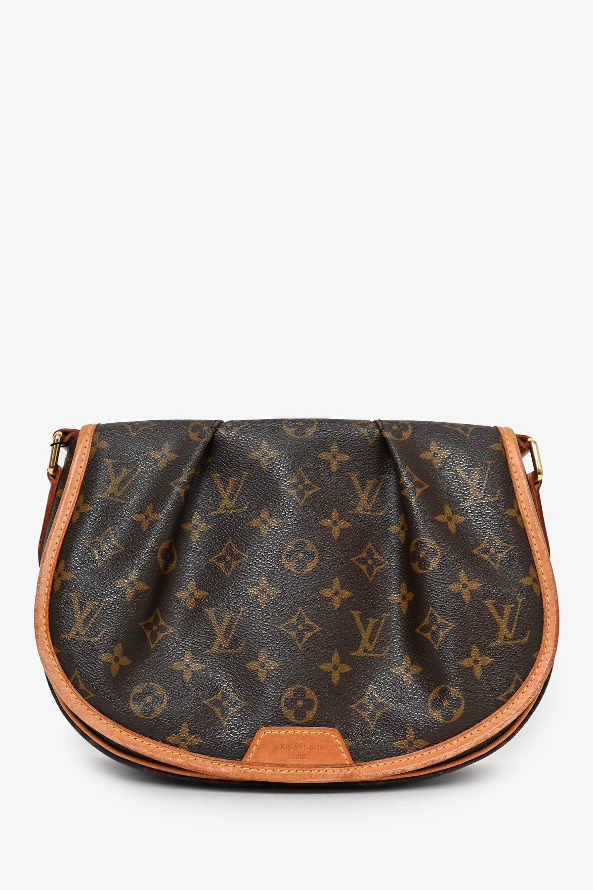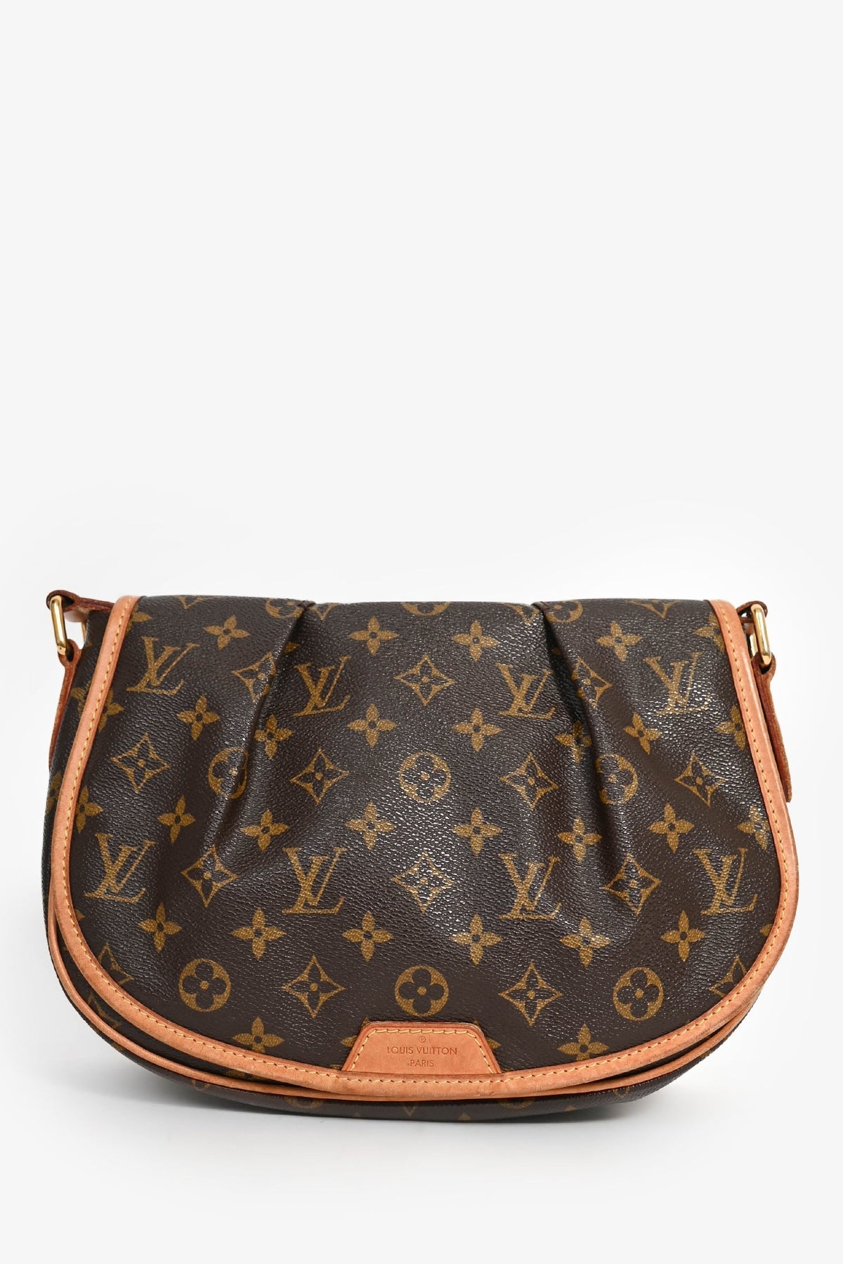 Louis Vuitton 2011 Monogram Leather Trimmed Menilmontant PM Crossbody Bag. Adjustable strap. Fold over flap with magnetic closure. 2 slip pockets under flap. 1 interior zip pocket. Contrast stitching.