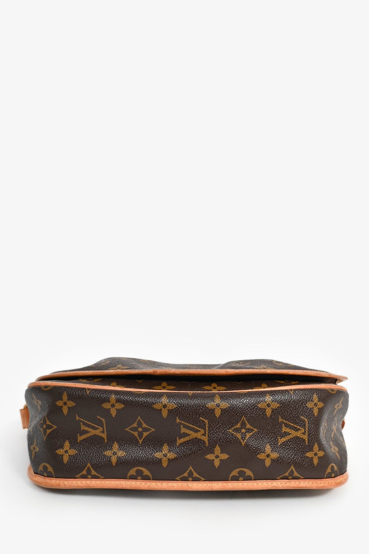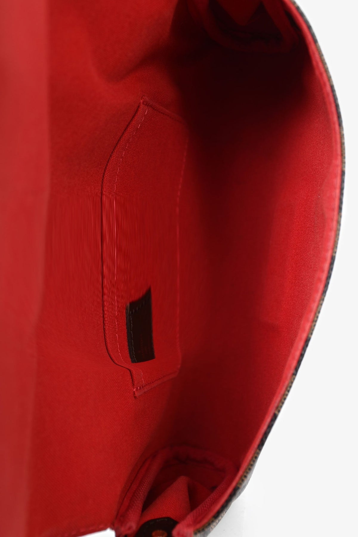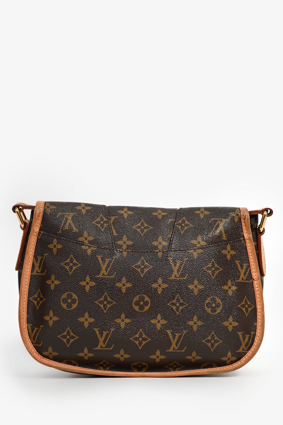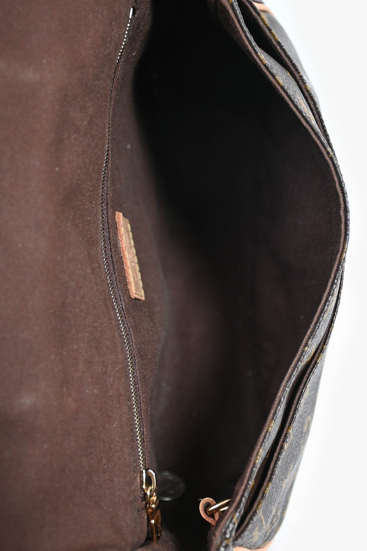 Louis Vuitton 2011 Monogram Leather Trimmed Menilmontant PM Crossbody Bag. Adjustable strap. Fold over flap with magnetic closure. 2 slip pockets under flap. 1 interior zip pocket. Contrast stitching.