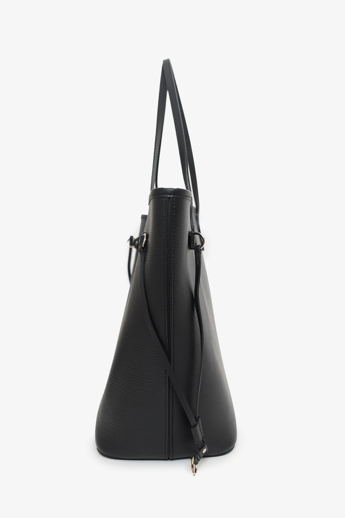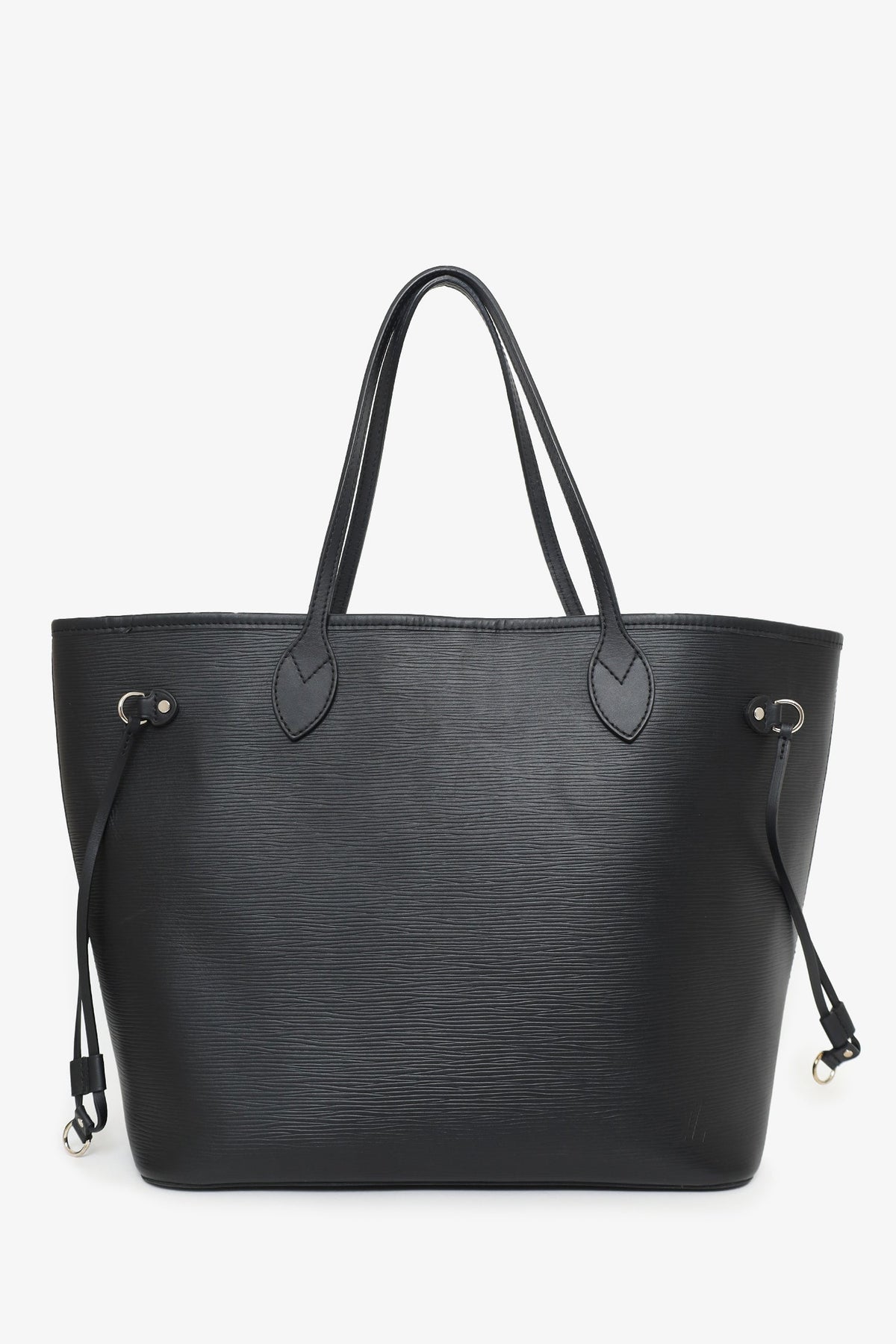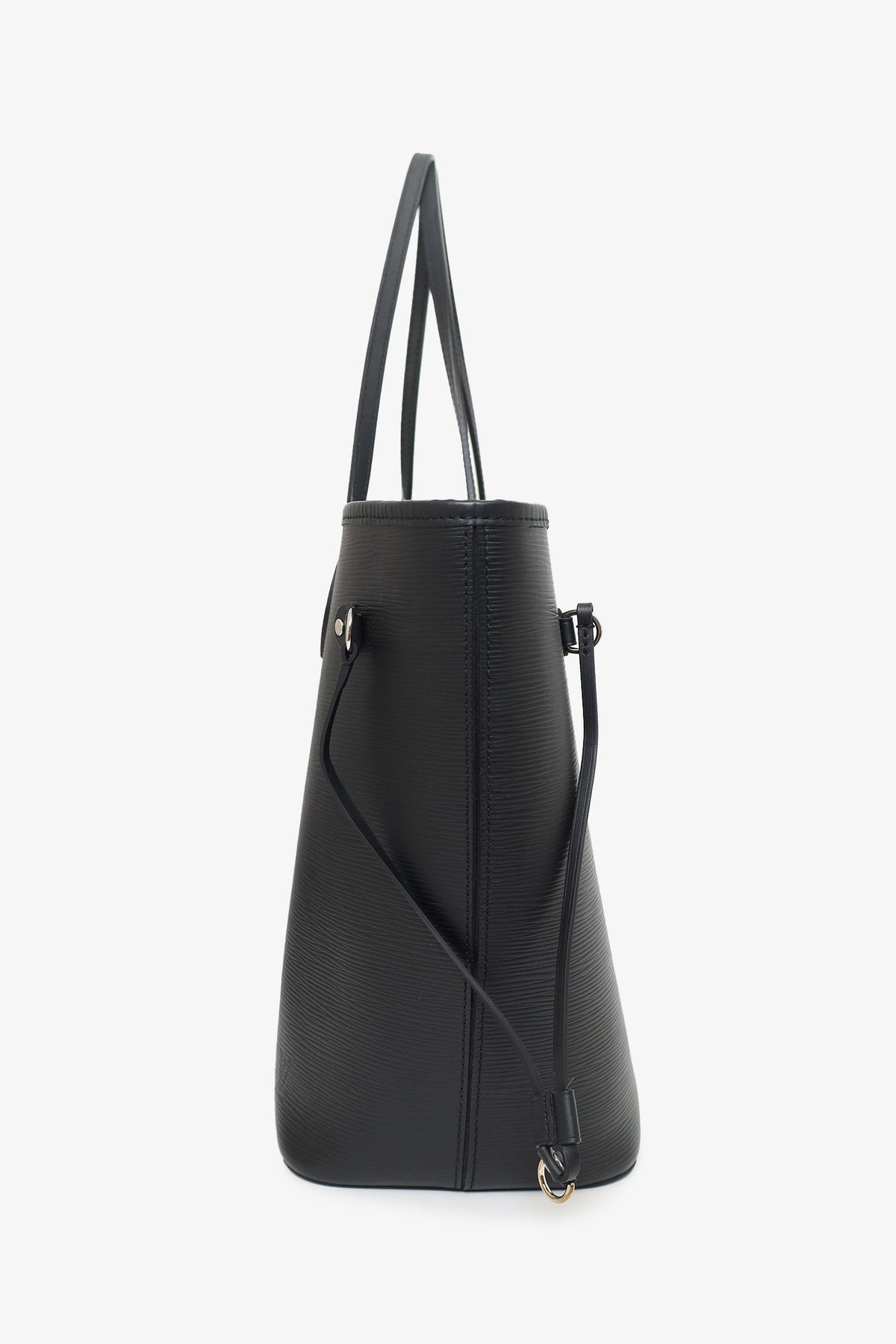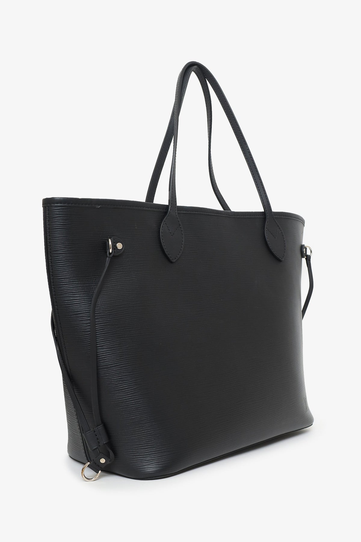 Louis Vuitton 2013 Black Epi Leather Neverfull MM Tote. Open top with hook and clasp closure. Open interior; detachable interior pouch with clasp closure; top zipper closure and single interior wall slip pocket. Suede-lined interior. Silver-tone hardware. Tonal stitching.