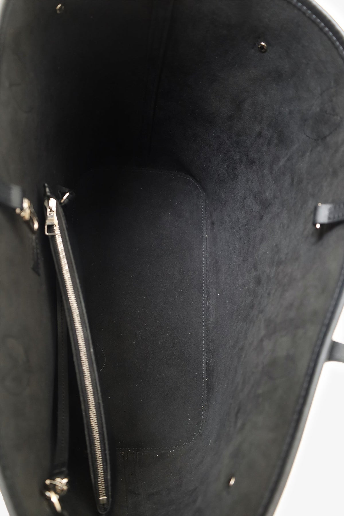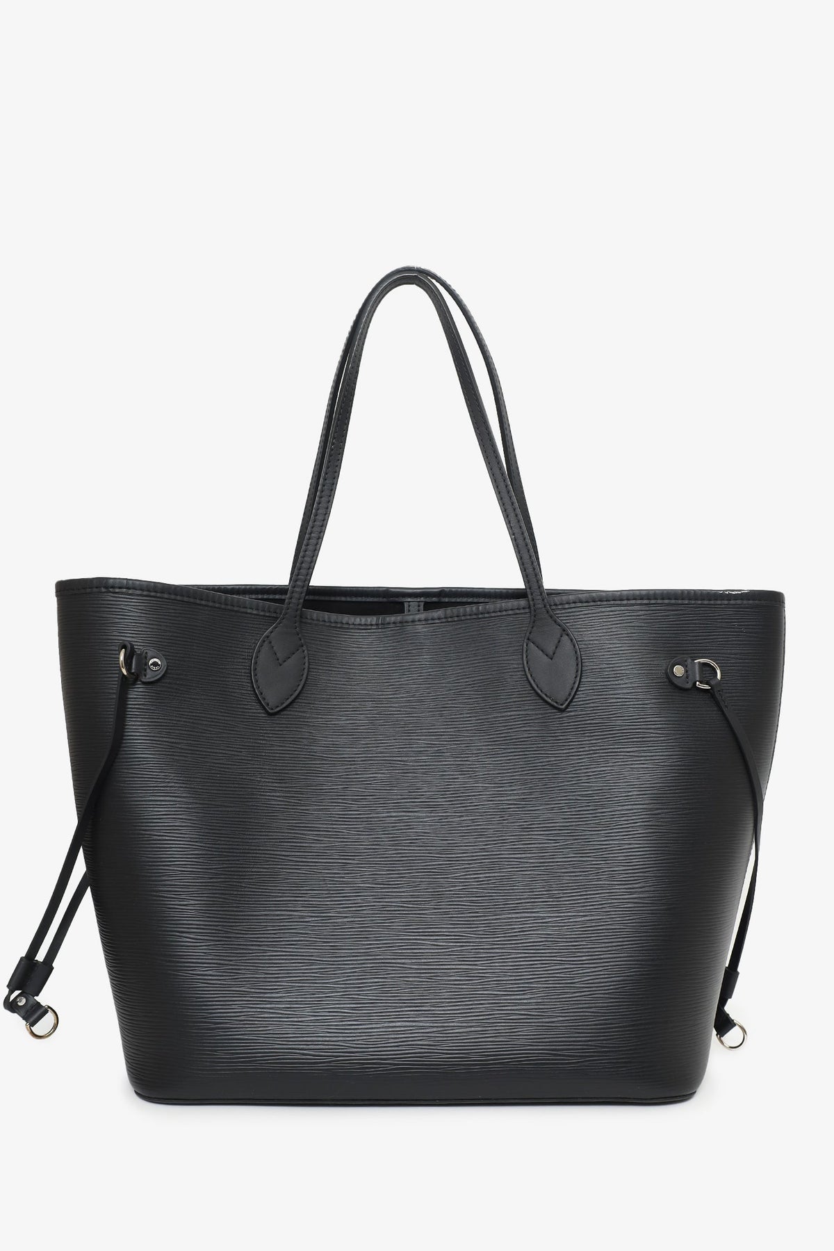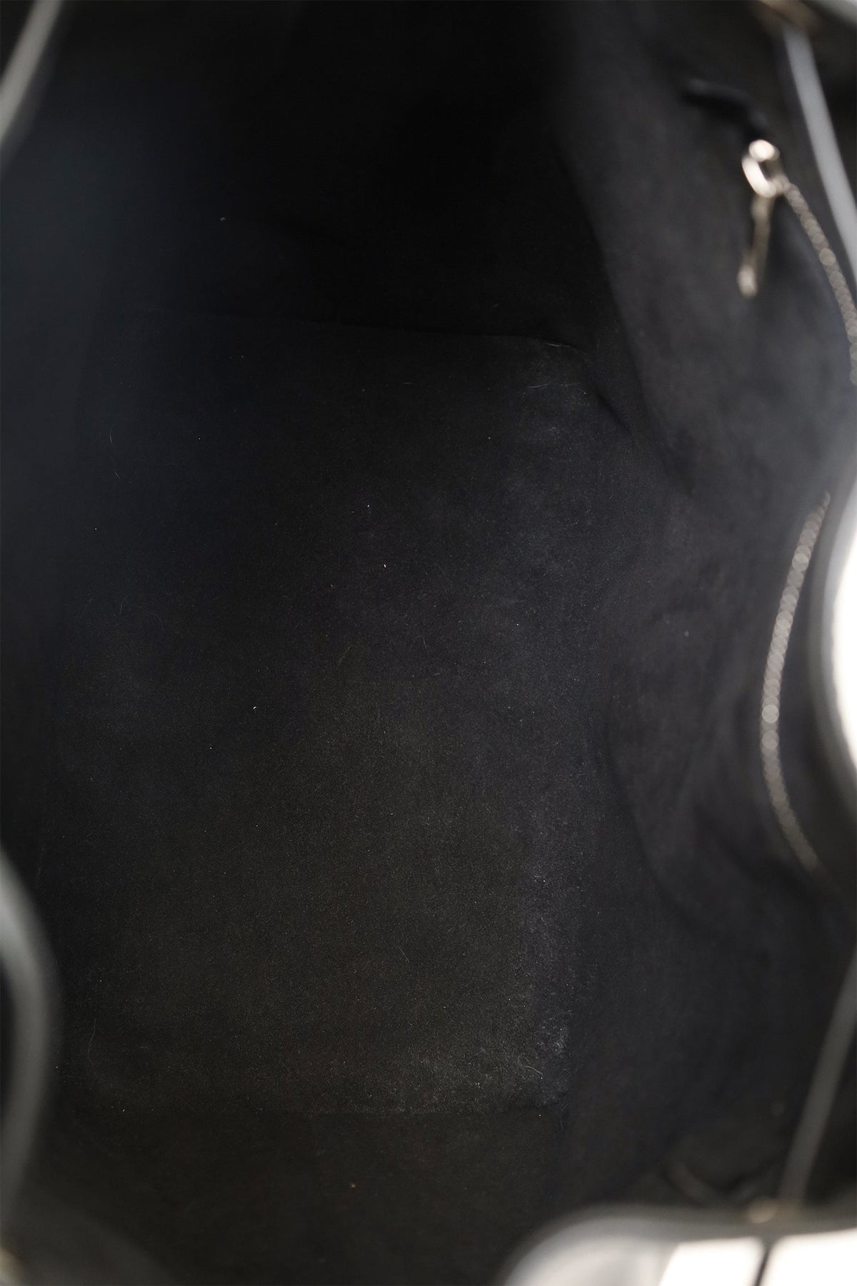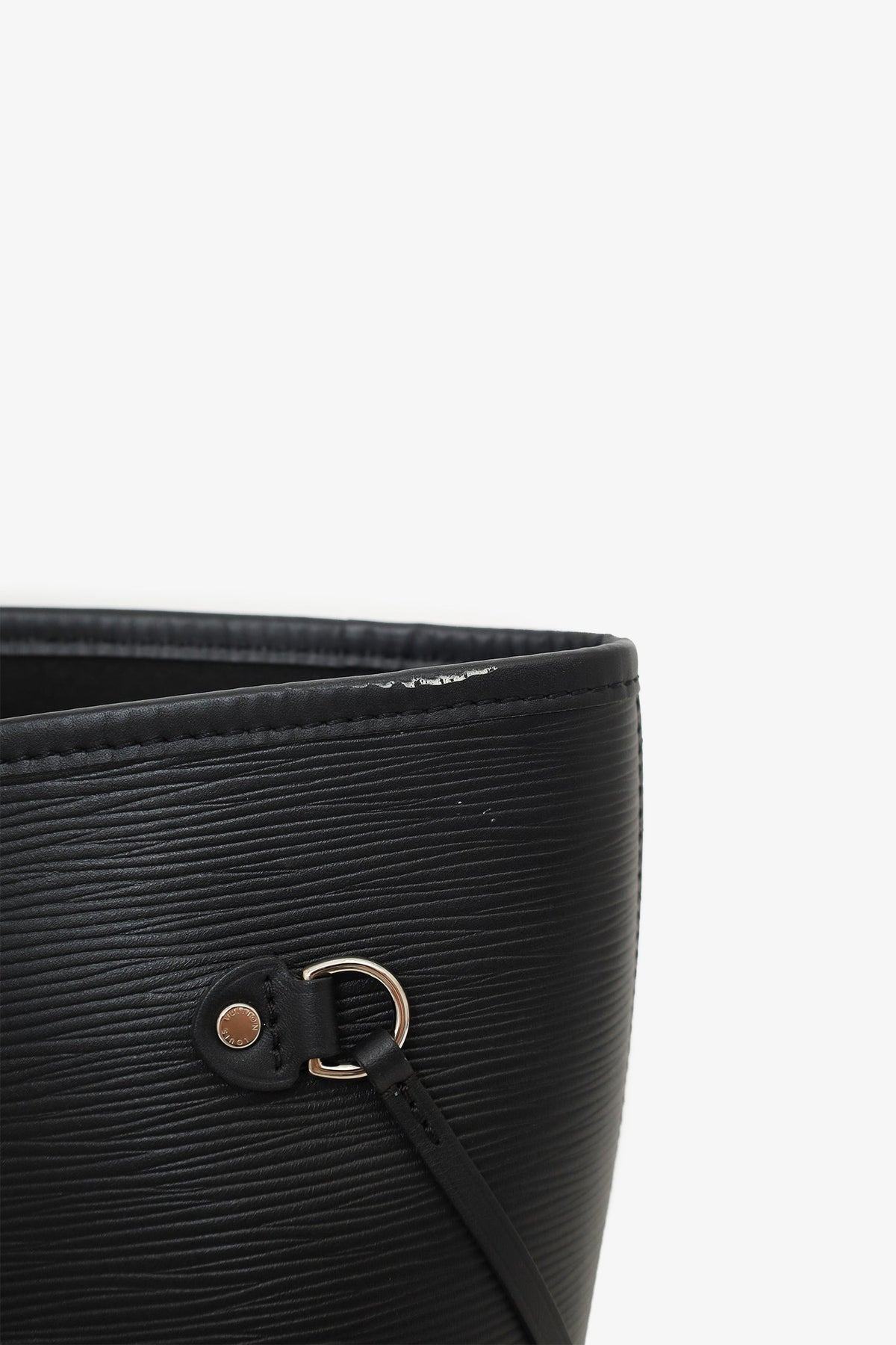 Louis Vuitton 2013 Black Epi Leather Neverfull MM Tote. Open top with hook and clasp closure. Open interior; detachable interior pouch with clasp closure; top zipper closure and single interior wall slip pocket. Suede-lined interior. Silver-tone hardware. Tonal stitching.