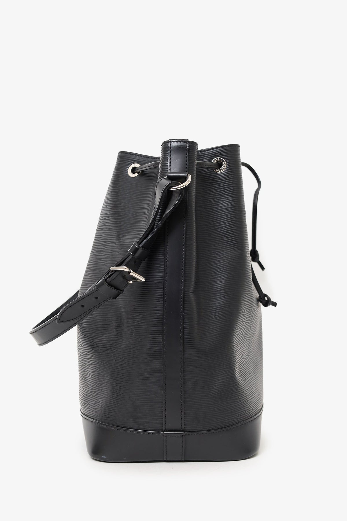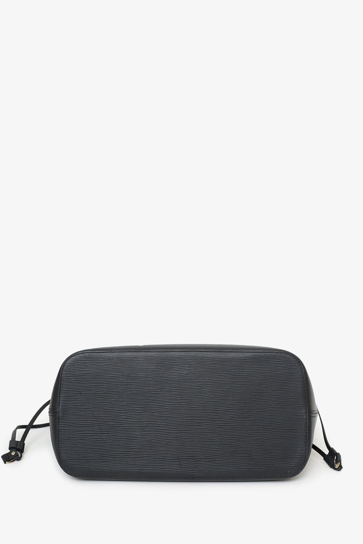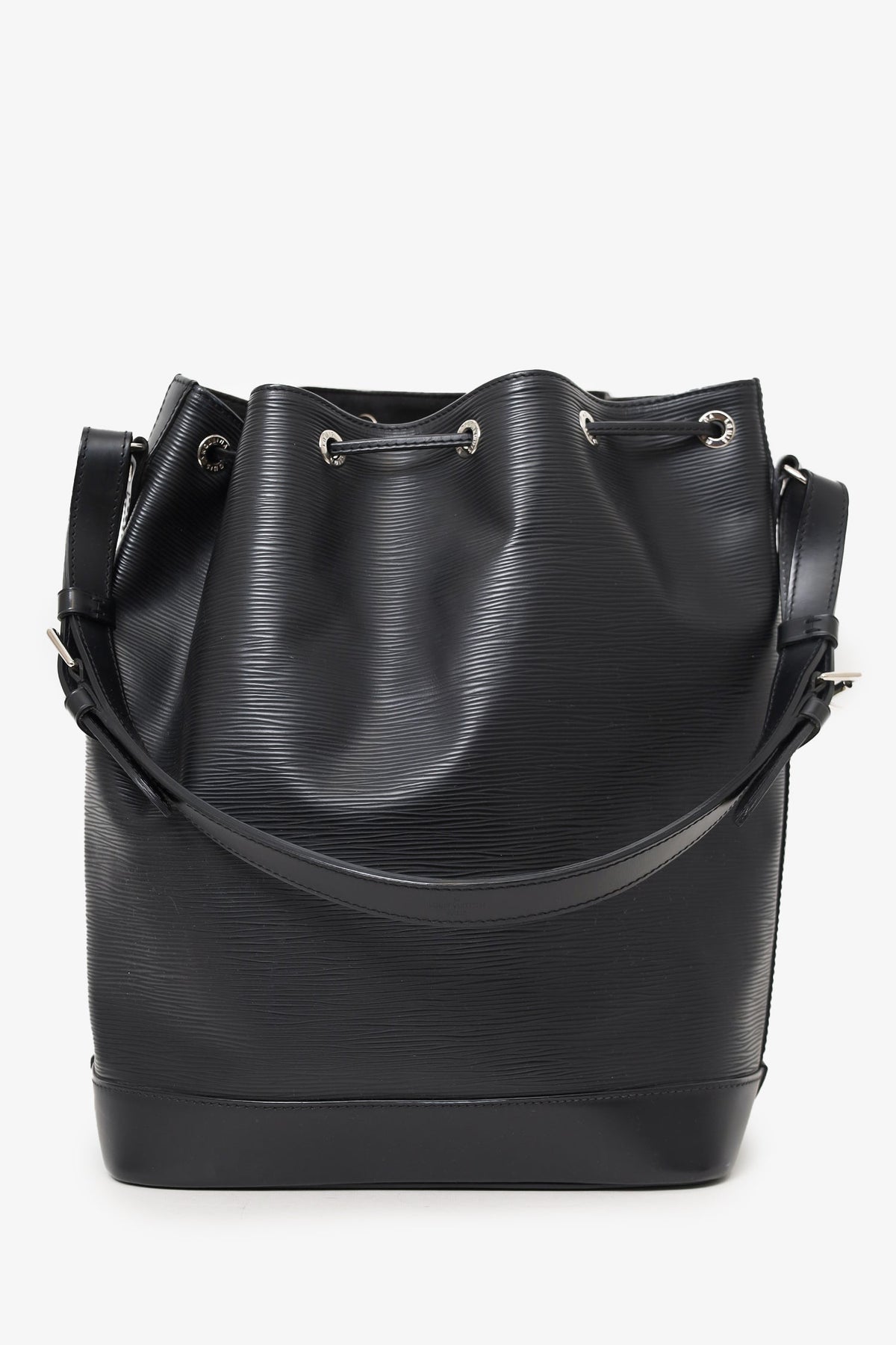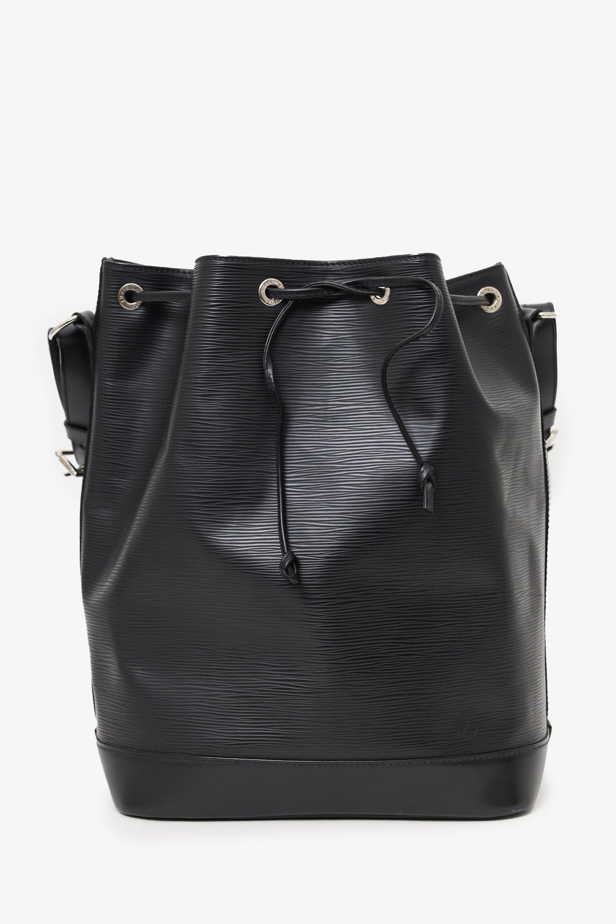 Louis Vuitton 2012 Black Epi Leather Noe Bag. Top adjustable handle. Drawstring tie closure. Interior wall pocket with zip closure. Silver-tone hardware. Tonal stitching