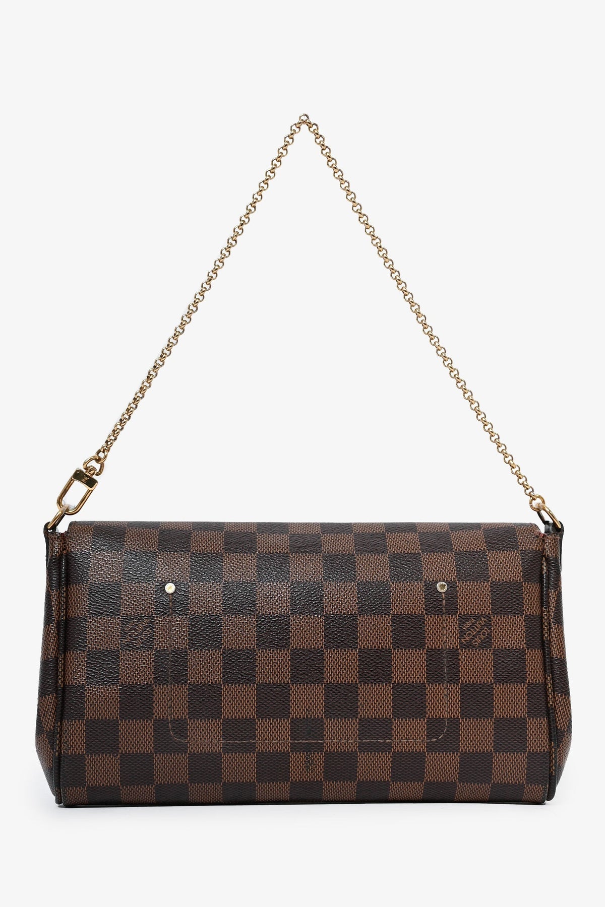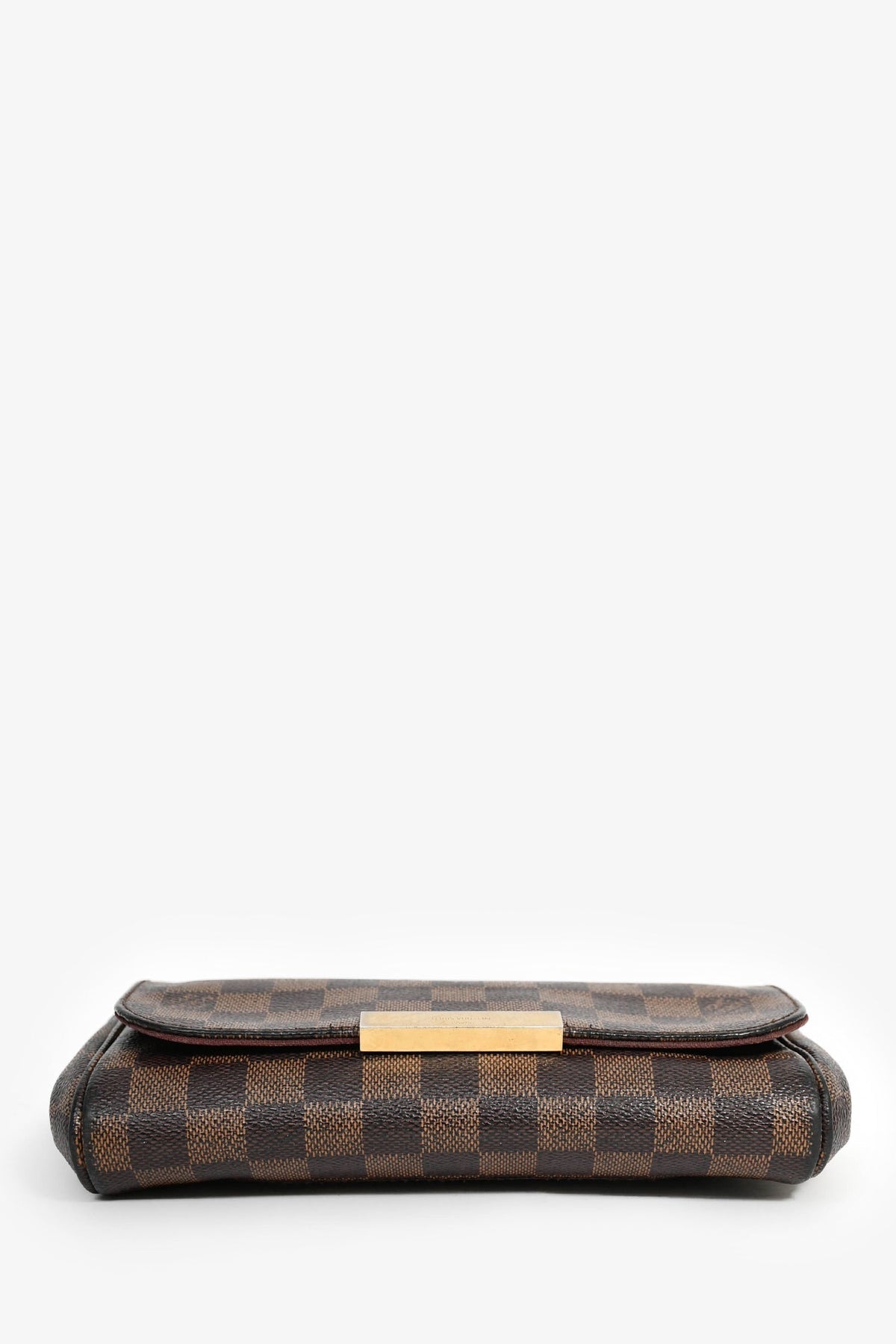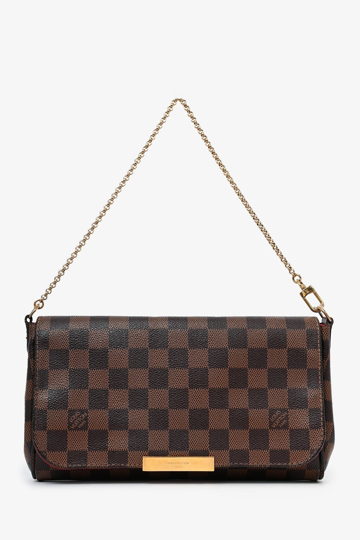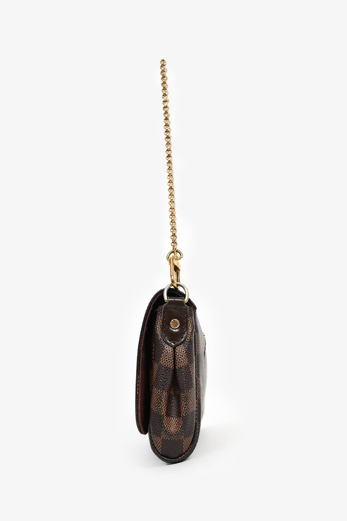 Louis Vuitton 2014 Damier Ebene Favorite Pochette on Chain. Fold-over flap with a magnetic closure. Gold-tone hardware. Coated Damier Ebene canvas. Chain-link shoulder strap. Coated trimming. Lined interior with a wall pocket. Comes with an attachable strap. Tonal stitching.