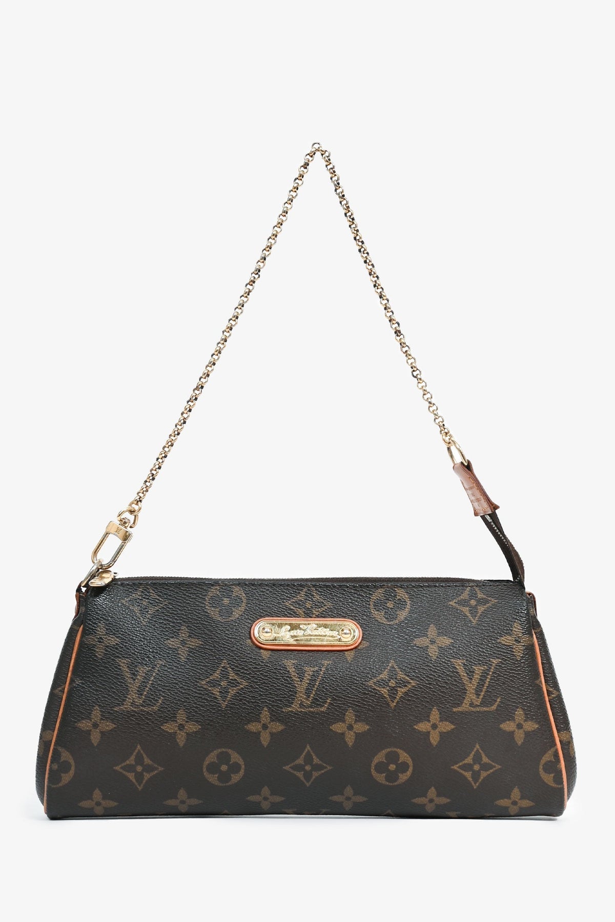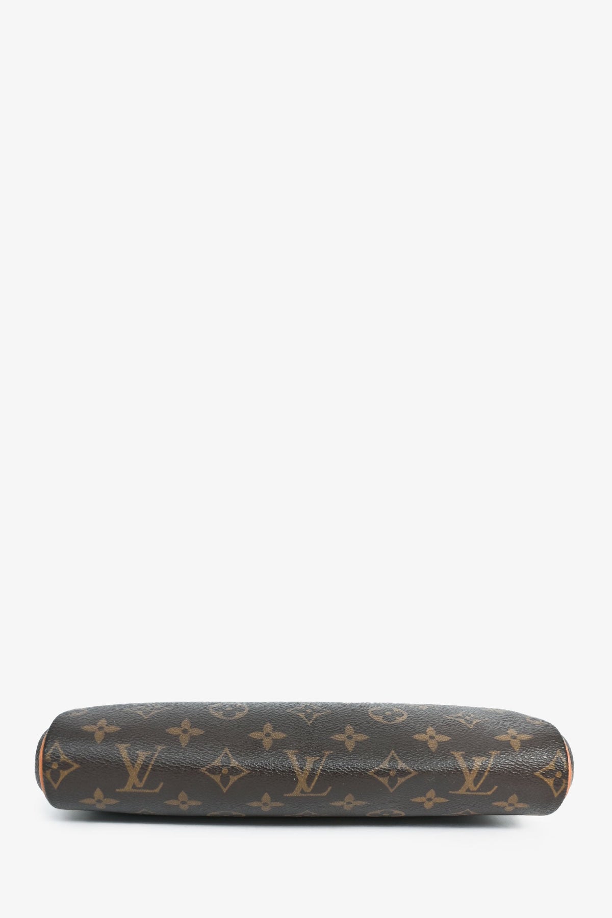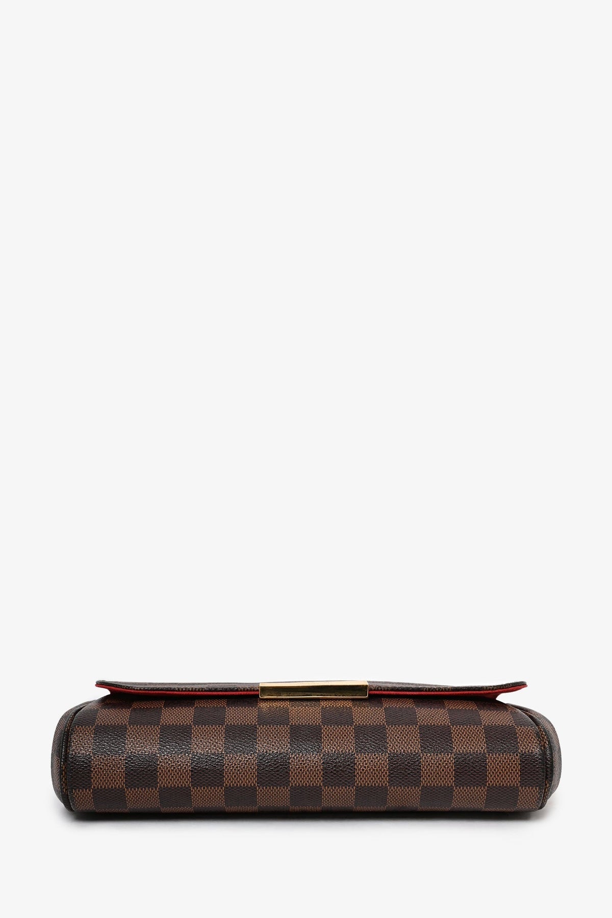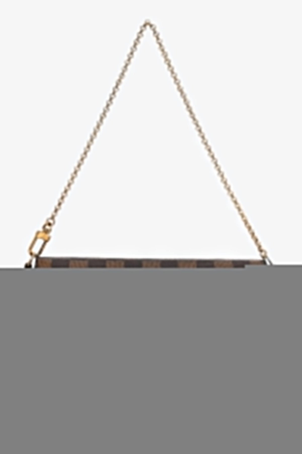 Louis Vuitton 2014 Damier Ebene Favorite Pochette on Chain. Fold-over flap with a magnetic closure. Gold-tone hardware. Coated Damier Ebene canvas. Chain-link shoulder strap. Coated trimming. Lined interior with a wall pocket. Comes with an attachable strap. Tonal stitching.