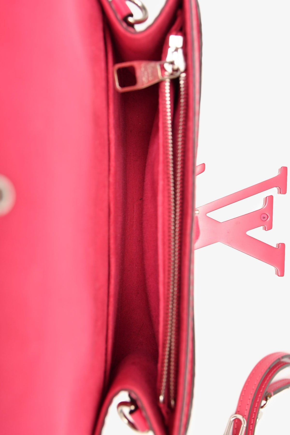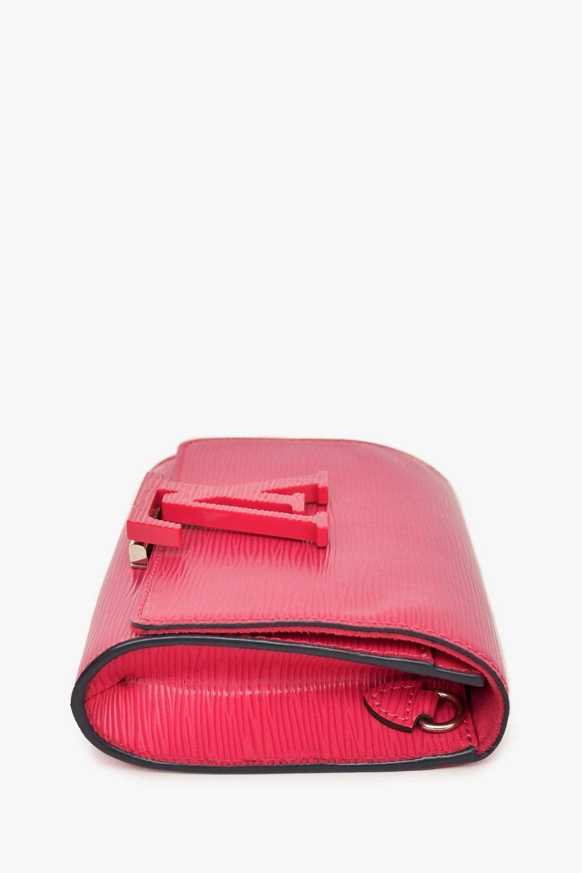 Louis Vuitton 2014 Fuchsia Epi Leather Louise Clutch With Strap. Top flap with hardware closure. 4 interior pockets; one with zipper closure. Silver-tone hardware. Tonal stitching.