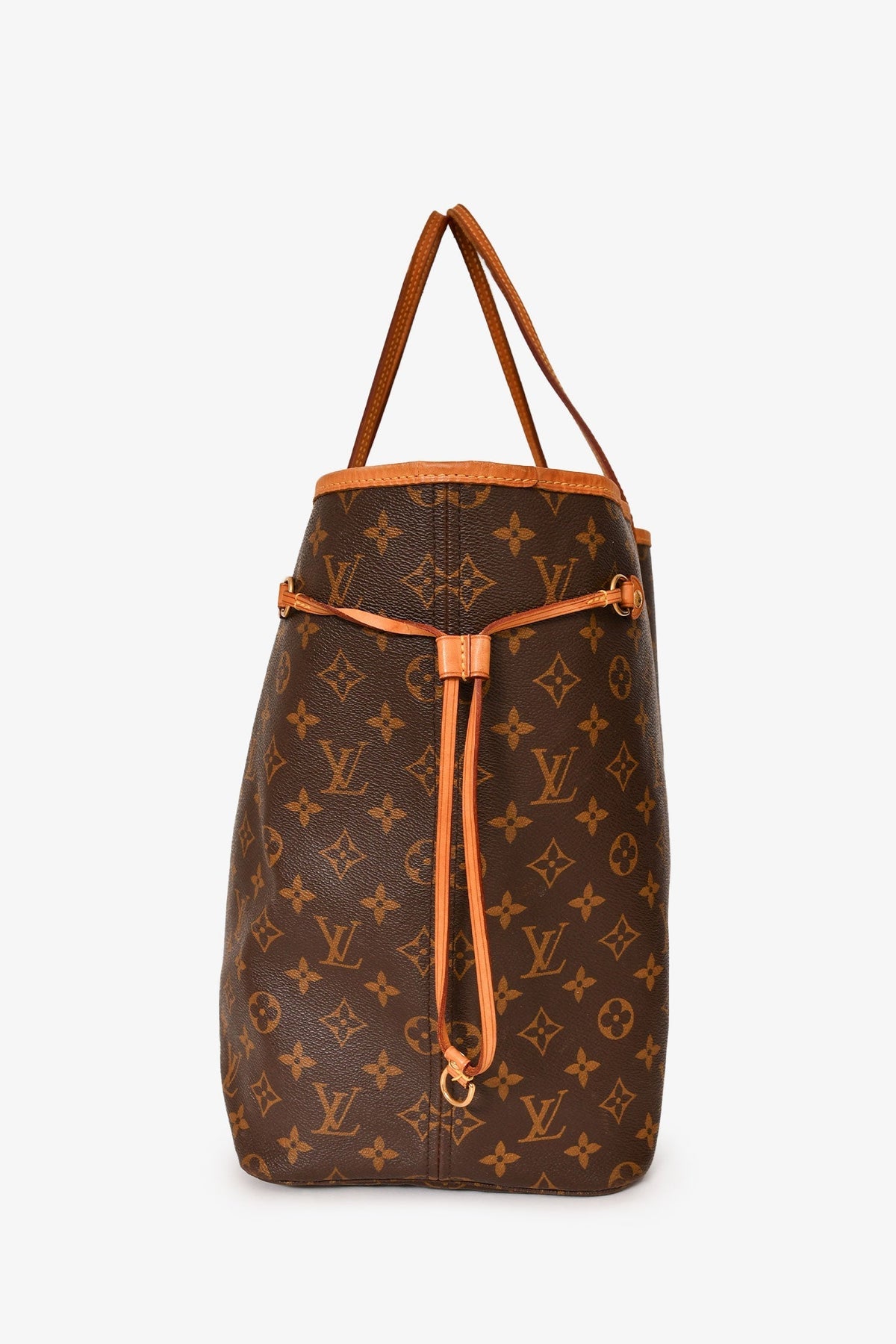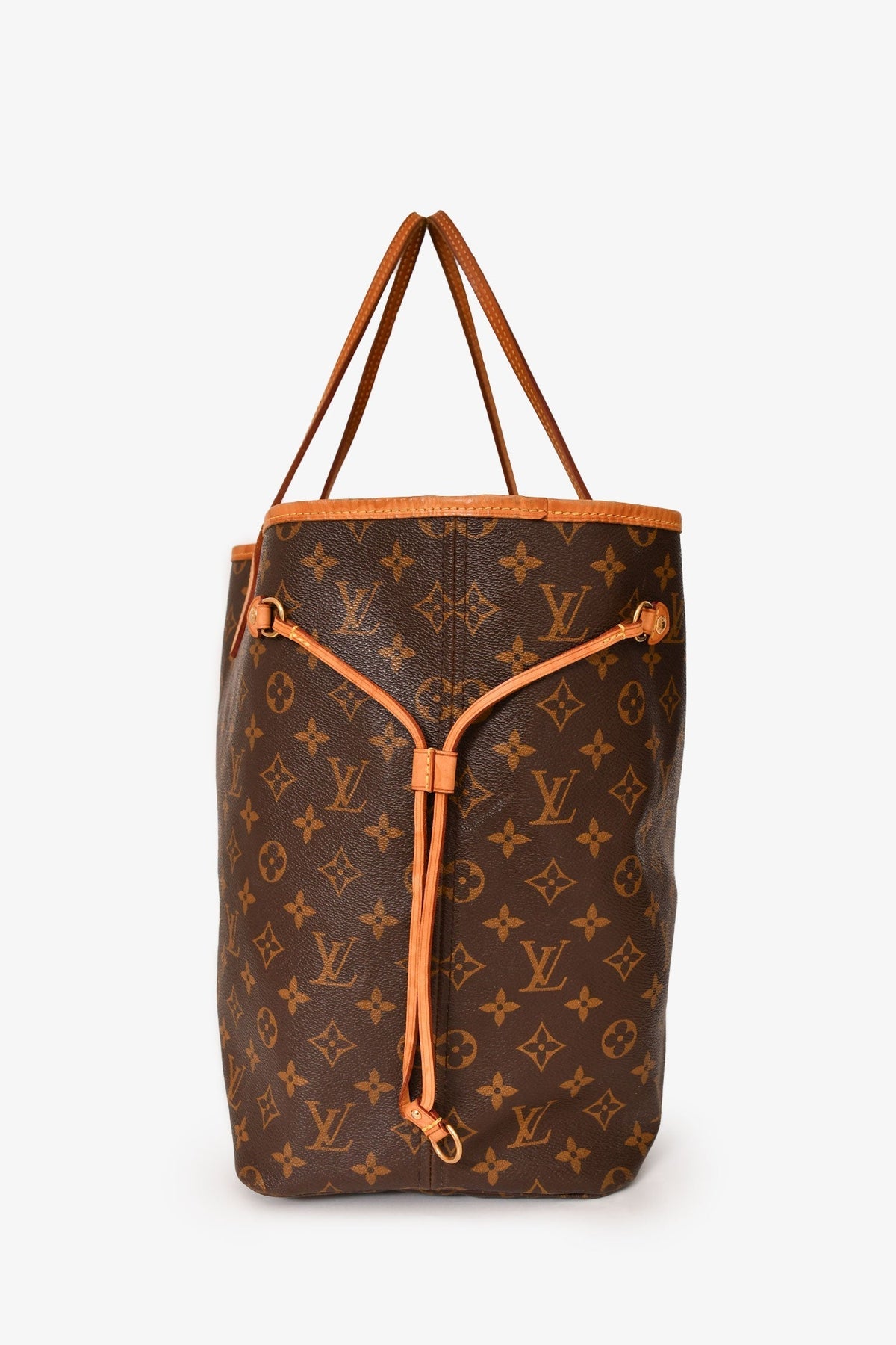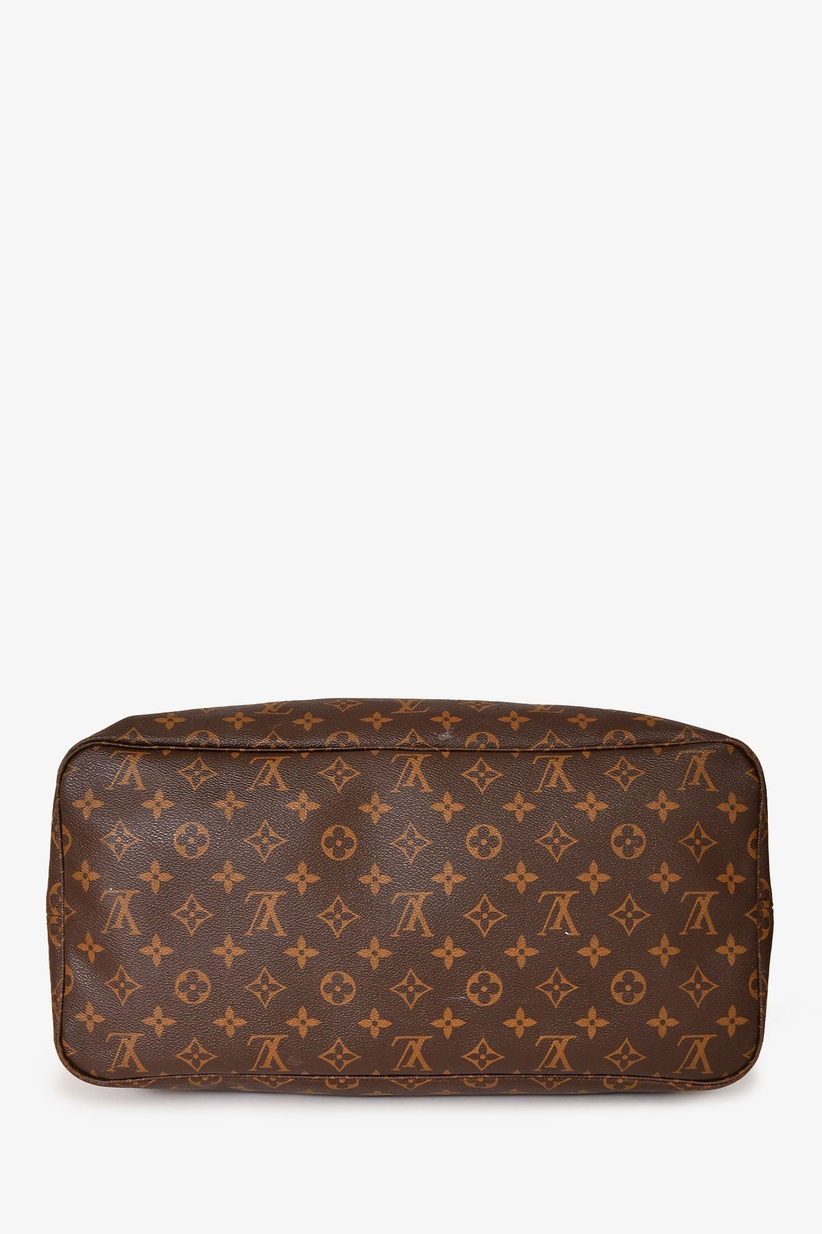 Louis Vuitton 2014 Monogram Neverfull GM Tote with Initials. Top lobster clasp closure. Single interior zip pocket. Beige textile interior lining. Gold-toned hardware. Tonal stitching.